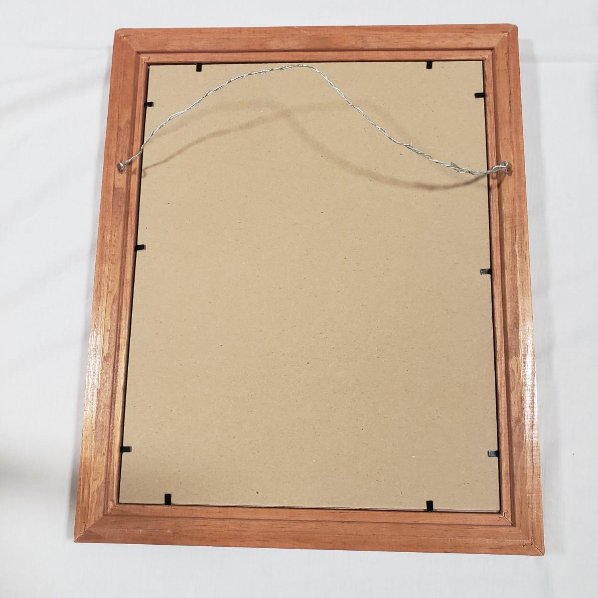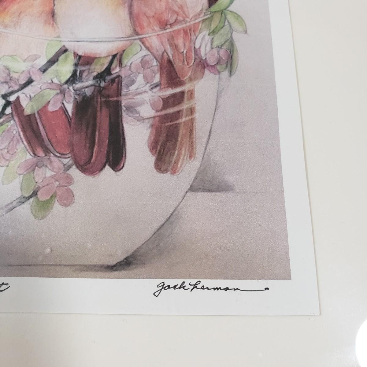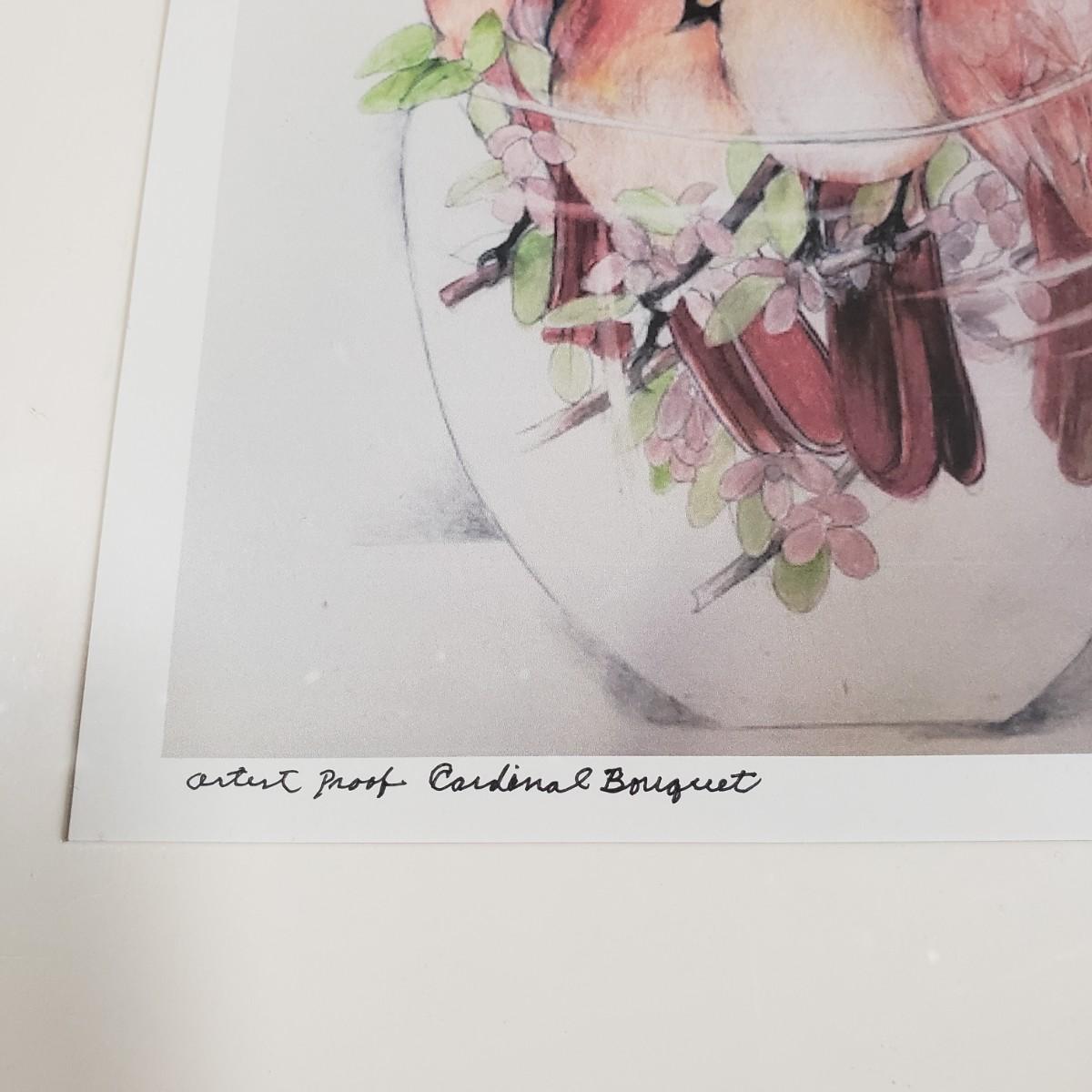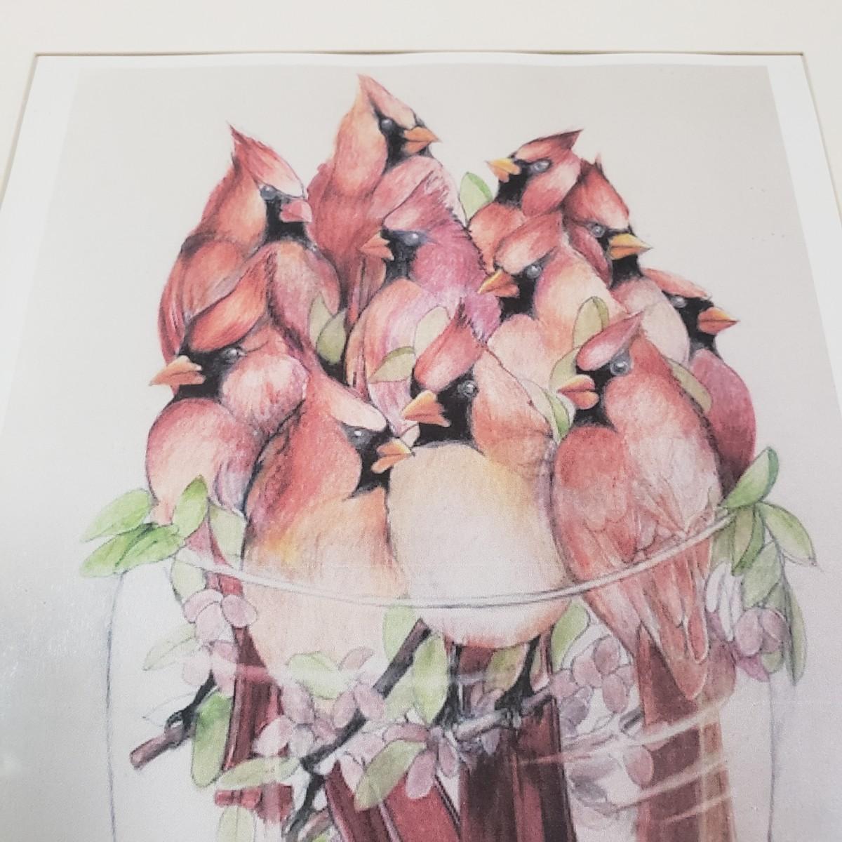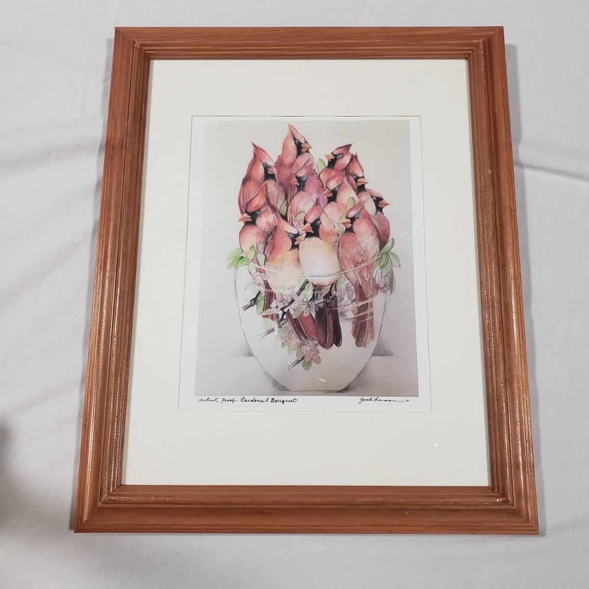 This wooden framed behind glass is an "artist's proof" titled "Cardinal Bouquet" by Jock Ferman. The frame measures 13" x 16".