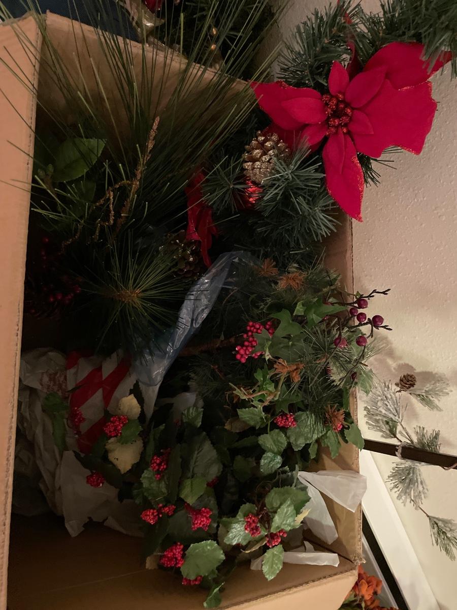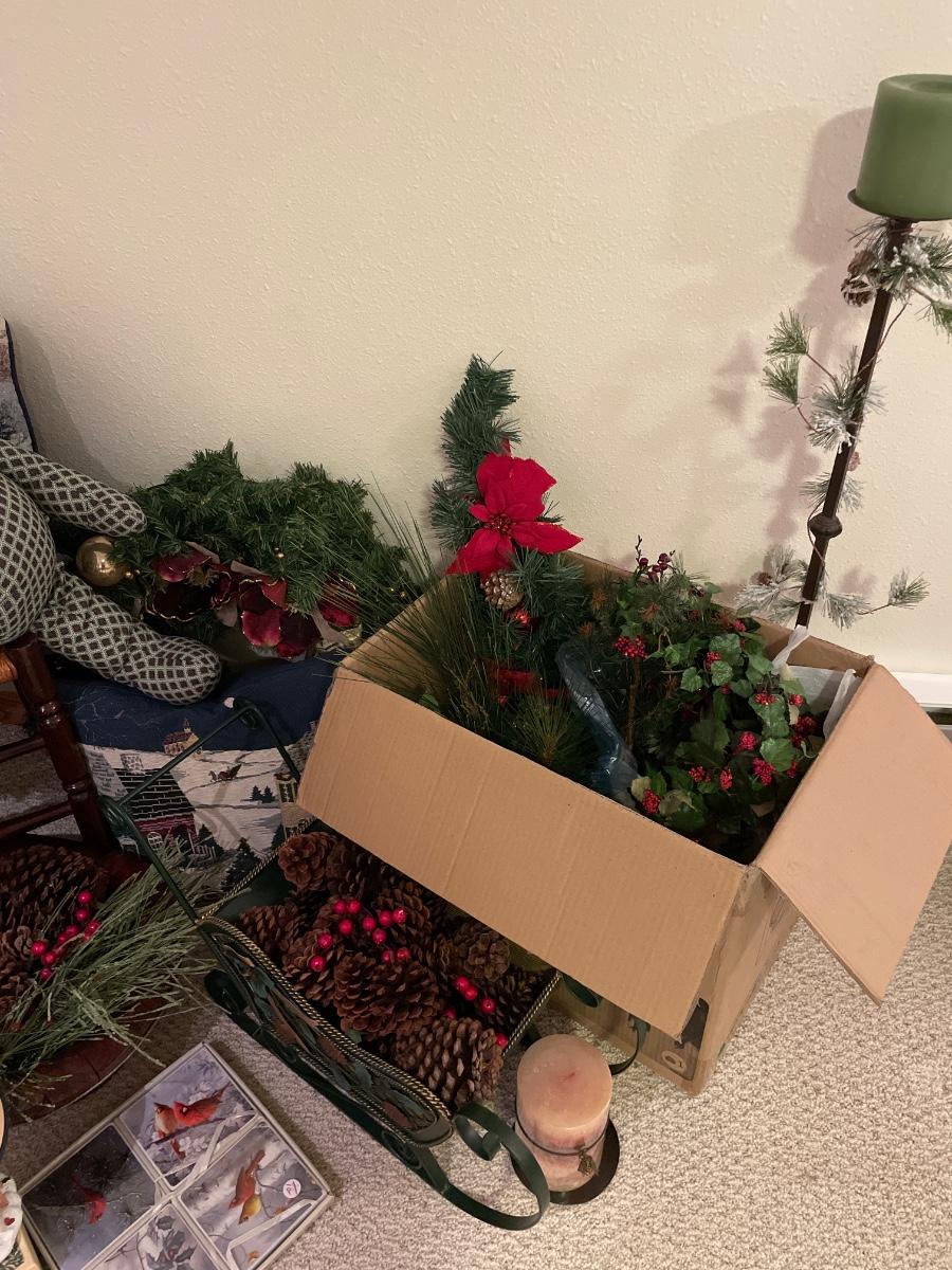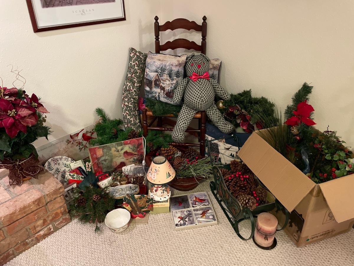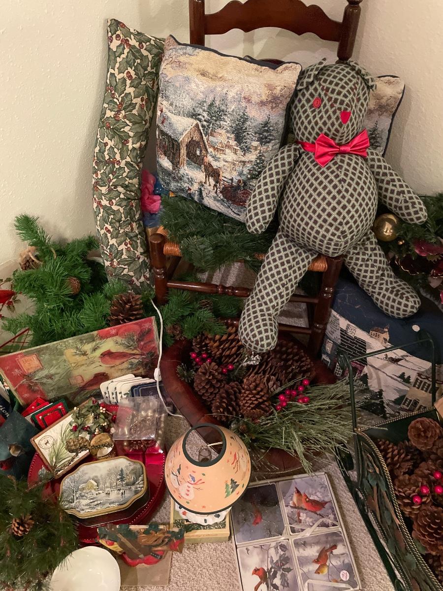 Many Christmas decor items and chair