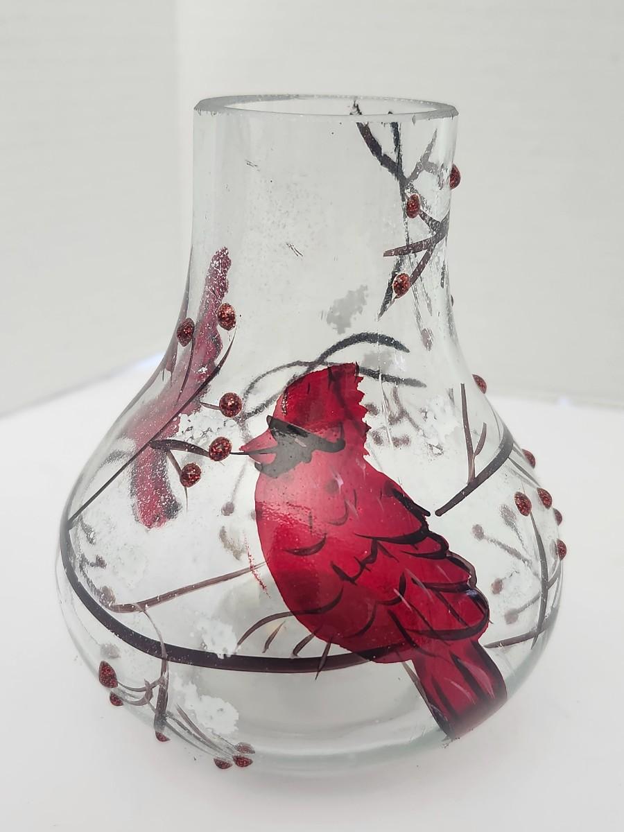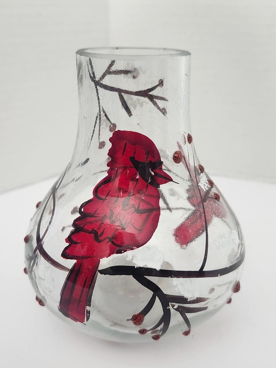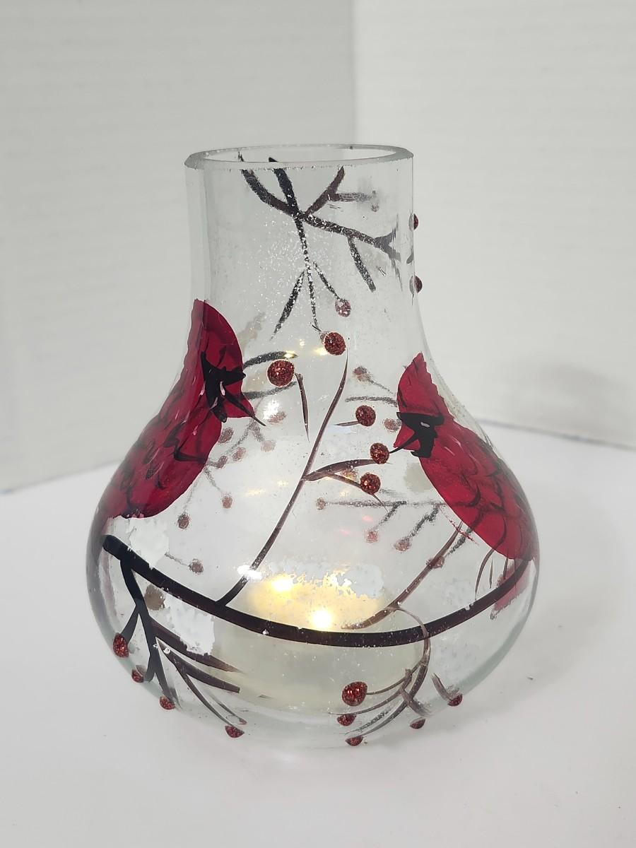 Decorative clear glass vase featuring hand painted red cardinals perched among winter branches with berry accents and light glitter detailing. Rounded bulb form with narrow neck, designed to hold a candle or small string light inside for ambient glow. Marked Made in China on the underside with an integrated on off switch in the base. Intended as decorative holiday decor rather than functional tableware. Works well as seasonal display, centerpiece accent, or shelf decor during winter and Christmas months. Suitable for indoor use only.