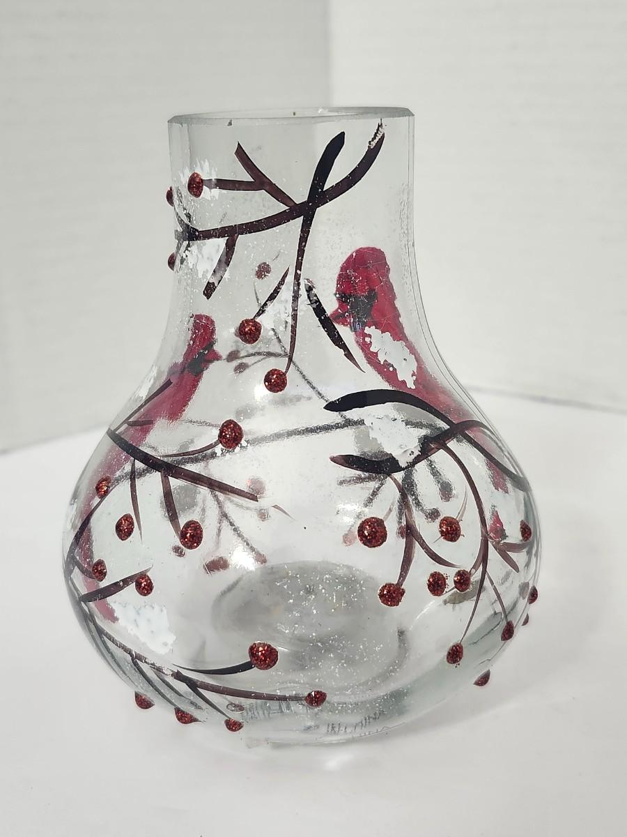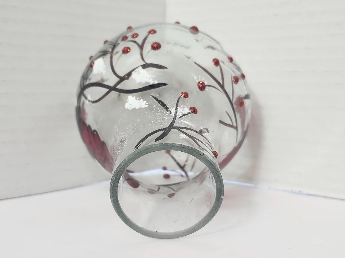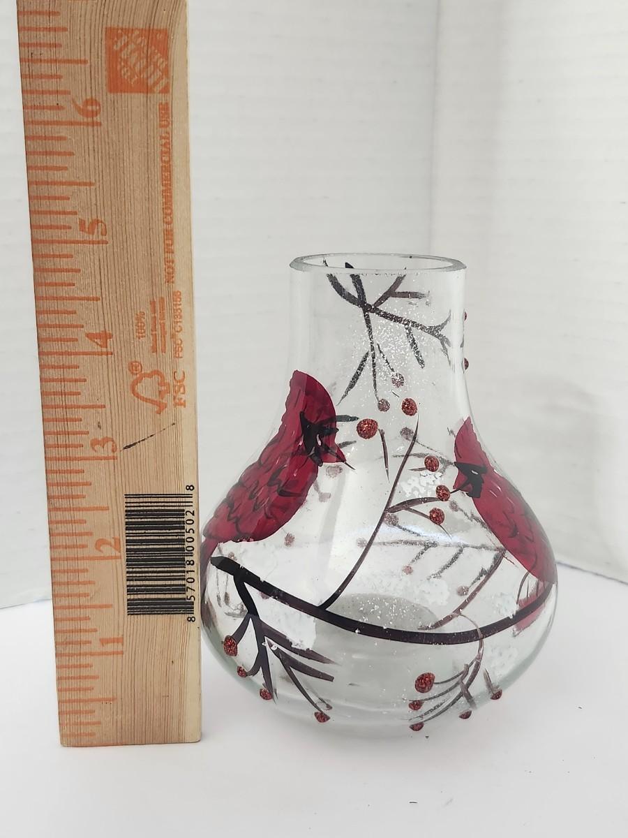 Decorative clear glass vase featuring hand painted red cardinals perched among winter branches with berry accents and light glitter detailing. Rounded bulb form with narrow neck, designed to hold a candle or small string light inside for ambient glow. Marked Made in China on the underside with an integrated on off switch in the base. Intended as decorative holiday decor rather than functional tableware. Works well as seasonal display, centerpiece accent, or shelf decor during winter and Christmas months. Suitable for indoor use only.