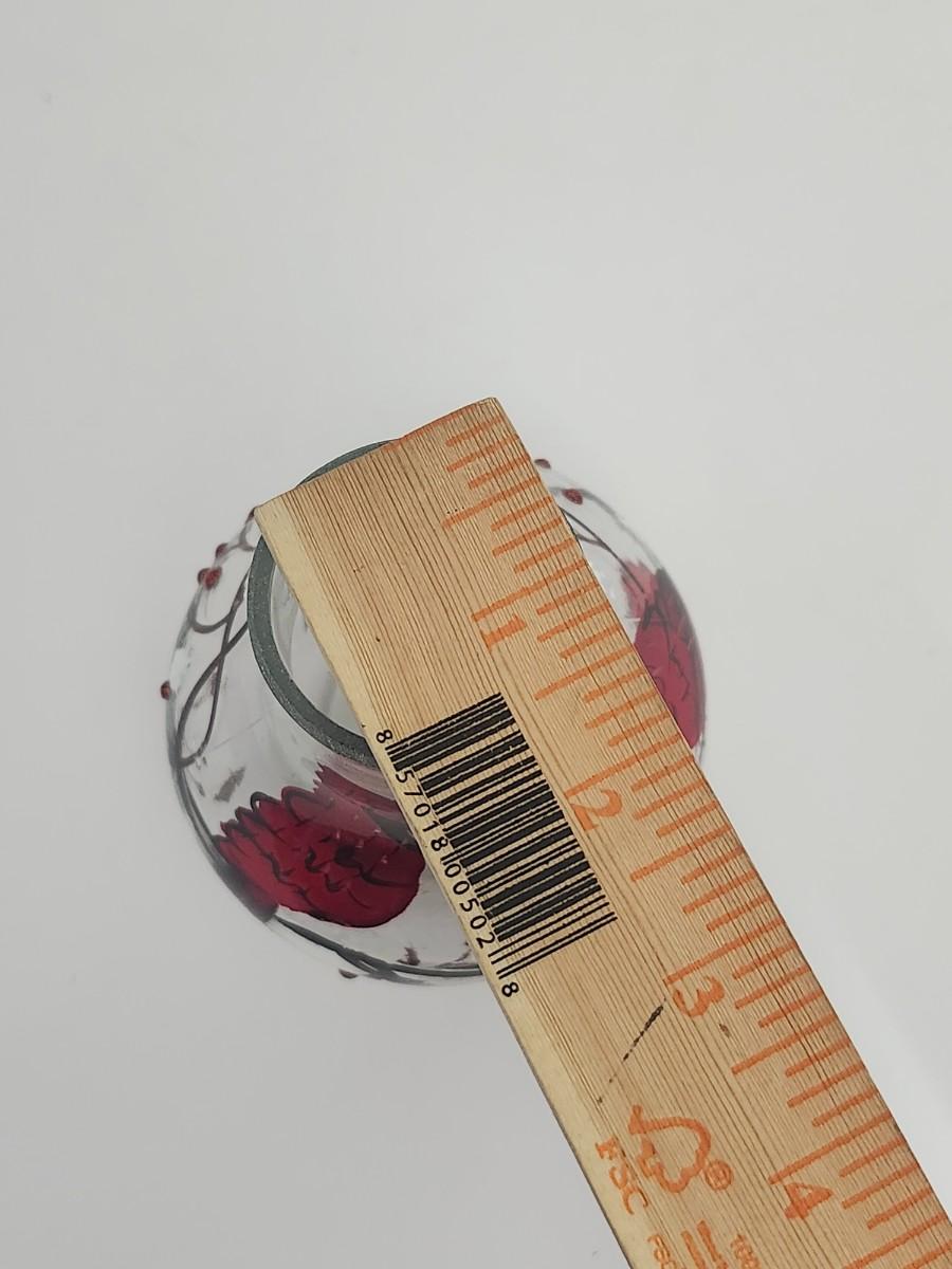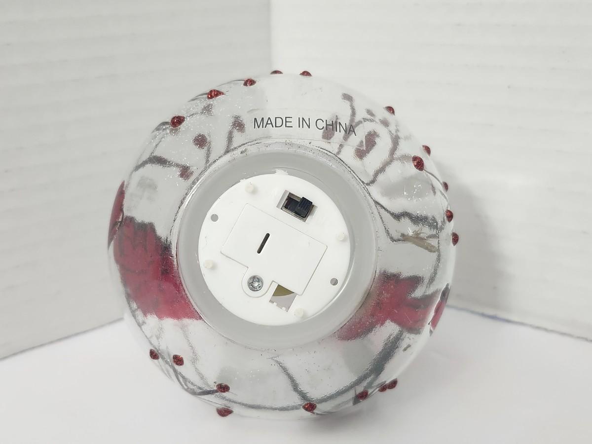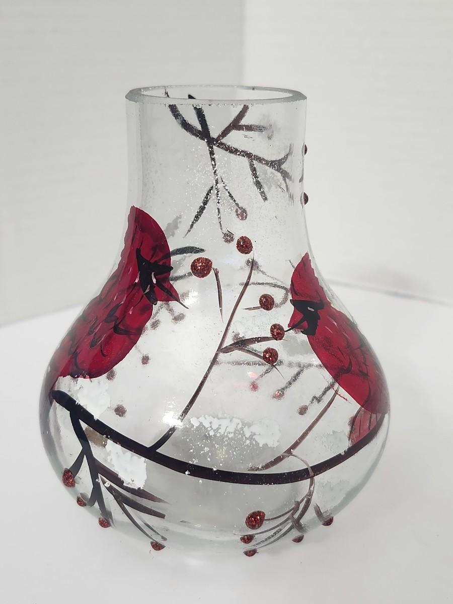 Decorative clear glass vase featuring hand painted red cardinals perched among winter branches with berry accents and light glitter detailing. Rounded bulb form with narrow neck, designed to hold a candle or small string light inside for ambient glow. Marked Made in China on the underside with an integrated on off switch in the base. Intended as decorative holiday decor rather than functional tableware. Works well as seasonal display, centerpiece accent, or shelf decor during winter and Christmas months. Suitable for indoor use only.