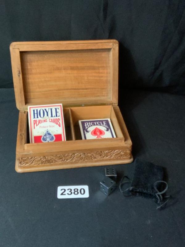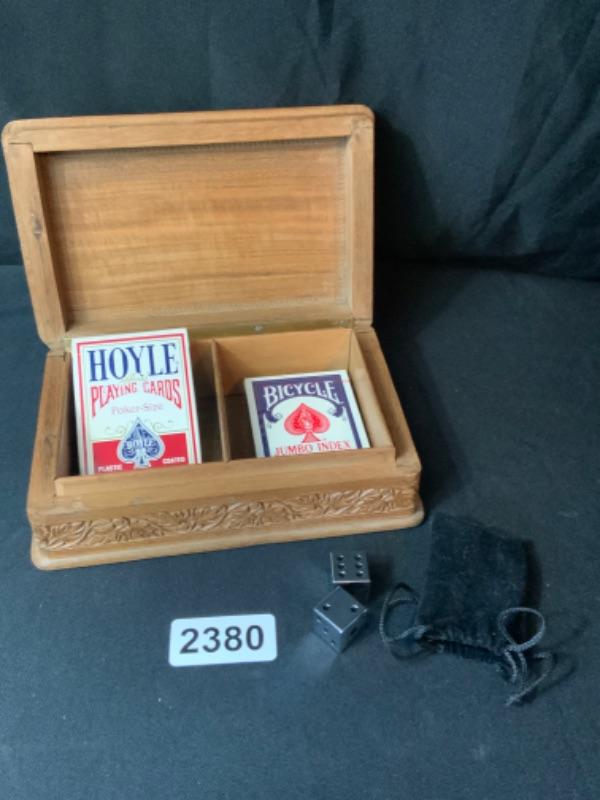 Cards in wood box and metal dice  Lot 2380