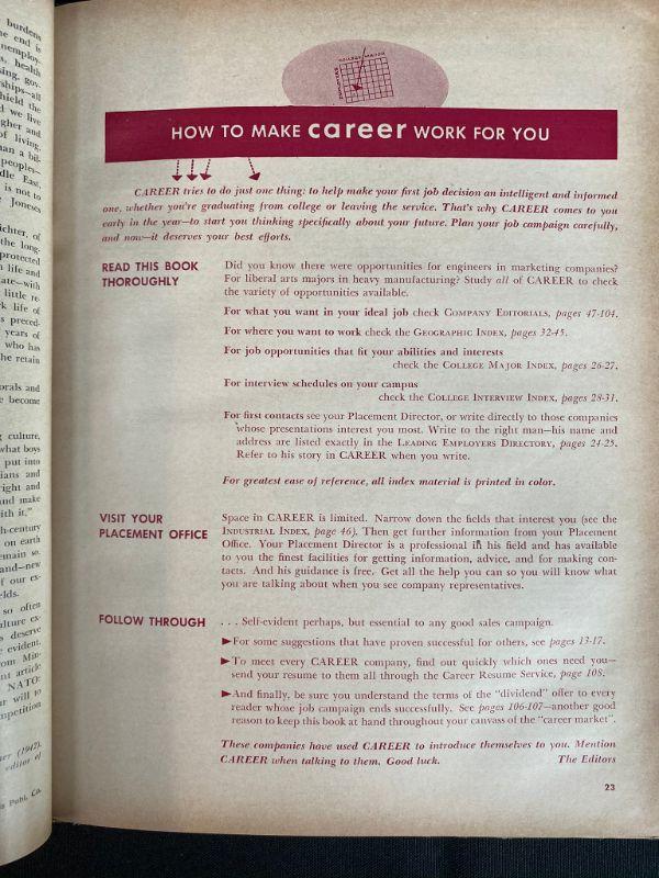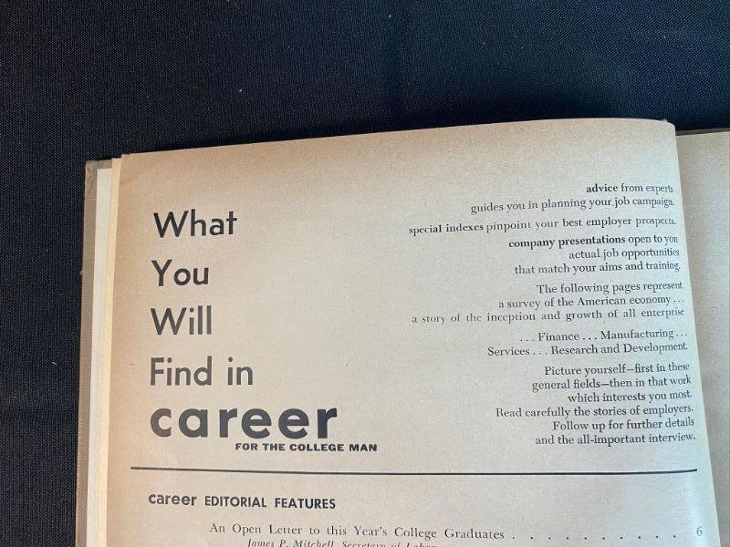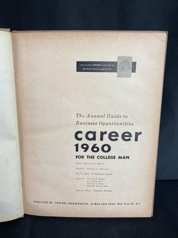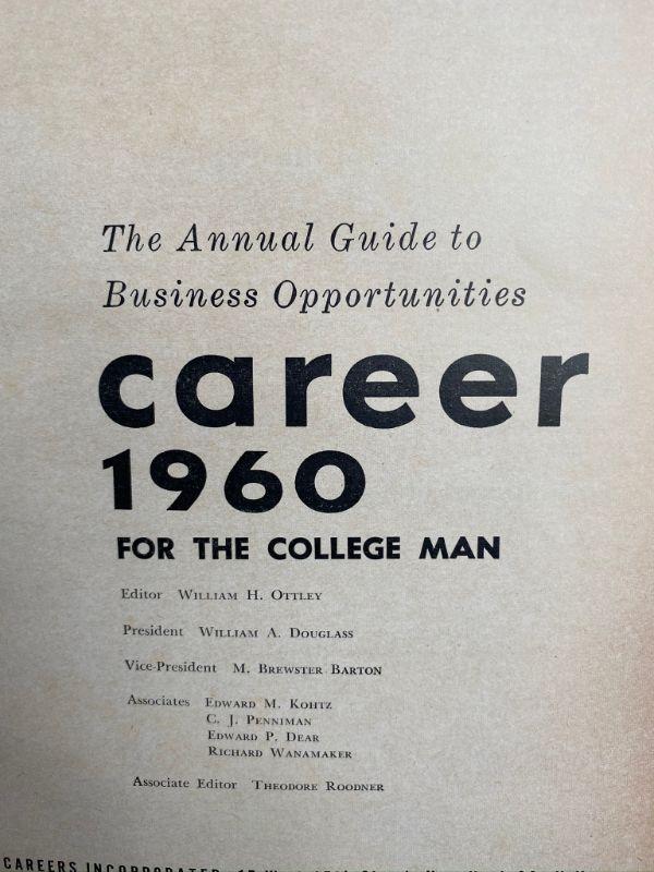 Vintage Career Guide "Career for the College Man" 1960. This was an annual guide put out to help with career path ideas and company info. Fair condition. There is writing on the cover.