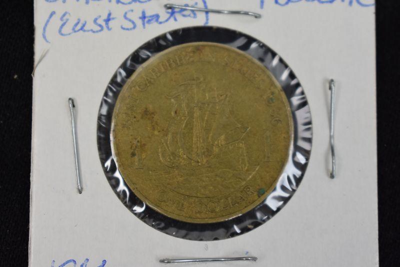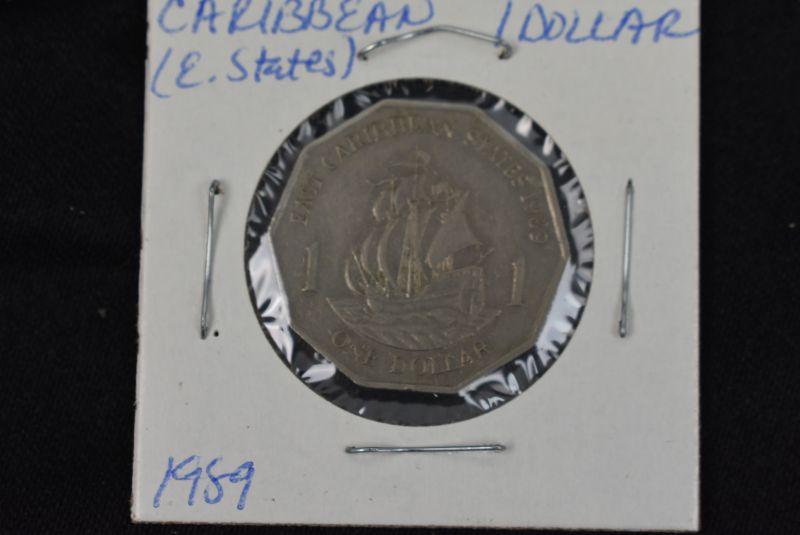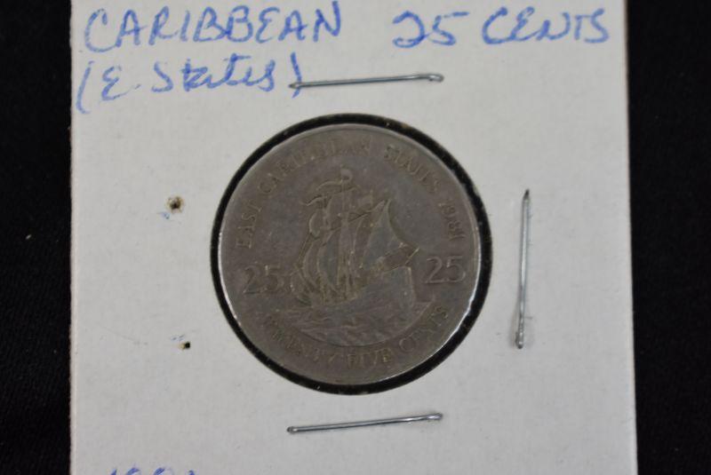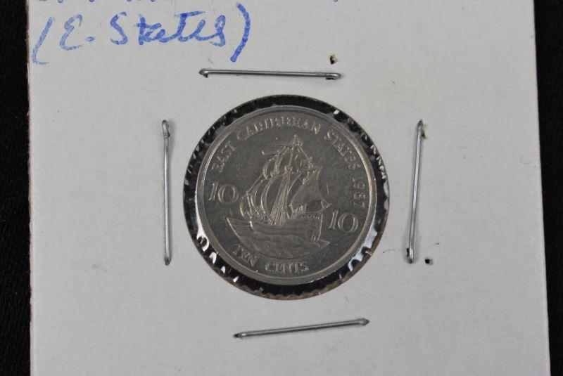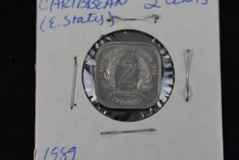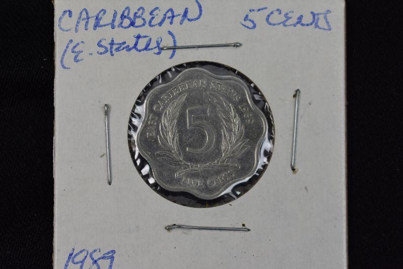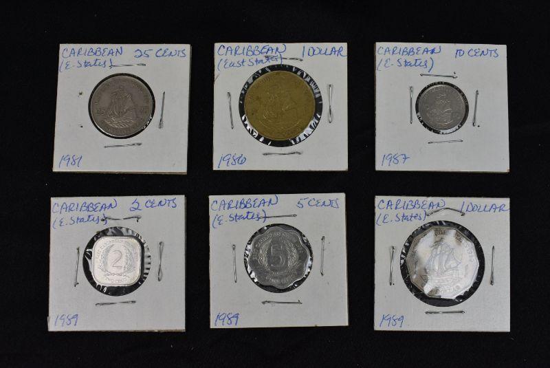 1981 Caribbean East States 25 Cents, 1986 Caribbean East States 1 Dollar, 1987 Caribbean East States 10 Cents, 1989 Caribbean East States 2 Cents, 1989 Caribbean East States 5 States, and 1989 Caribbean East States 1 Dollar