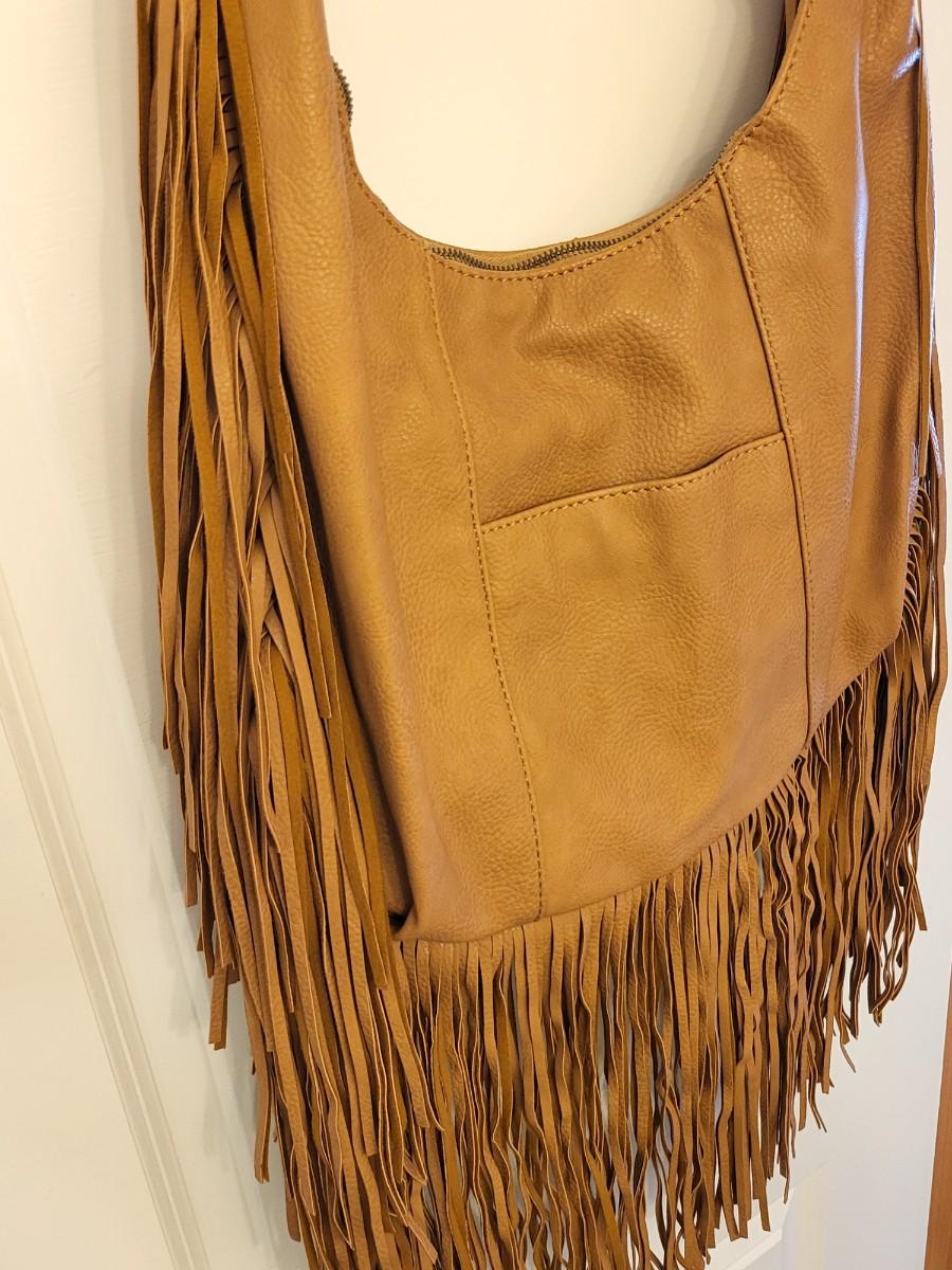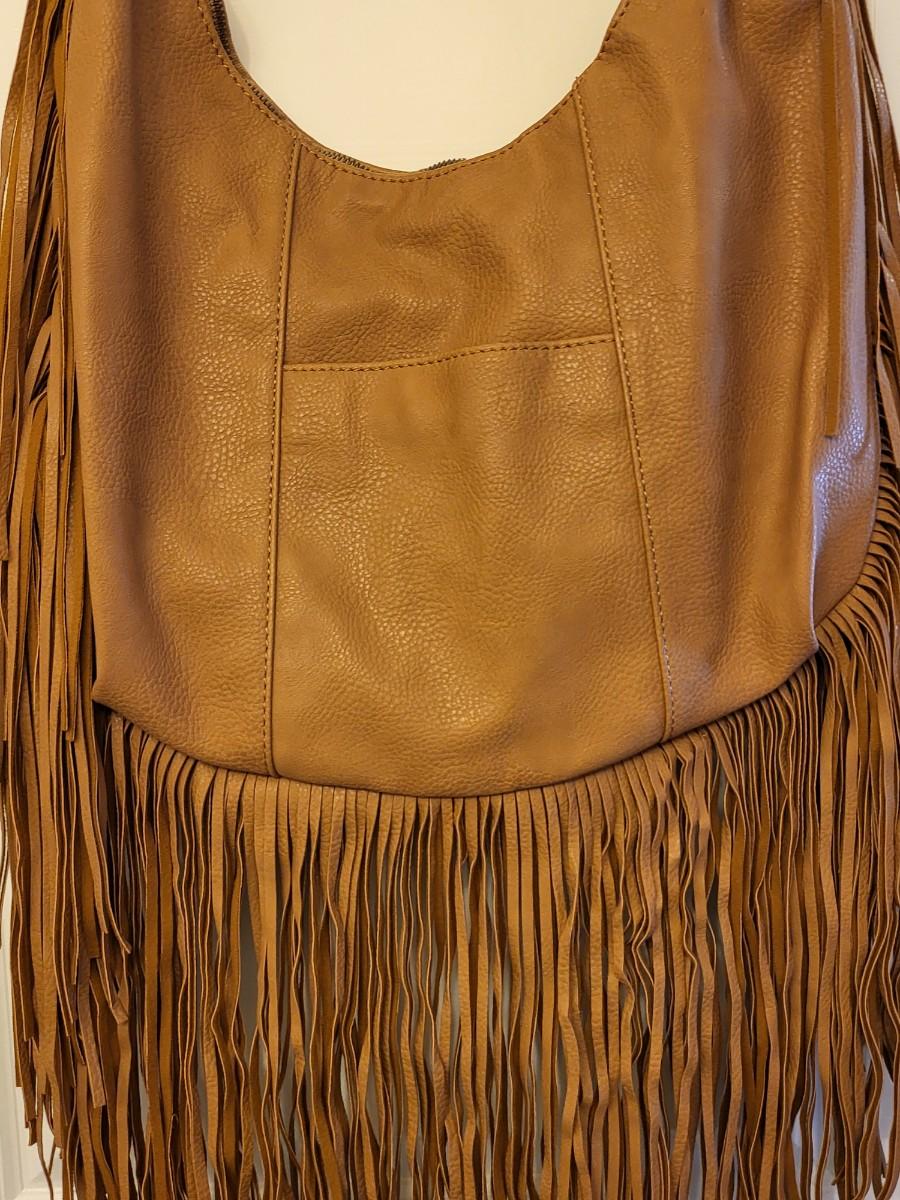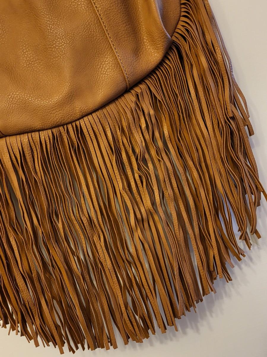 Light caramel brown, fringe edges and bottom. Lace-look satin lining. Measures 14" long x 12" tall an an 11" shoulder strap length.