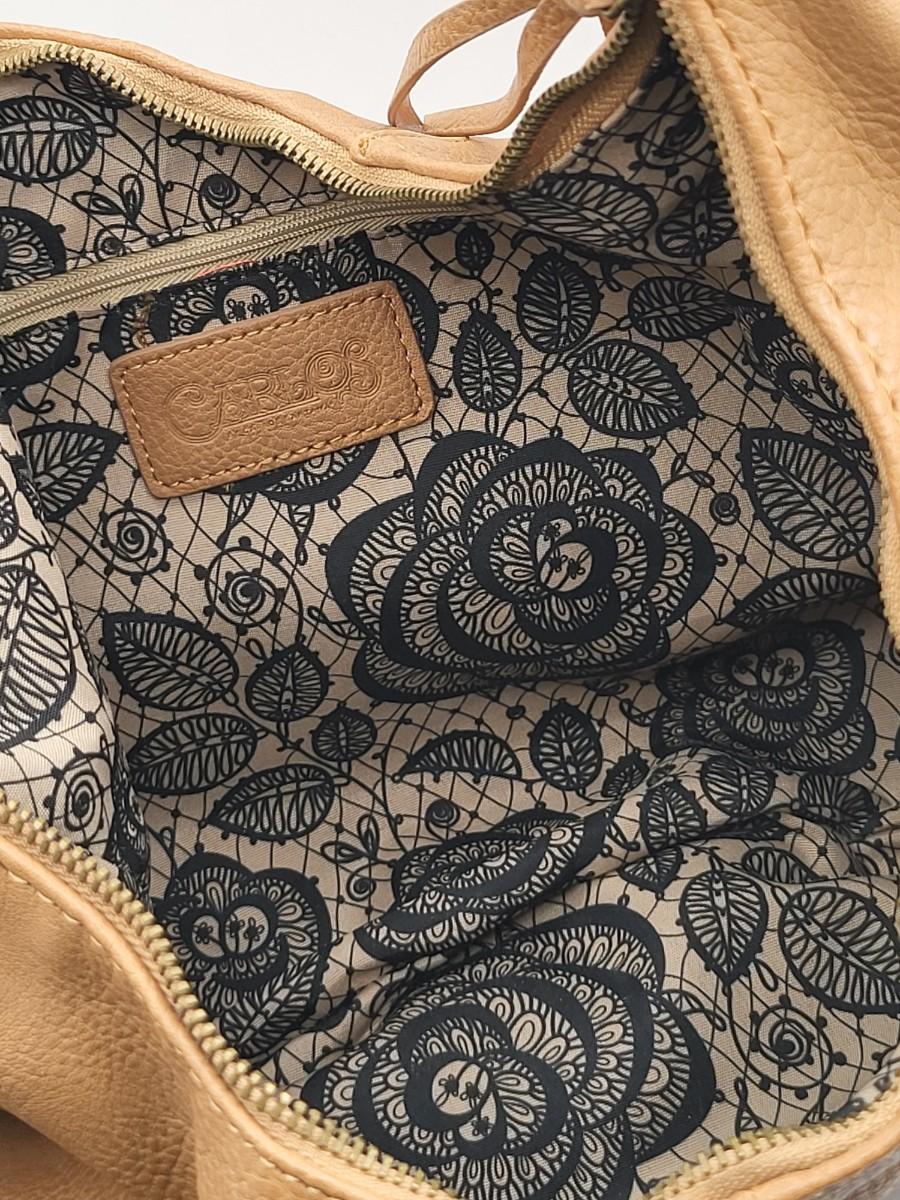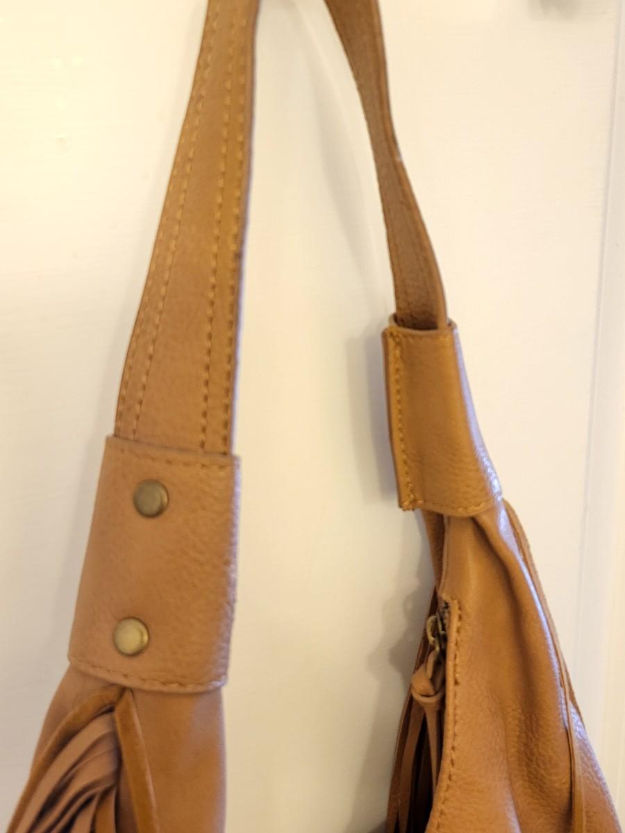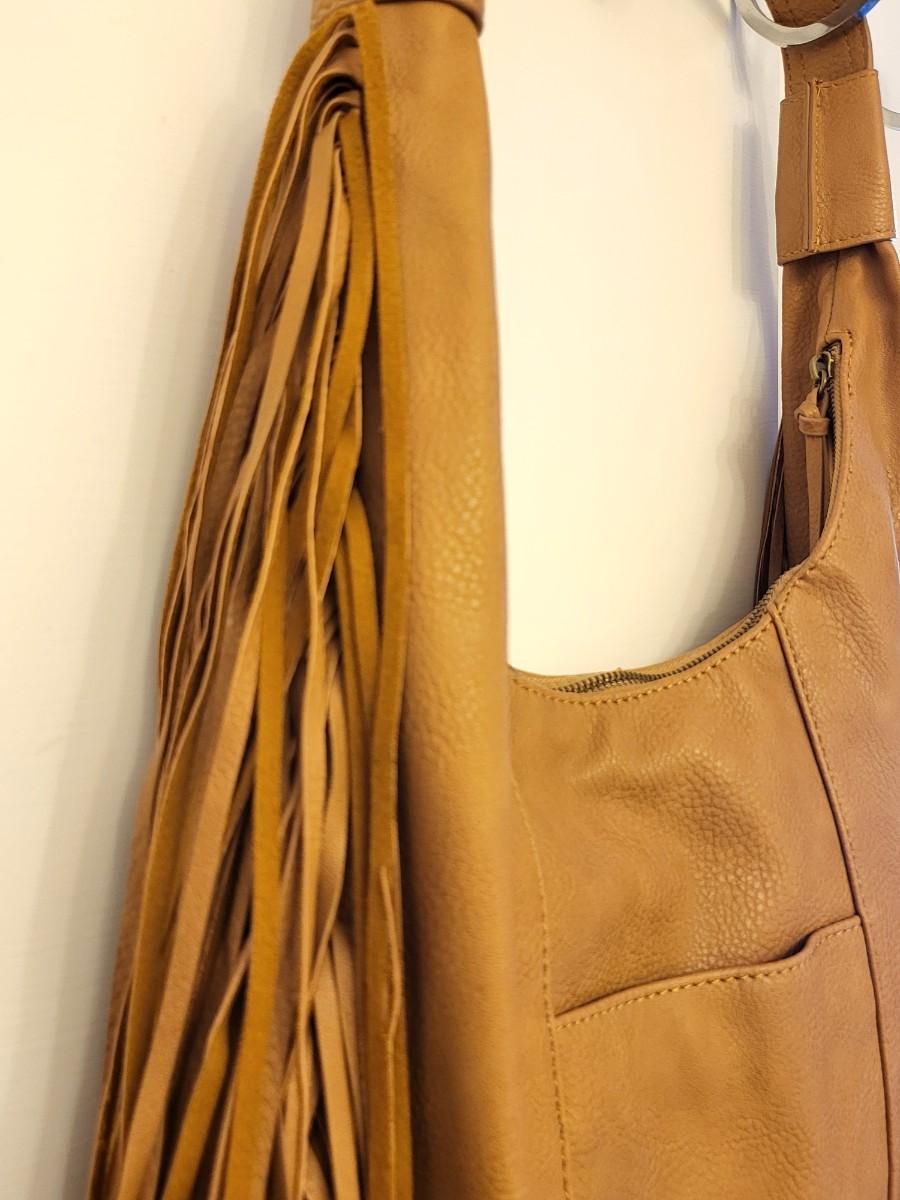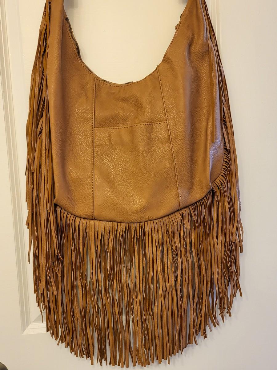 Light caramel brown, fringe edges and bottom. Lace-look satin lining. Measures 14" long x 12" tall an an 11" shoulder strap length.