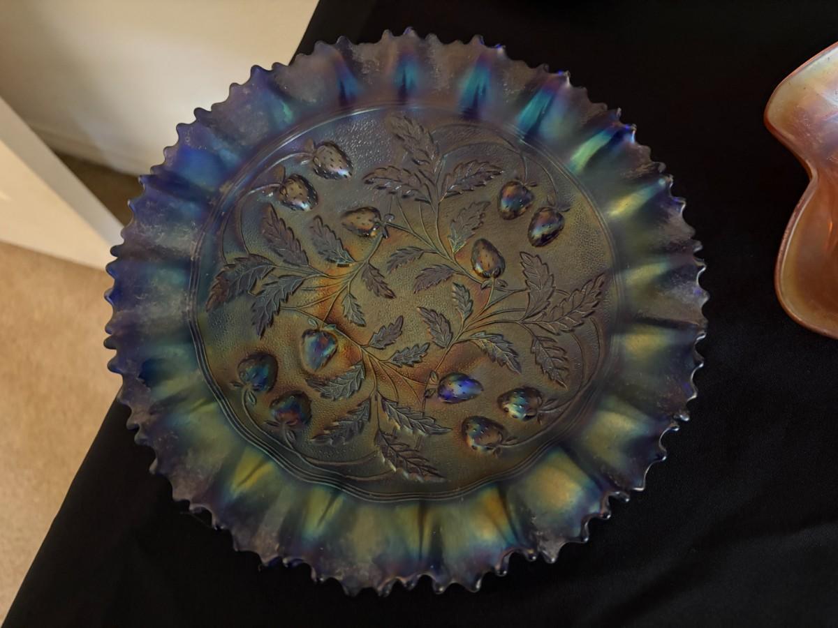 Carnival Amethyst strawberry pattern ruffled bowl, Star of David and Bows carnival glass bowl
