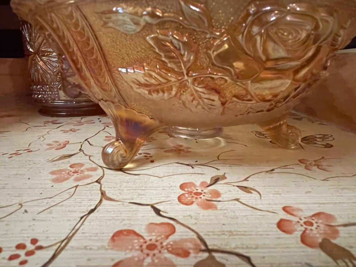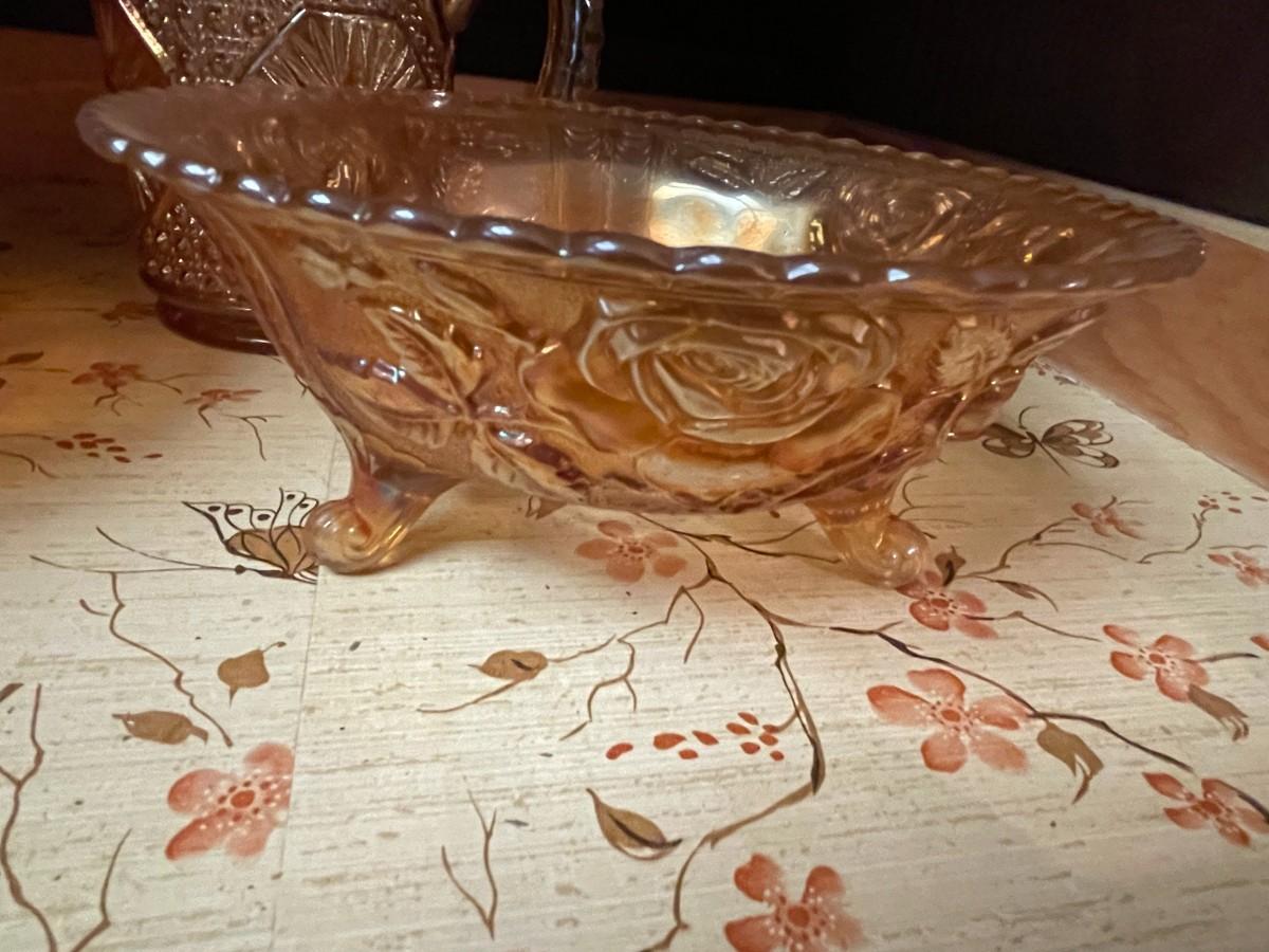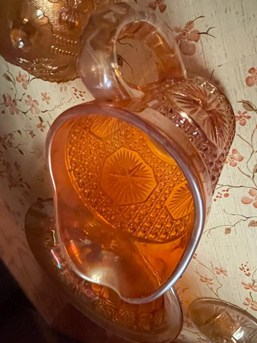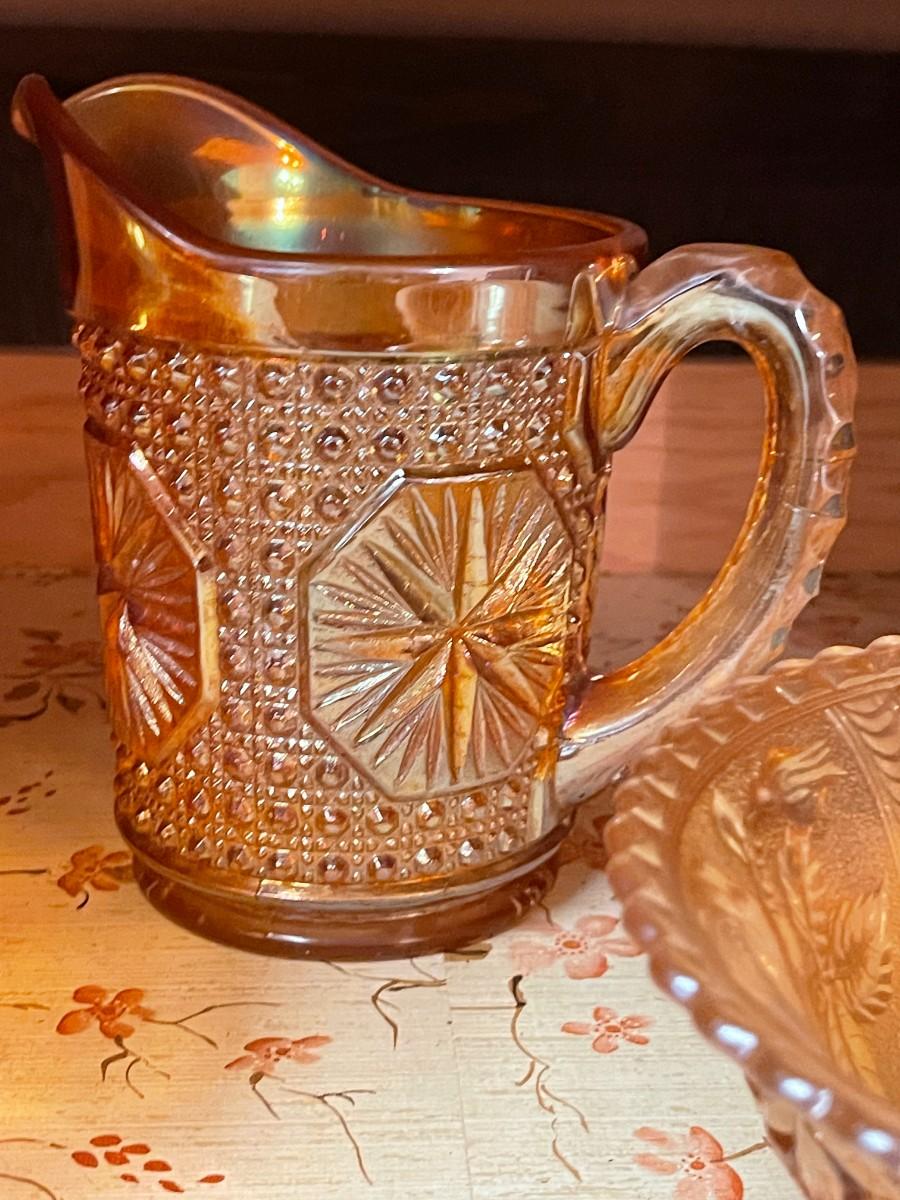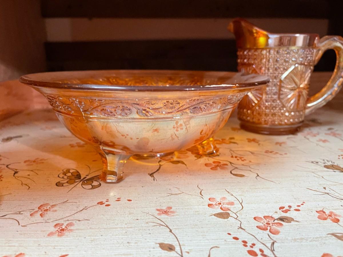 Imperial Glass "Morning Glory" Marigold Carnival Vase, Floral & Optic Round Flared Bowl, Medallion Pitcher, and another bowl that may be Footed Windmill Bowl. 5 pieces total.