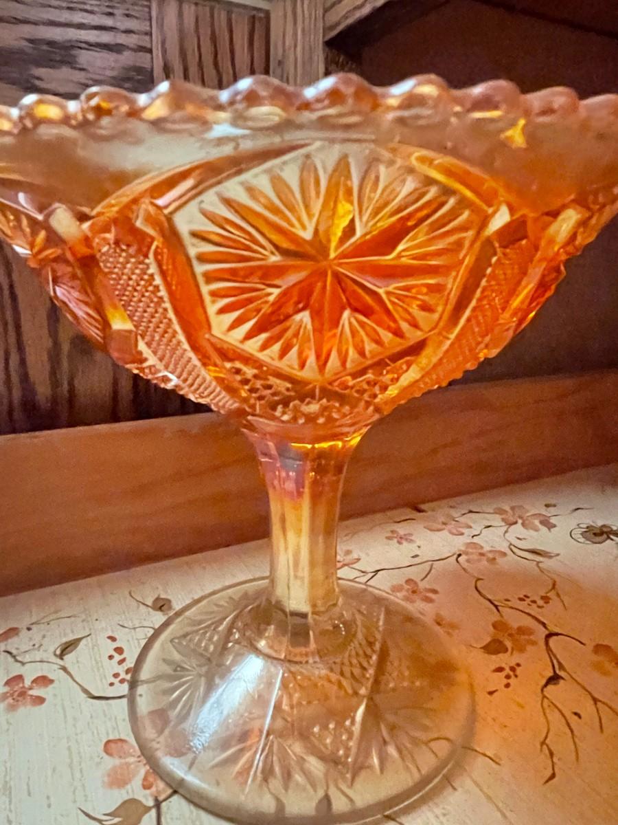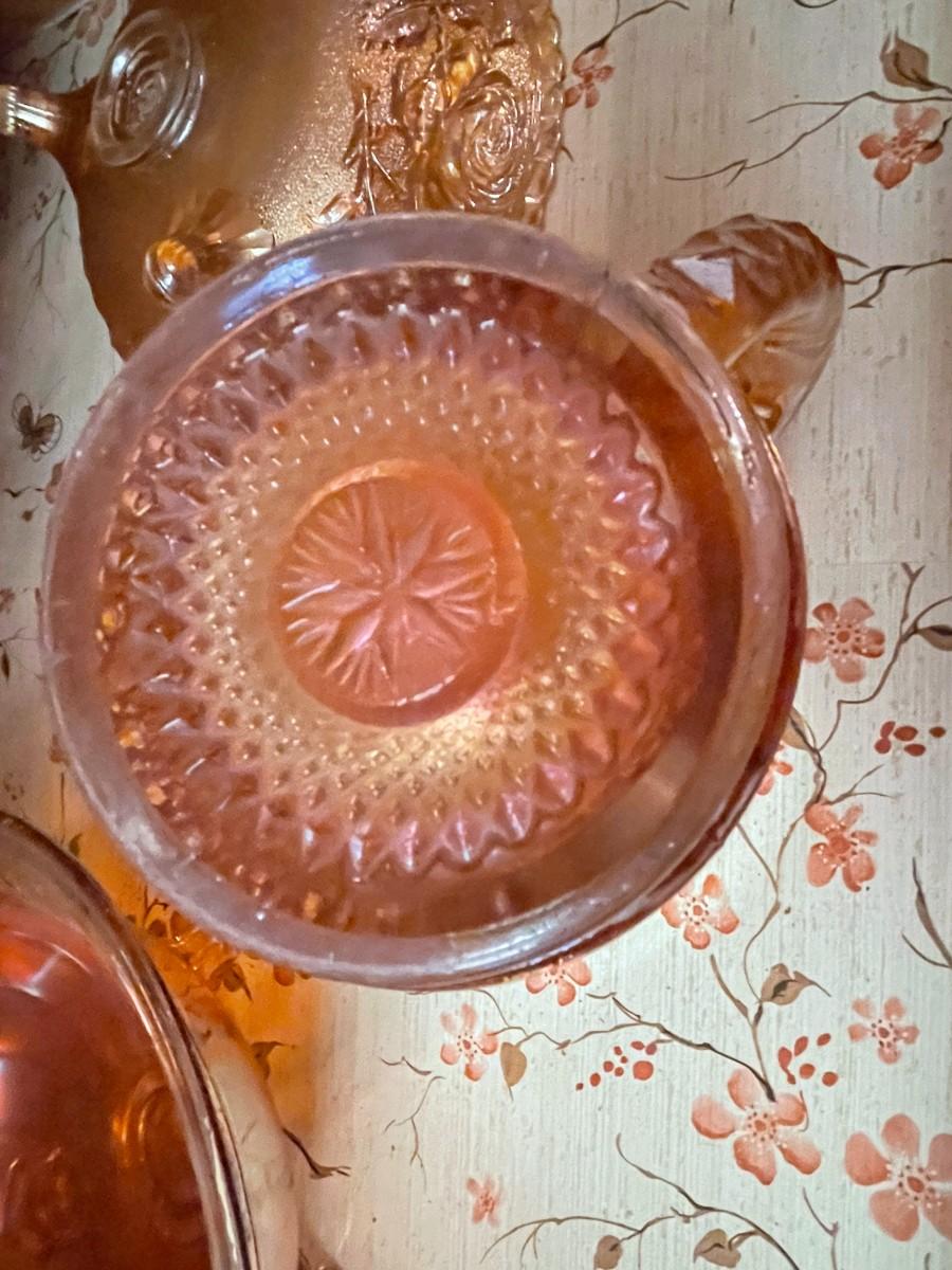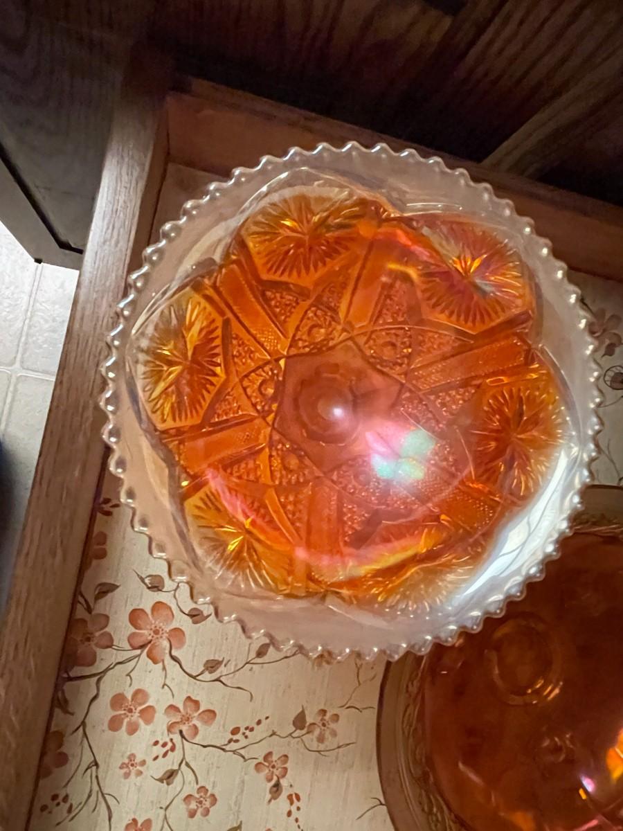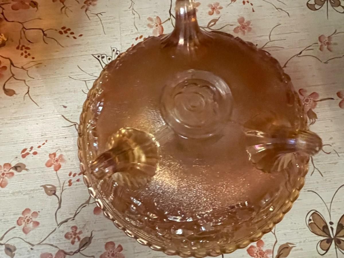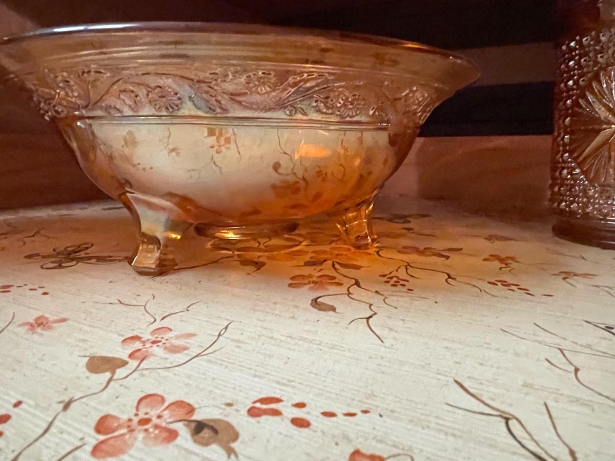 Imperial Glass "Morning Glory" Marigold Carnival Vase, Floral & Optic Round Flared Bowl, Medallion Pitcher, and another bowl that may be Footed Windmill Bowl. 5 pieces total.
