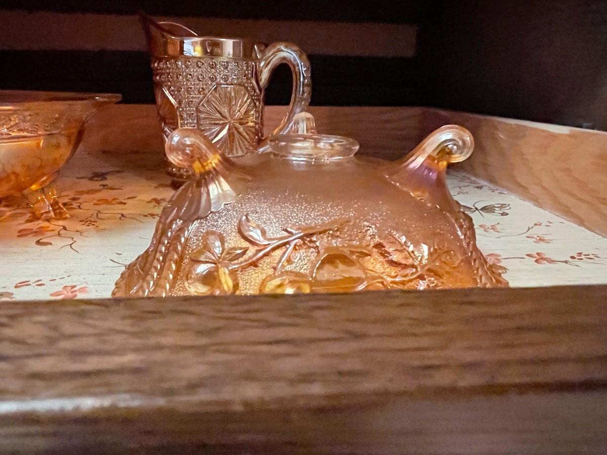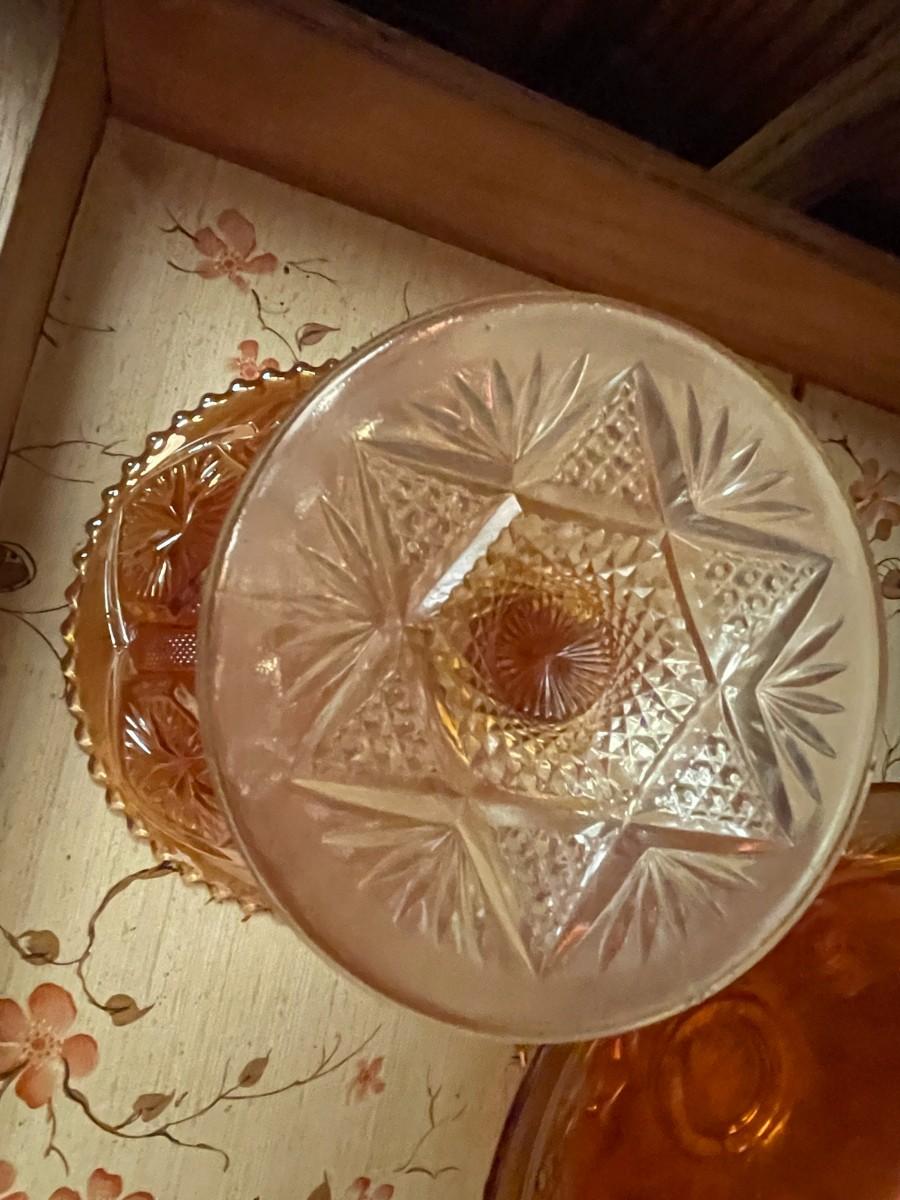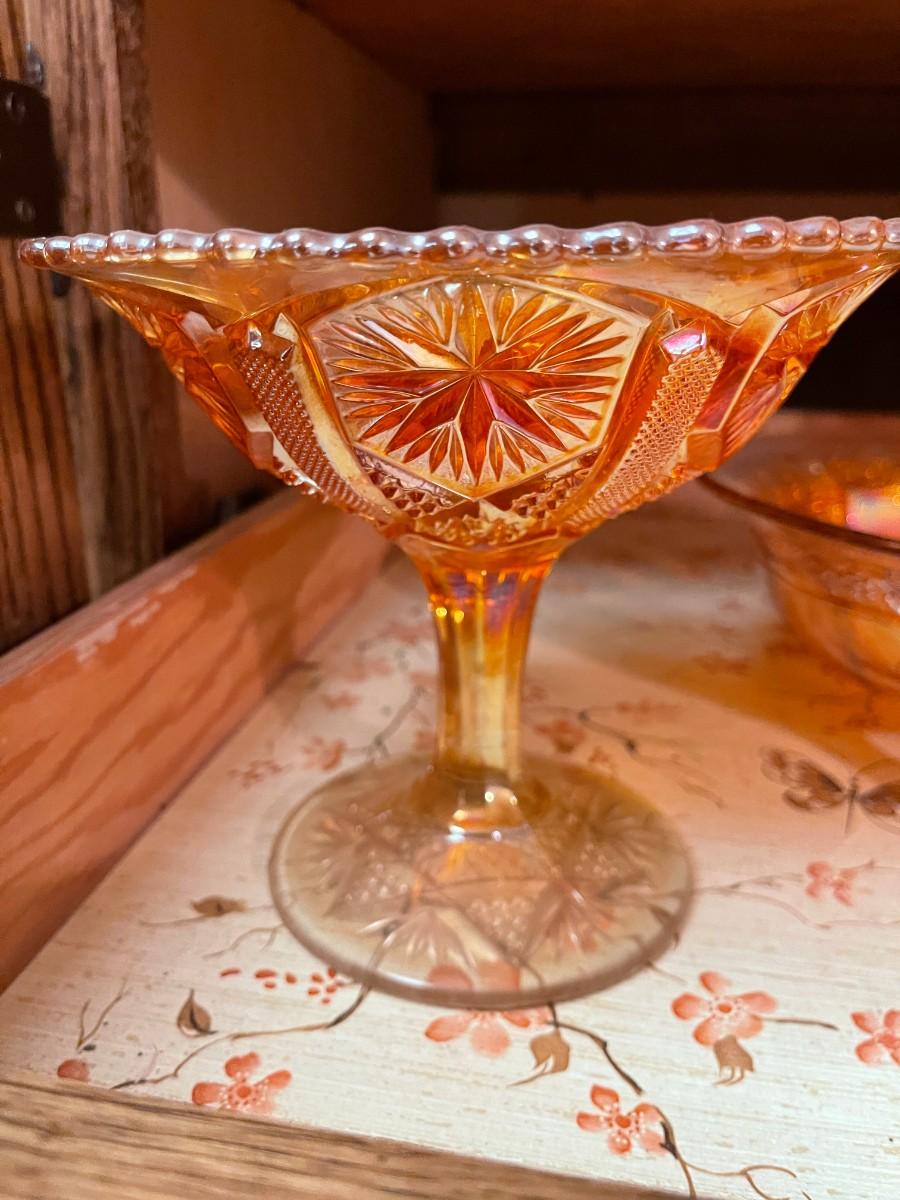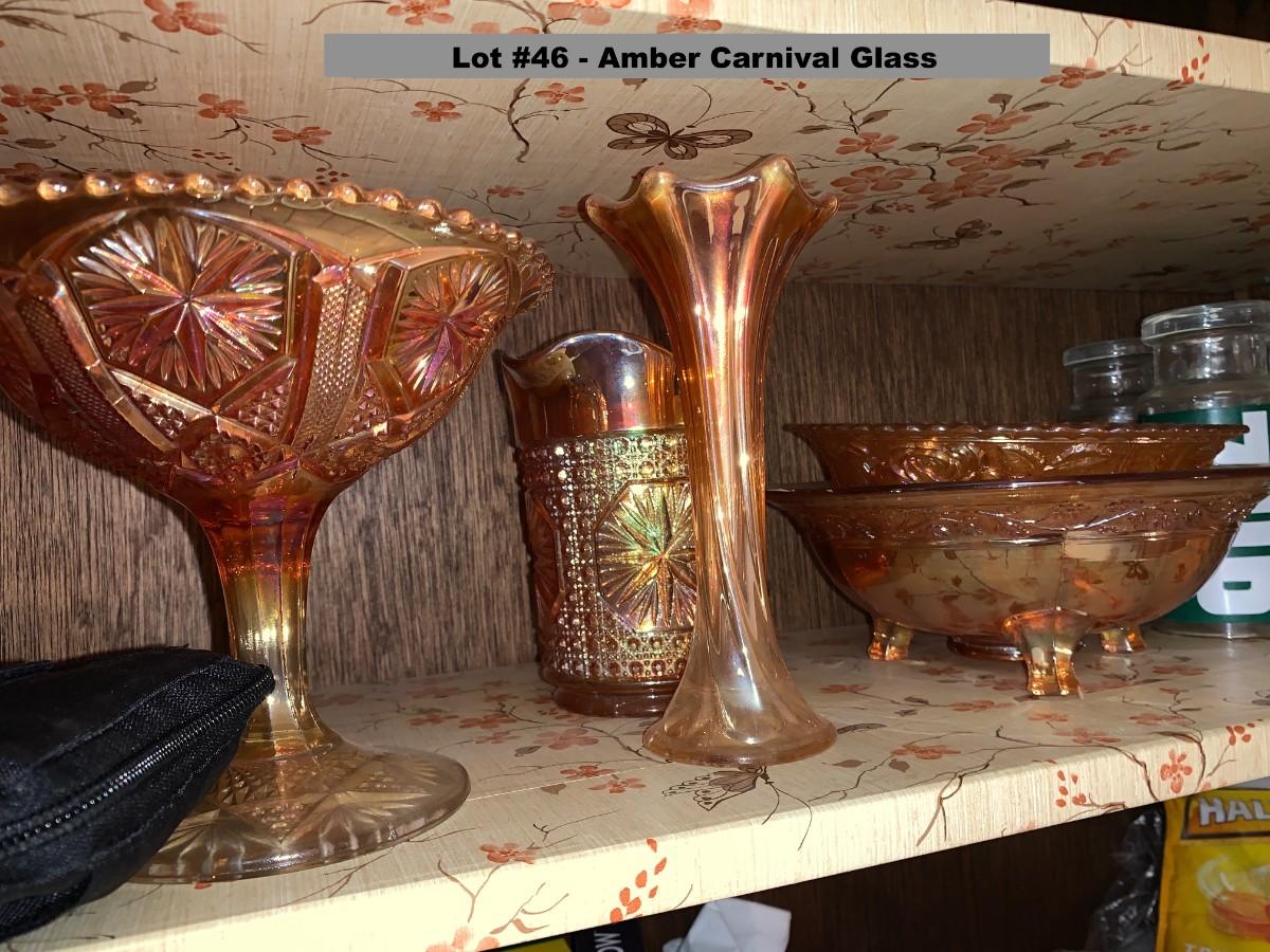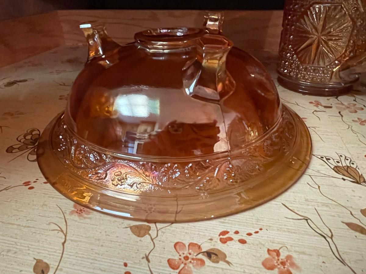 Imperial Glass "Morning Glory" Marigold Carnival Vase, Floral & Optic Round Flared Bowl, Medallion Pitcher, and another bowl that may be Footed Windmill Bowl. 5 pieces total.