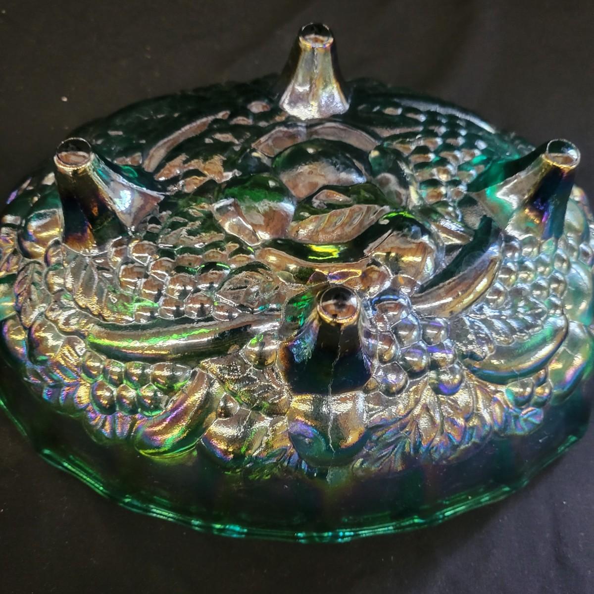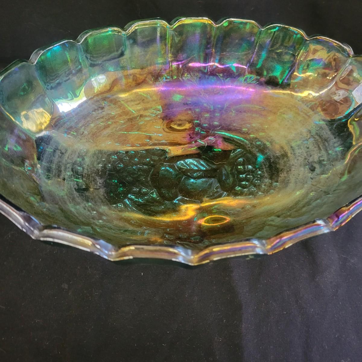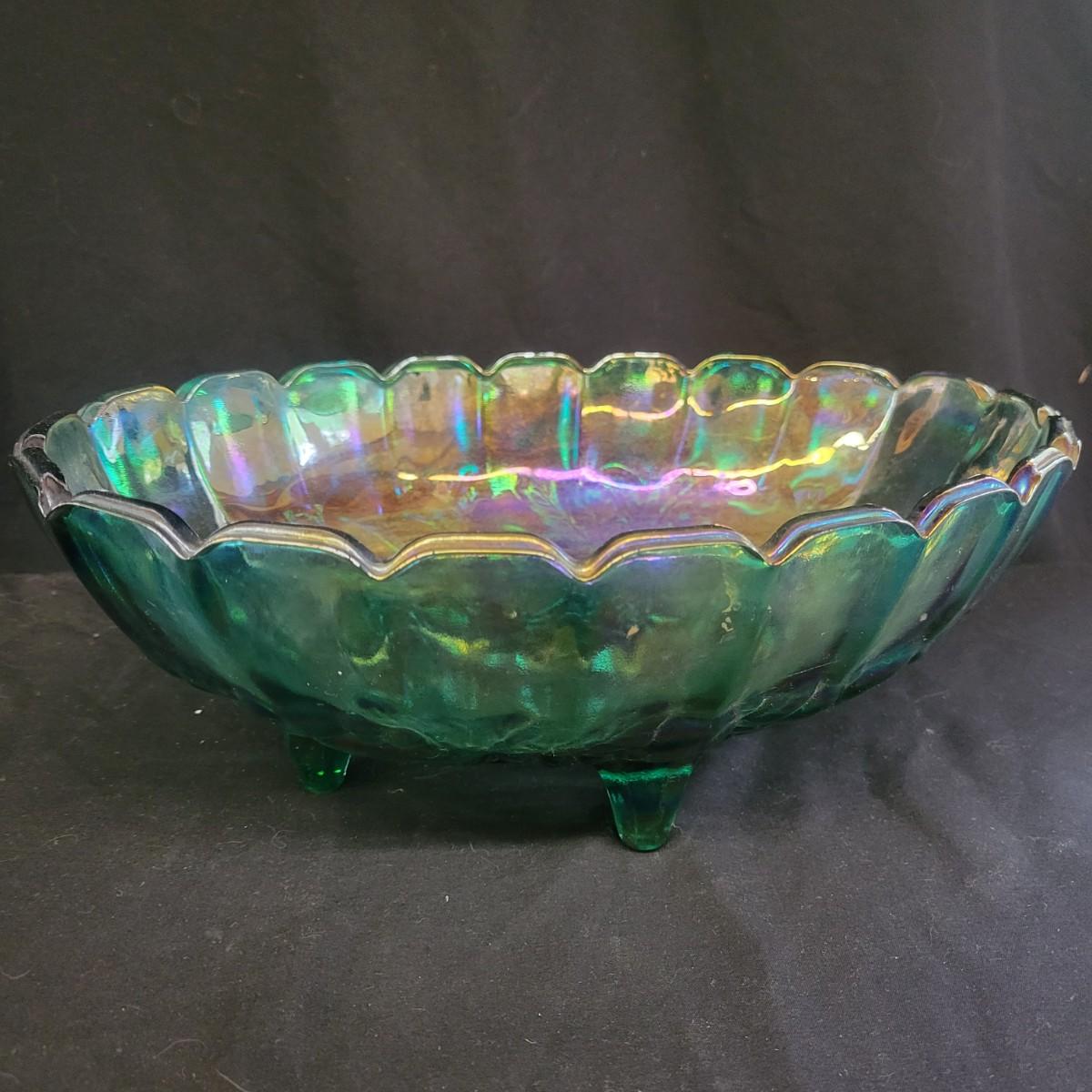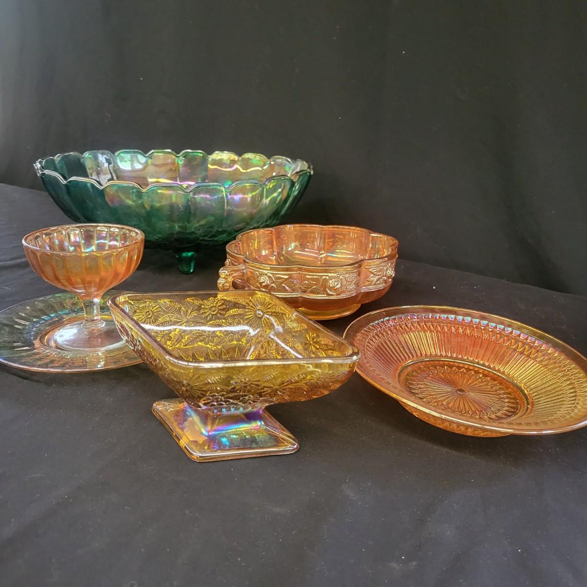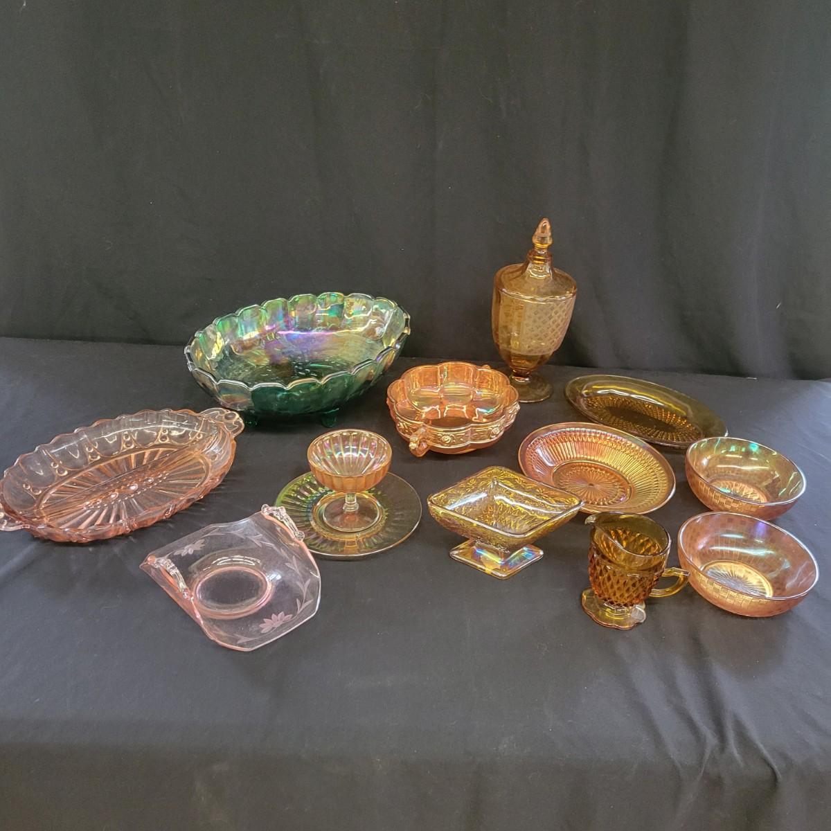 An assortment of over 12 pieces of colored glass, most of which is carnival glass. Largest green bowl pictured last measures approximately 12" x 9" x 4.5"H. The vase with the top has a small chip in its lid. Shipping available. Shipping can be costly. We suggest contacting our preferred local shipping provider, Postage Express, with dimensions and getting an estimate before bidding: (828) 670-5501 or postageexpress@yahoo.com.