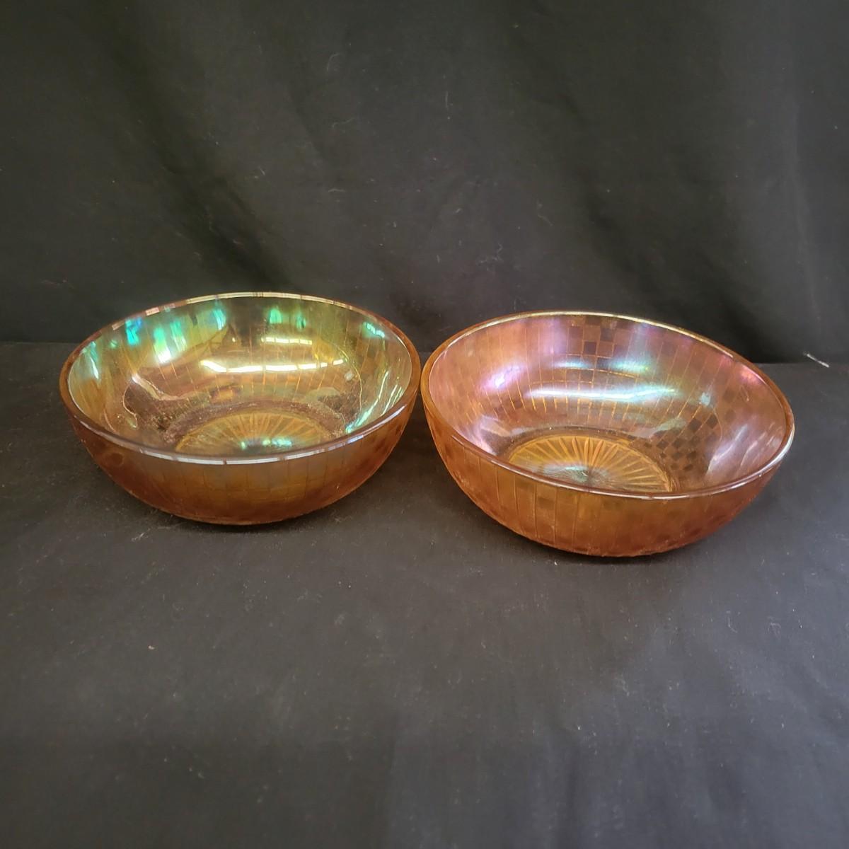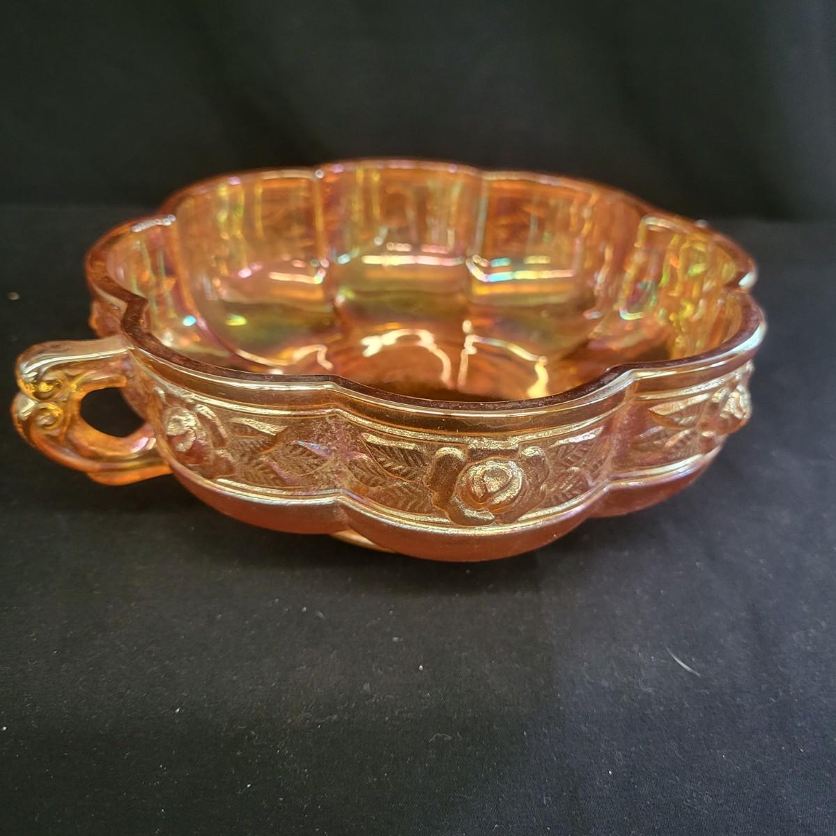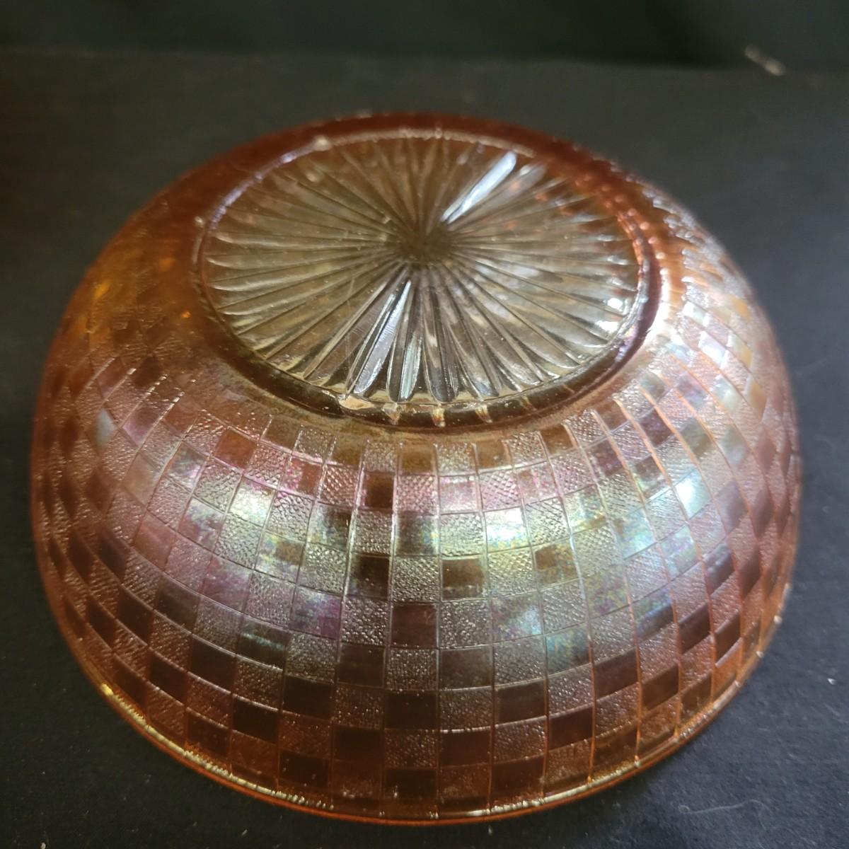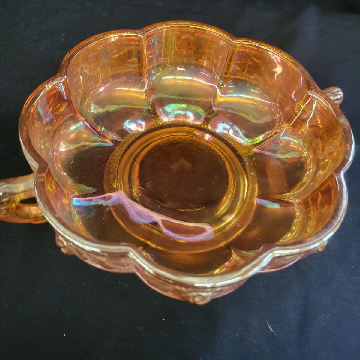 An assortment of over 12 pieces of colored glass, most of which is carnival glass. Largest green bowl pictured last measures approximately 12" x 9" x 4.5"H. The vase with the top has a small chip in its lid. Shipping available. Shipping can be costly. We suggest contacting our preferred local shipping provider, Postage Express, with dimensions and getting an estimate before bidding: (828) 670-5501 or postageexpress@yahoo.com.