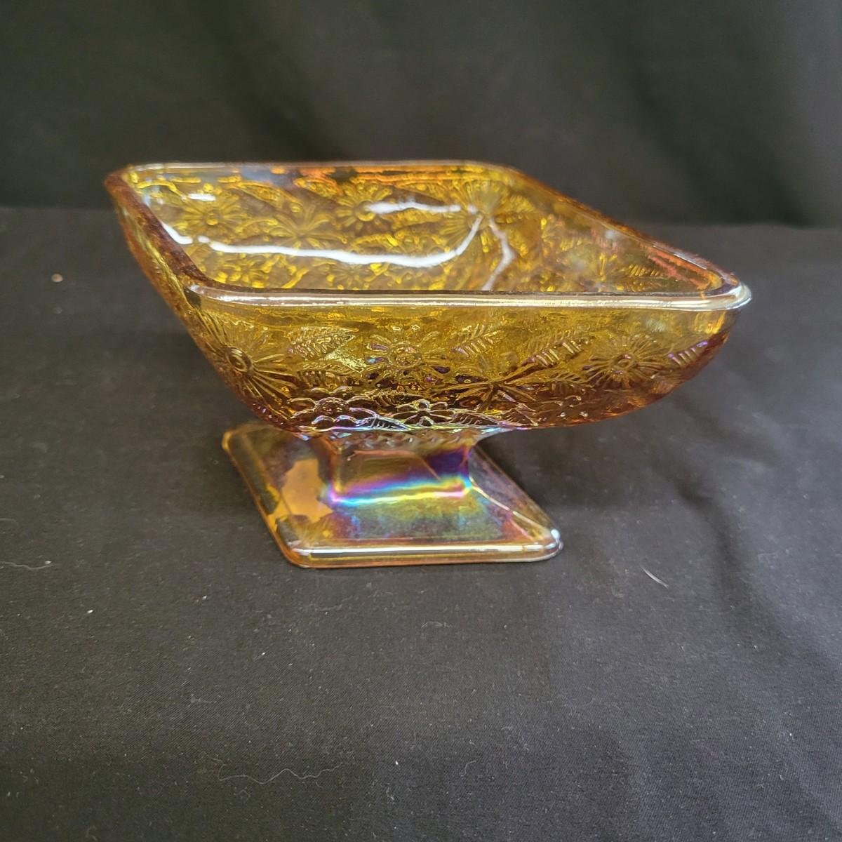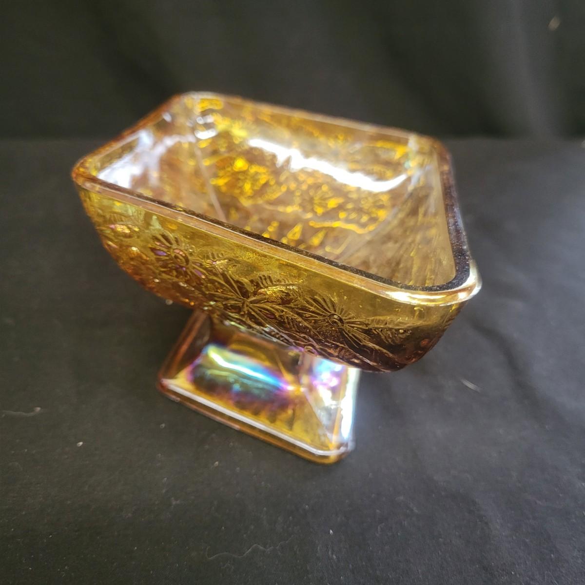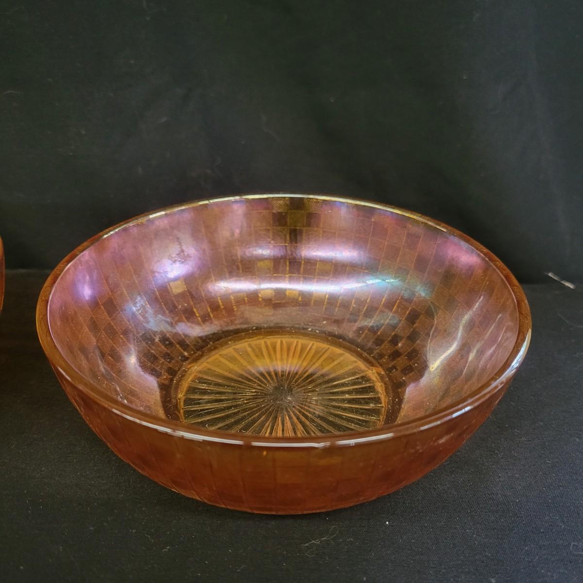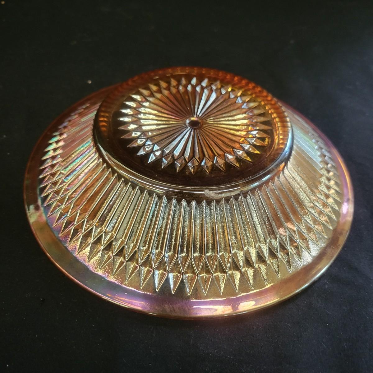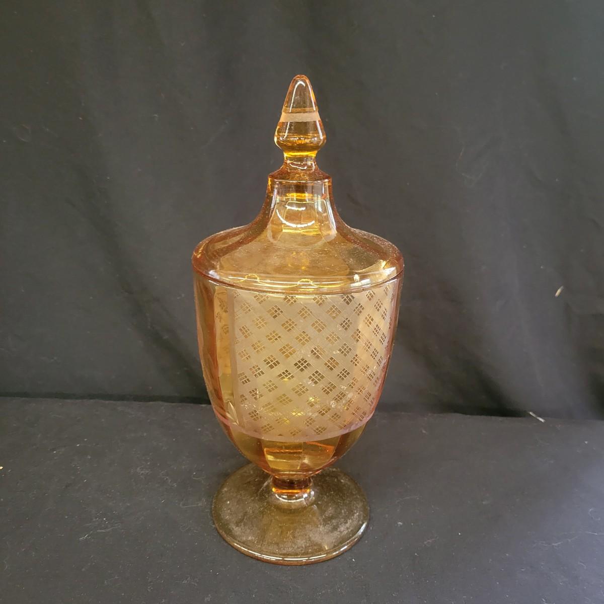 An assortment of over 12 pieces of colored glass, most of which is carnival glass. Largest green bowl pictured last measures approximately 12" x 9" x 4.5"H. The vase with the top has a small chip in its lid. Shipping available. Shipping can be costly. We suggest contacting our preferred local shipping provider, Postage Express, with dimensions and getting an estimate before bidding: (828) 670-5501 or postageexpress@yahoo.com.