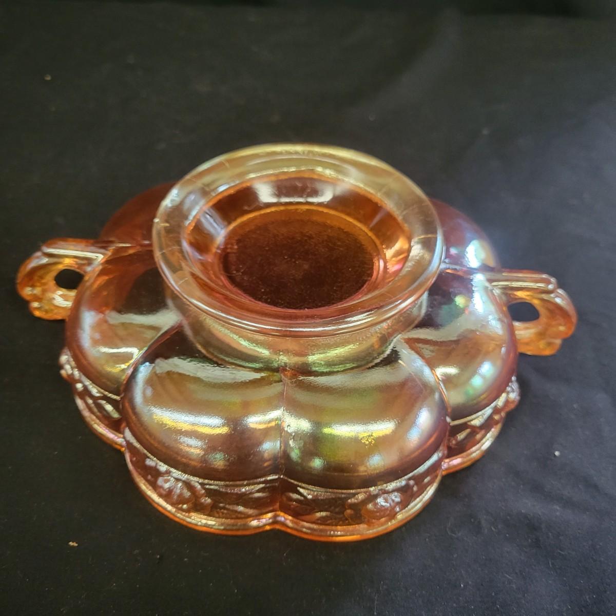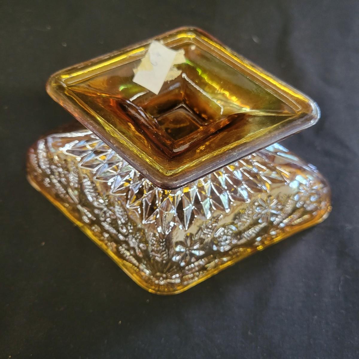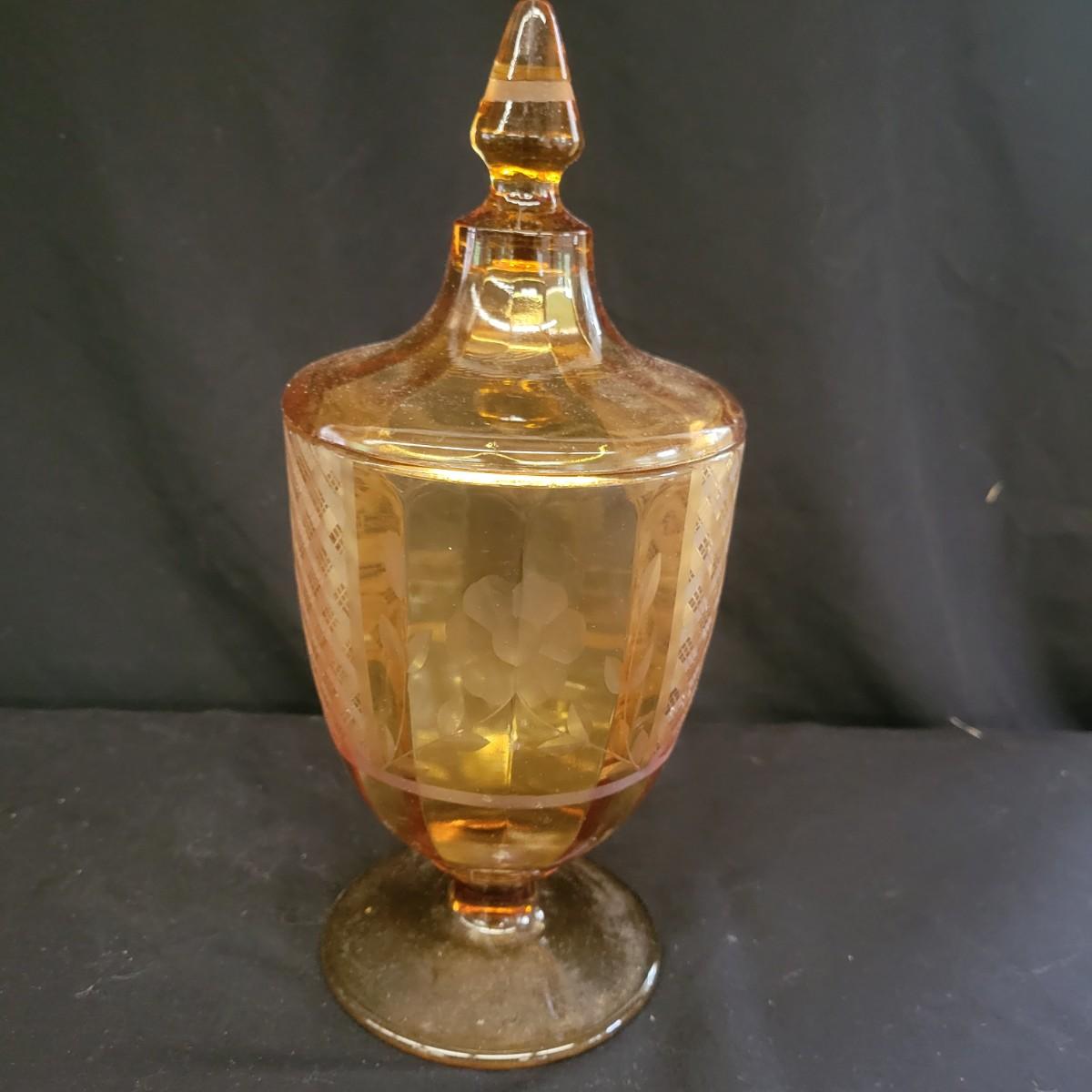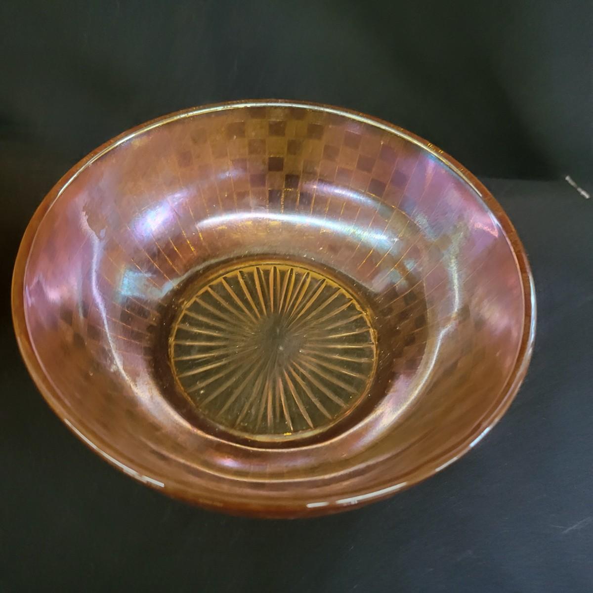 An assortment of over 12 pieces of colored glass, most of which is carnival glass. Largest green bowl pictured last measures approximately 12" x 9" x 4.5"H. The vase with the top has a small chip in its lid. Shipping available. Shipping can be costly. We suggest contacting our preferred local shipping provider, Postage Express, with dimensions and getting an estimate before bidding: (828) 670-5501 or postageexpress@yahoo.com.