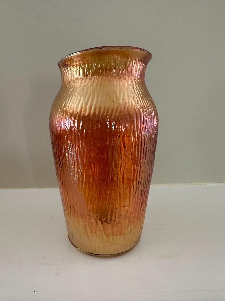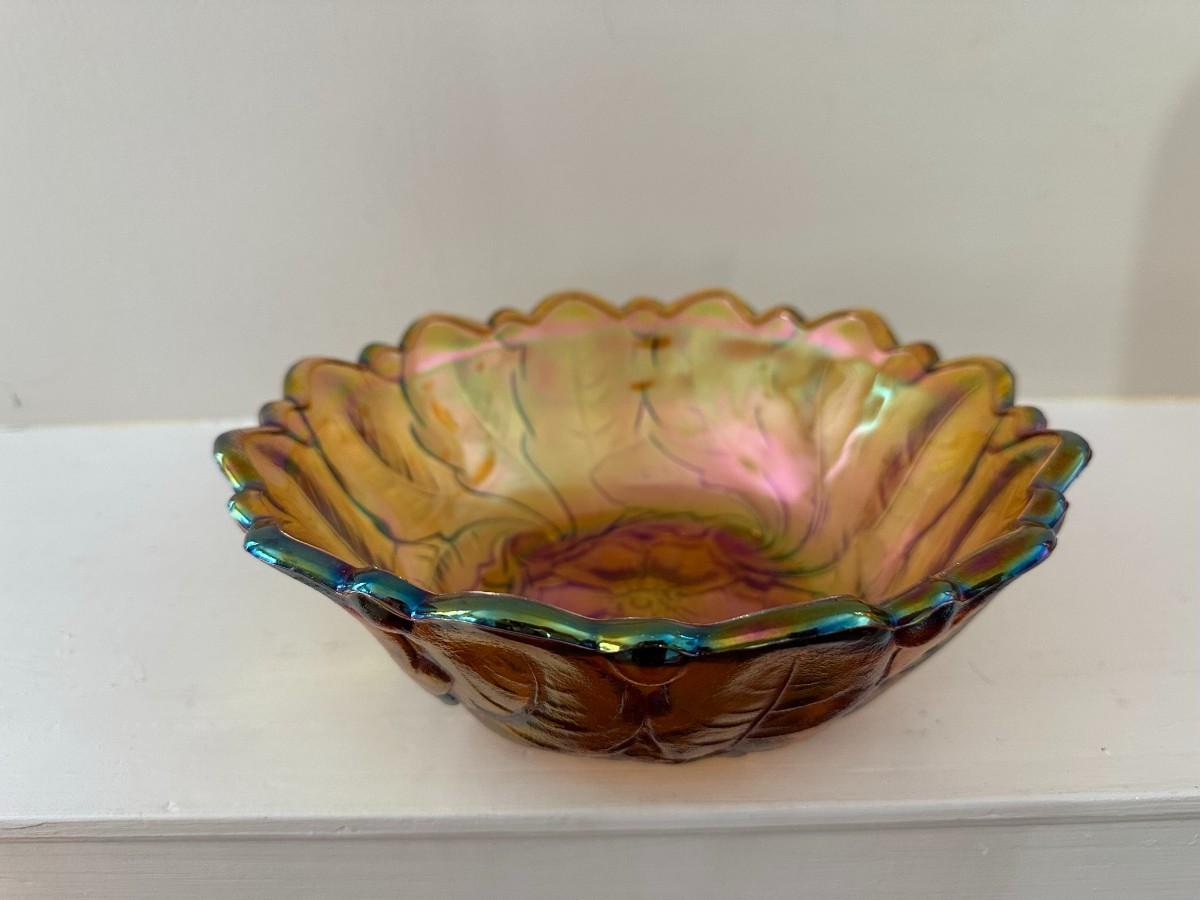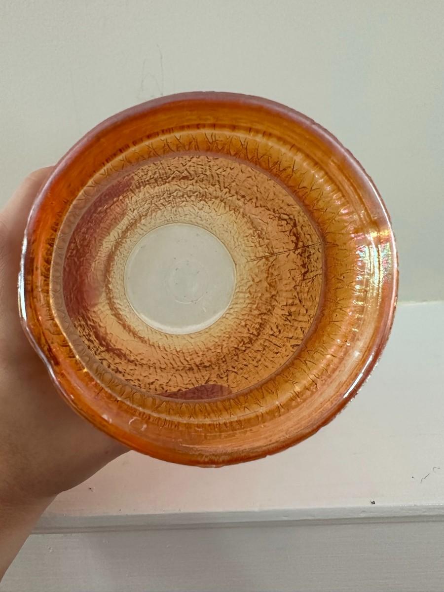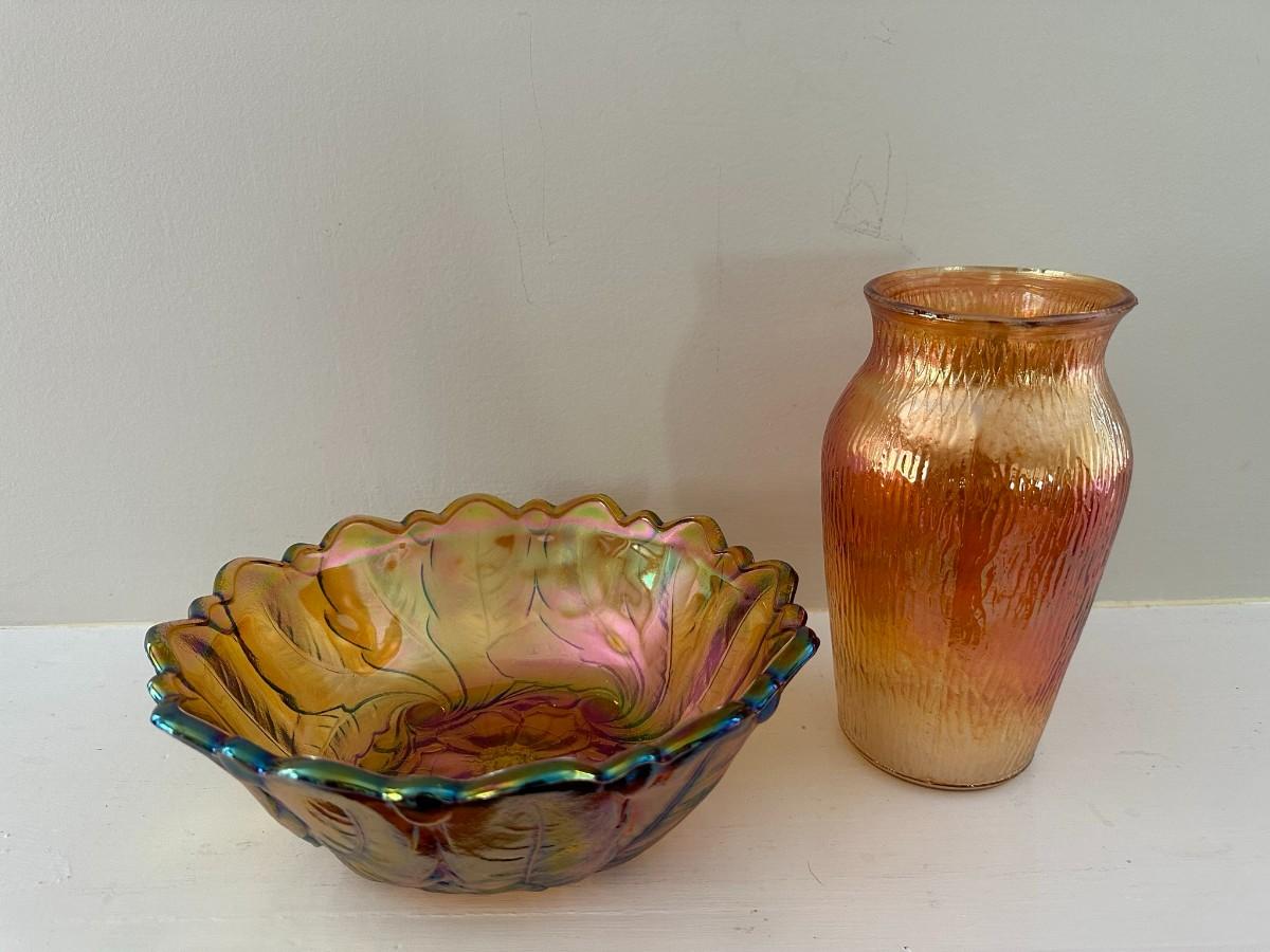 Amber/Blue Carnival Glass Bowl 9"w x 3.24"h. Orange/Amber/Pink Vase 7.5"h
