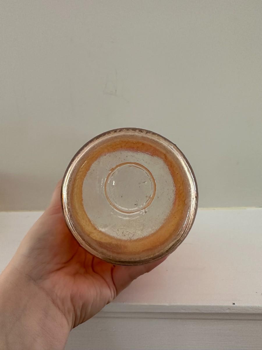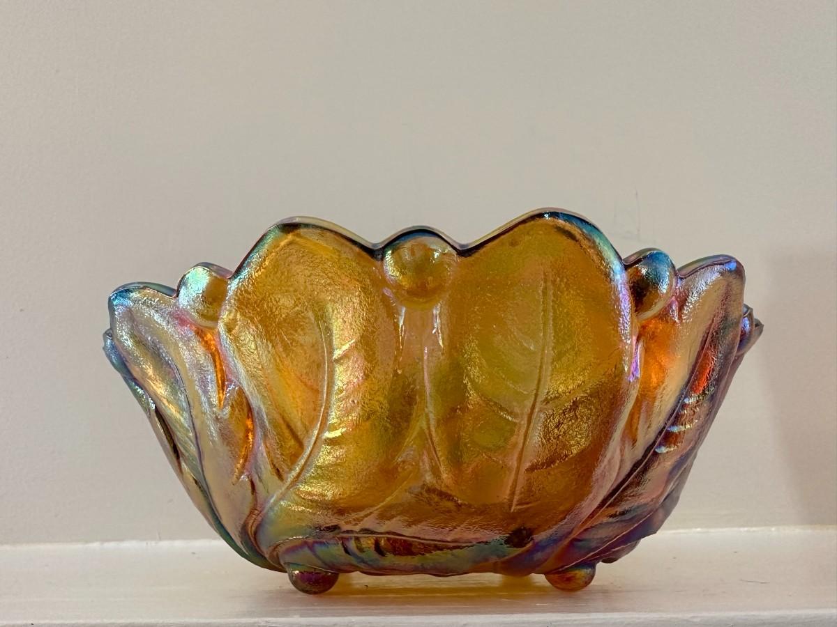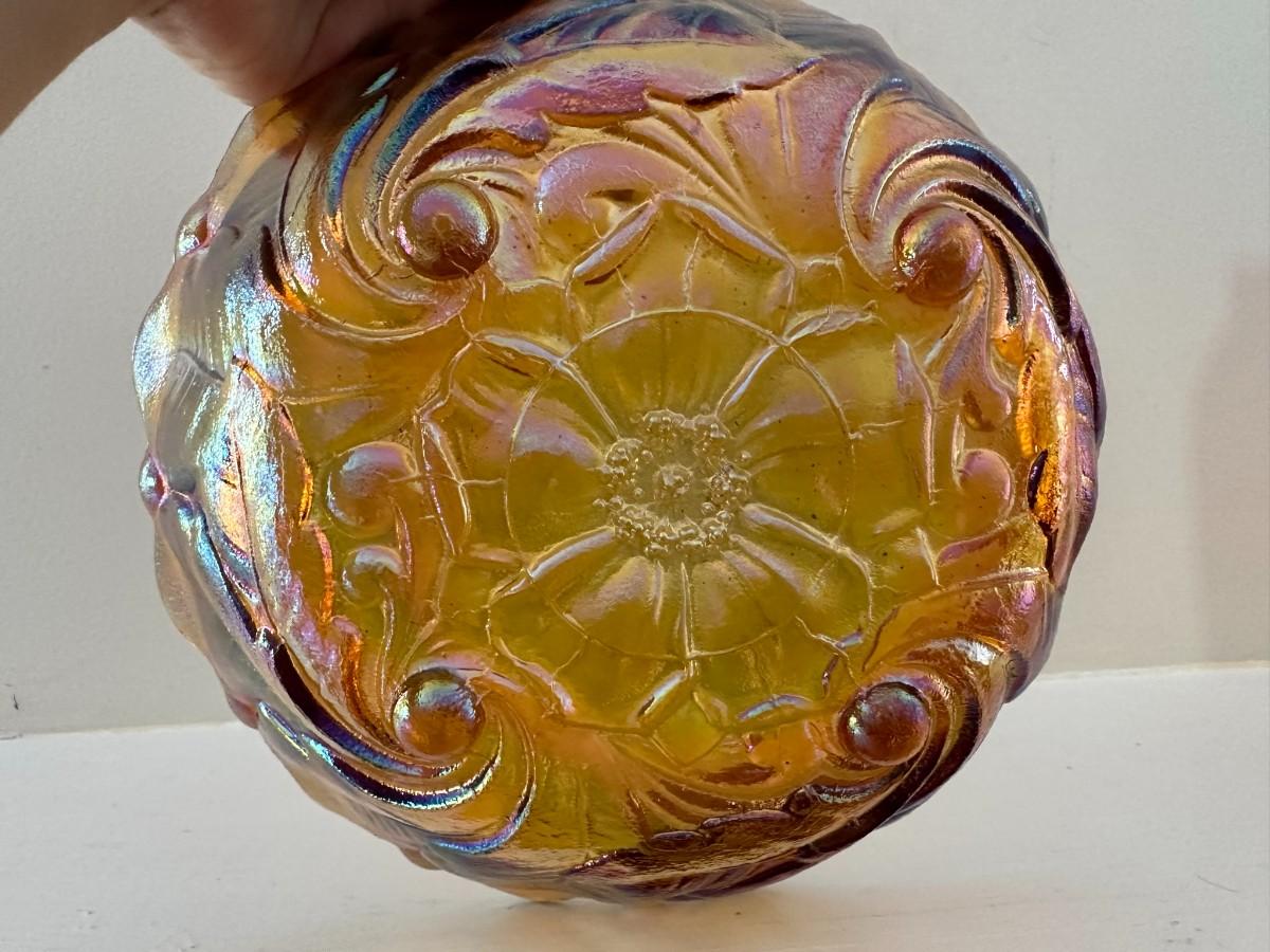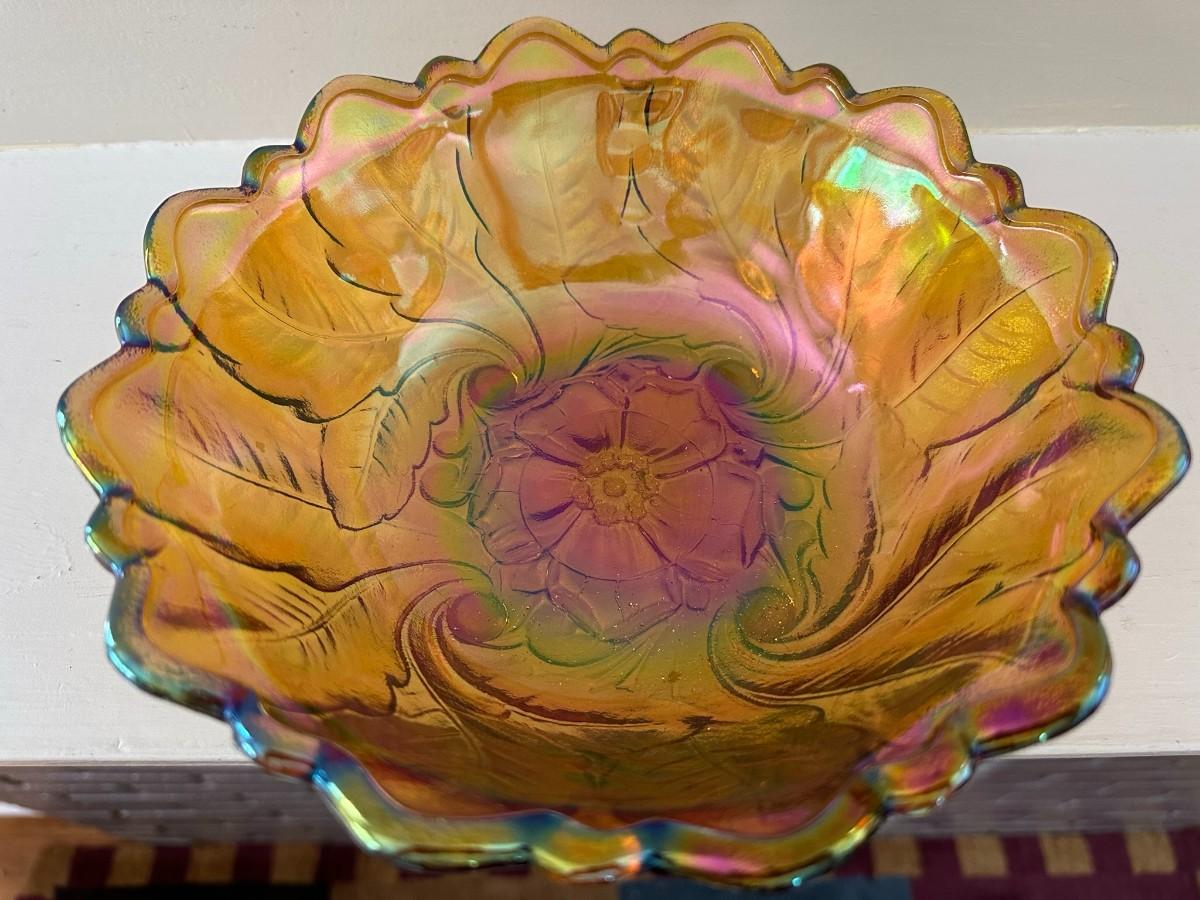 Amber/Blue Carnival Glass Bowl 9"w x 3.24"h. Orange/Amber/Pink Vase 7.5"h