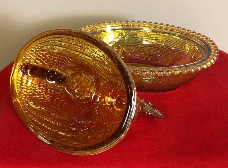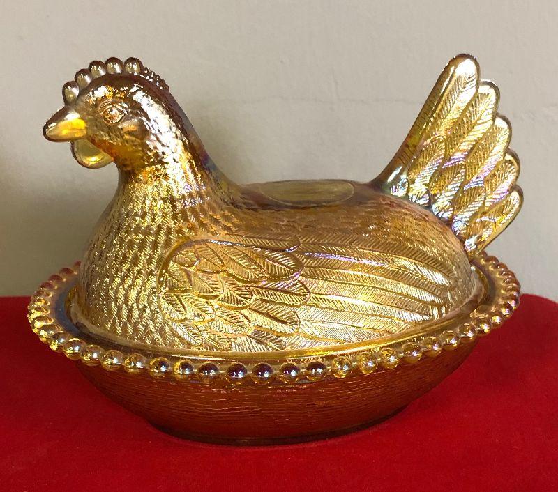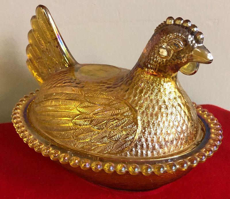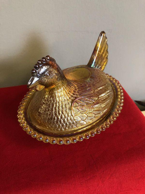 Carnival Glass covered chicken dish