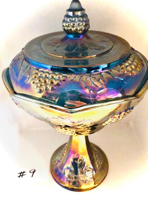 Indiana glass green, blue carnival glass candy dish or compote, pedestal type with harvest grape pattern. Stands 9 3/4 inches to the top of the finial, and 6 1/2 inches wide at widest point. Great condition no chips or cracks.