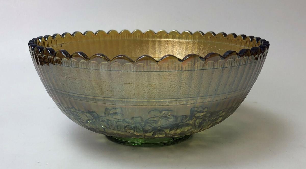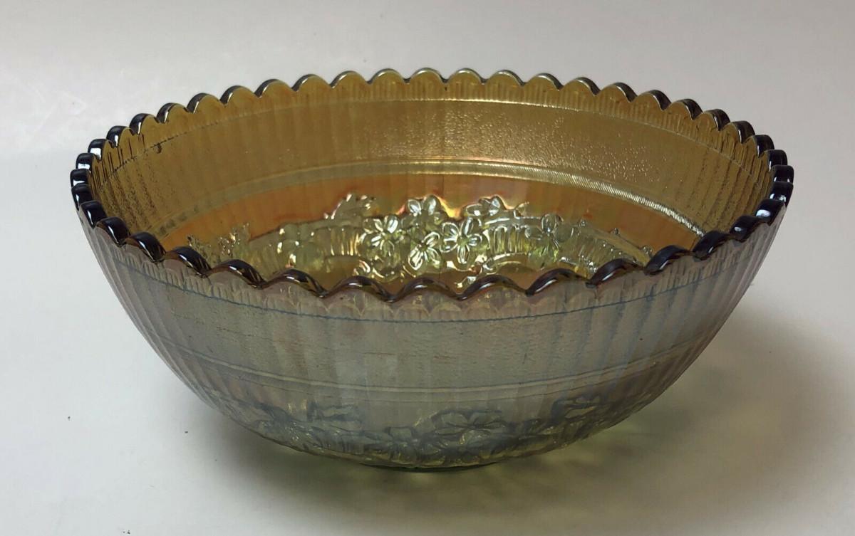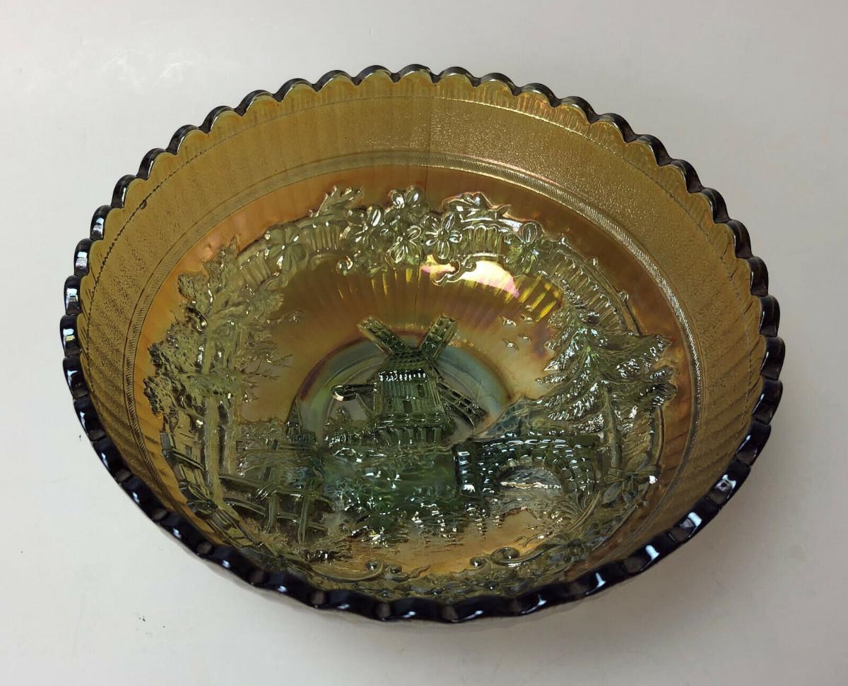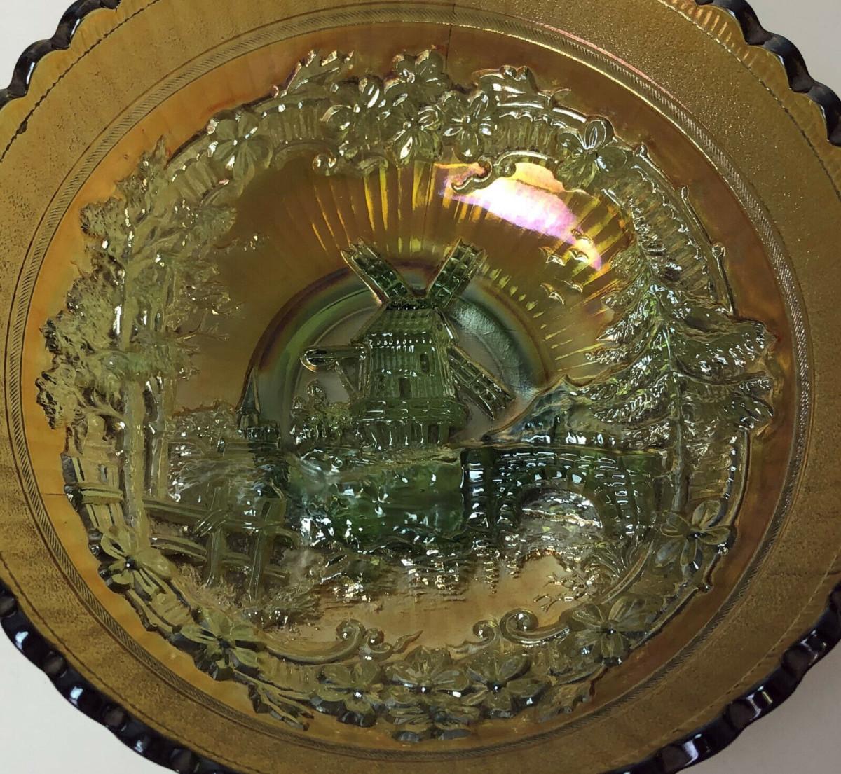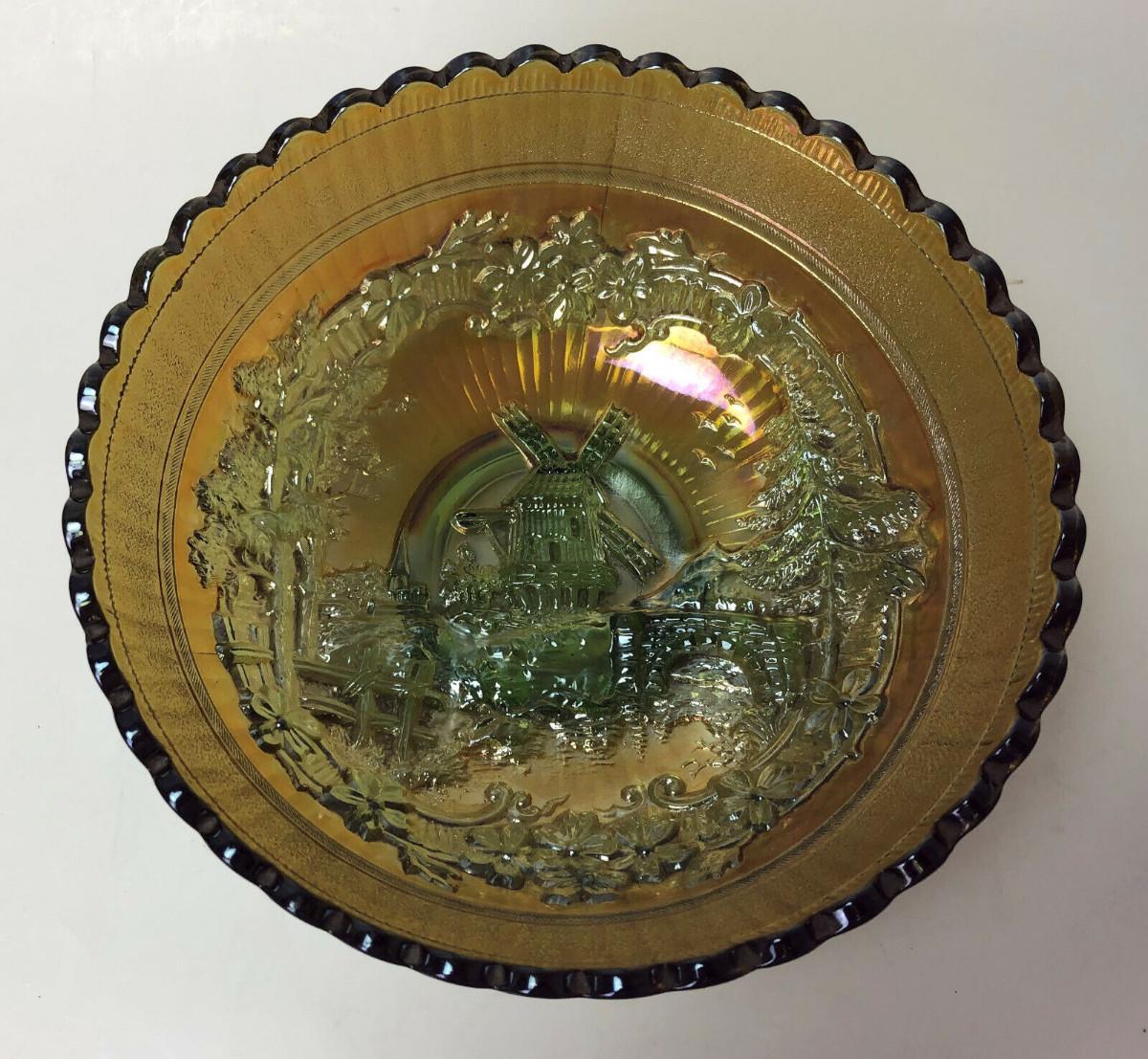 CARNIVAL GLASS IMPERIAL REISSUE WINDMILL BOWL marigold on green
