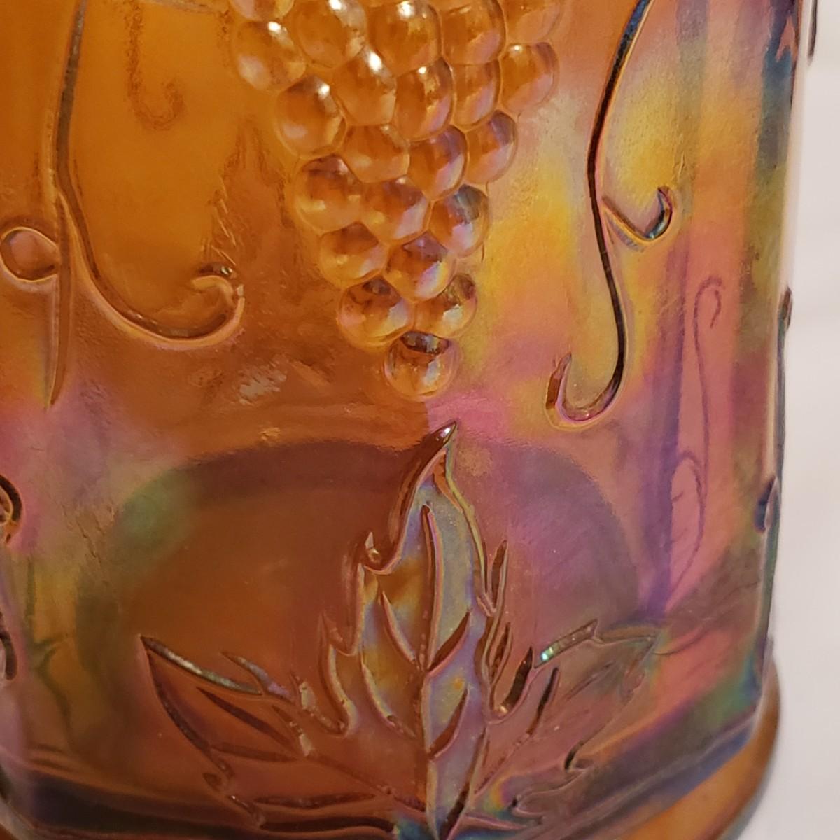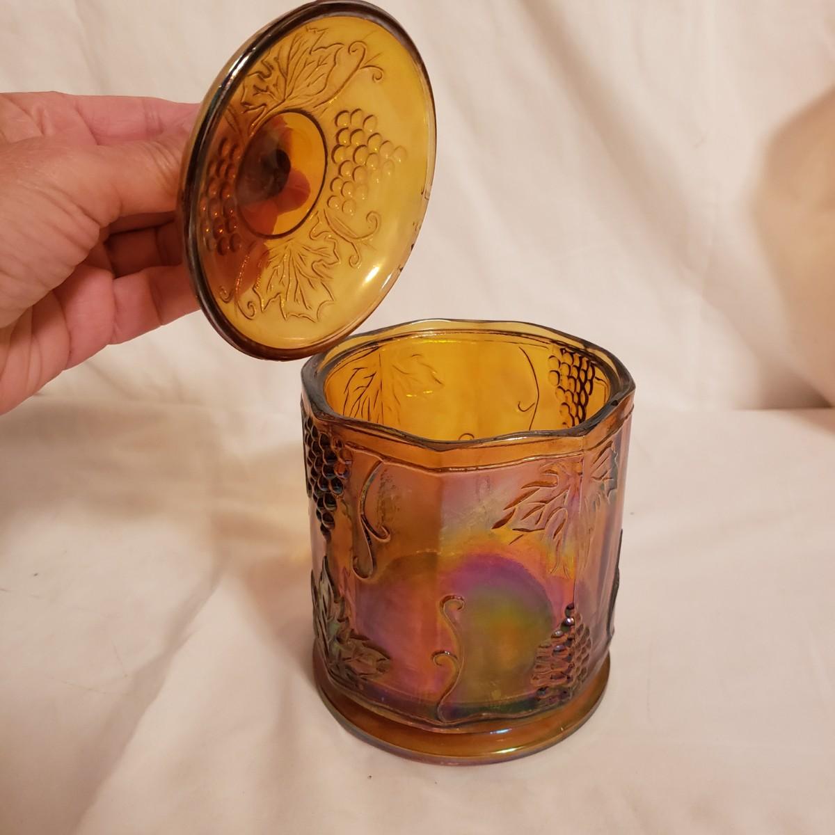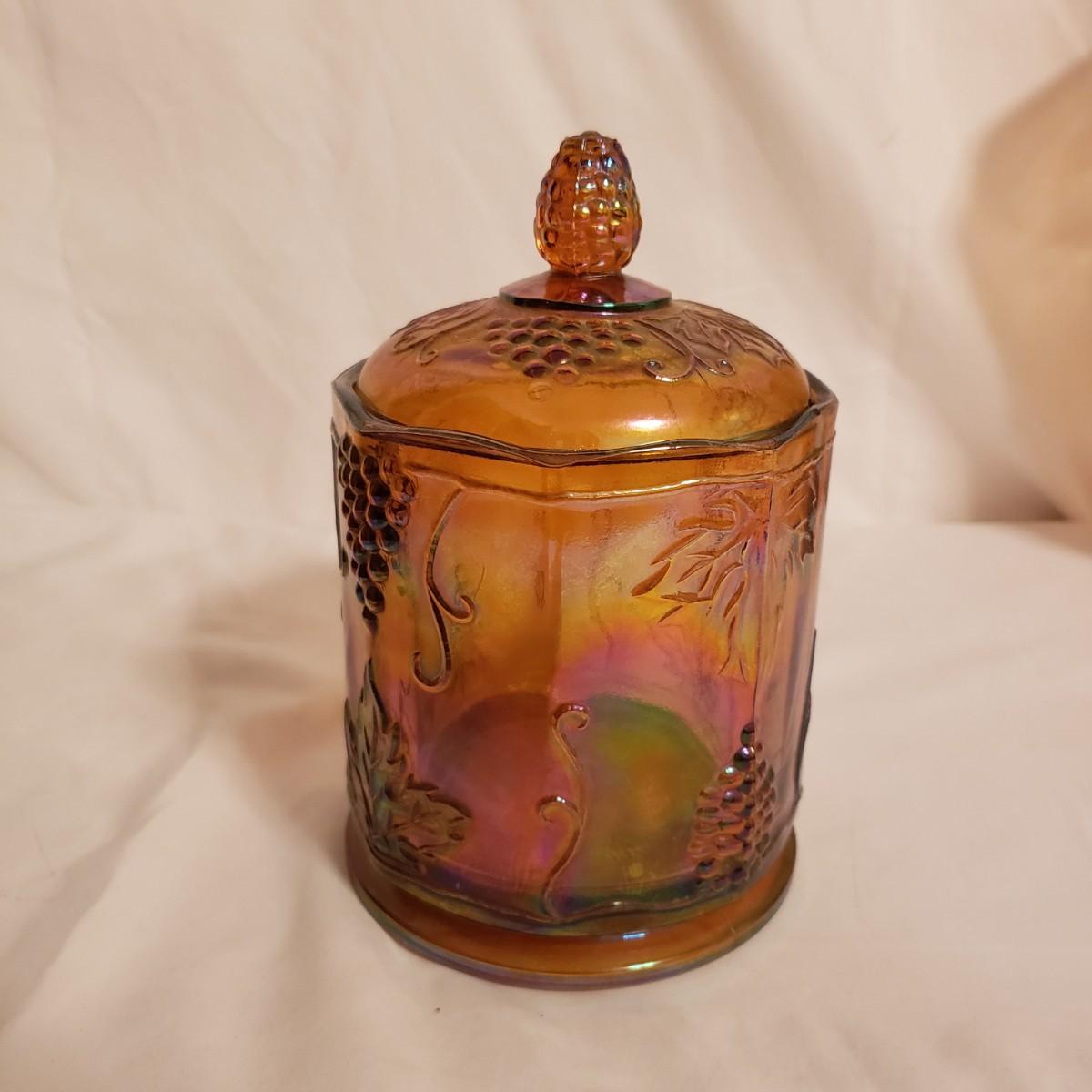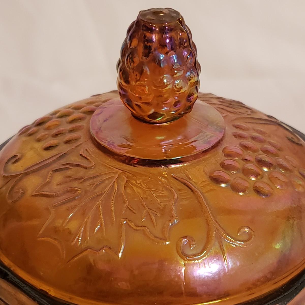 This eight piece lot features various colors of carnival glass. The blue diamond point patterned plate is smooth on the inside and textured on the back. This piece is just striking in the light. The textured bowl in a metallic amber color has a vine leaf and floral print. The small scalloped orange platter has delicate features. The ruffled bowl will spark conversation it is just that pretty! It has a chip off the base, but still sits steadily. The smoke colored divided relish dish measures approximately 8" x 1"H. The lidded jar has a grape vines pattern. Lastly, is a pair of orange metallic vases with a raised floral pattern. These would look great on a mantel.