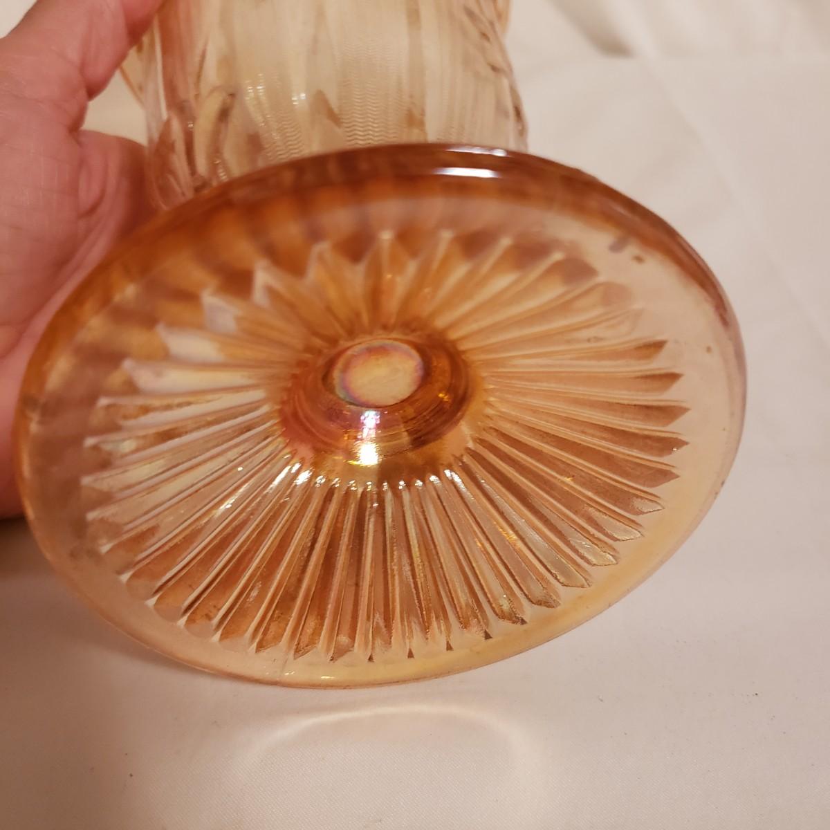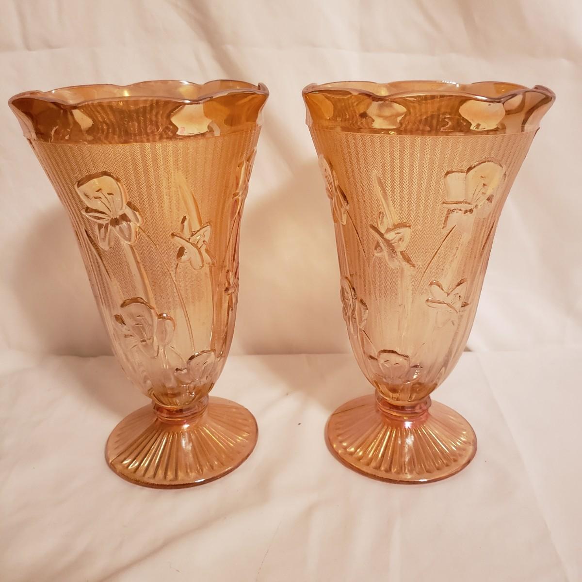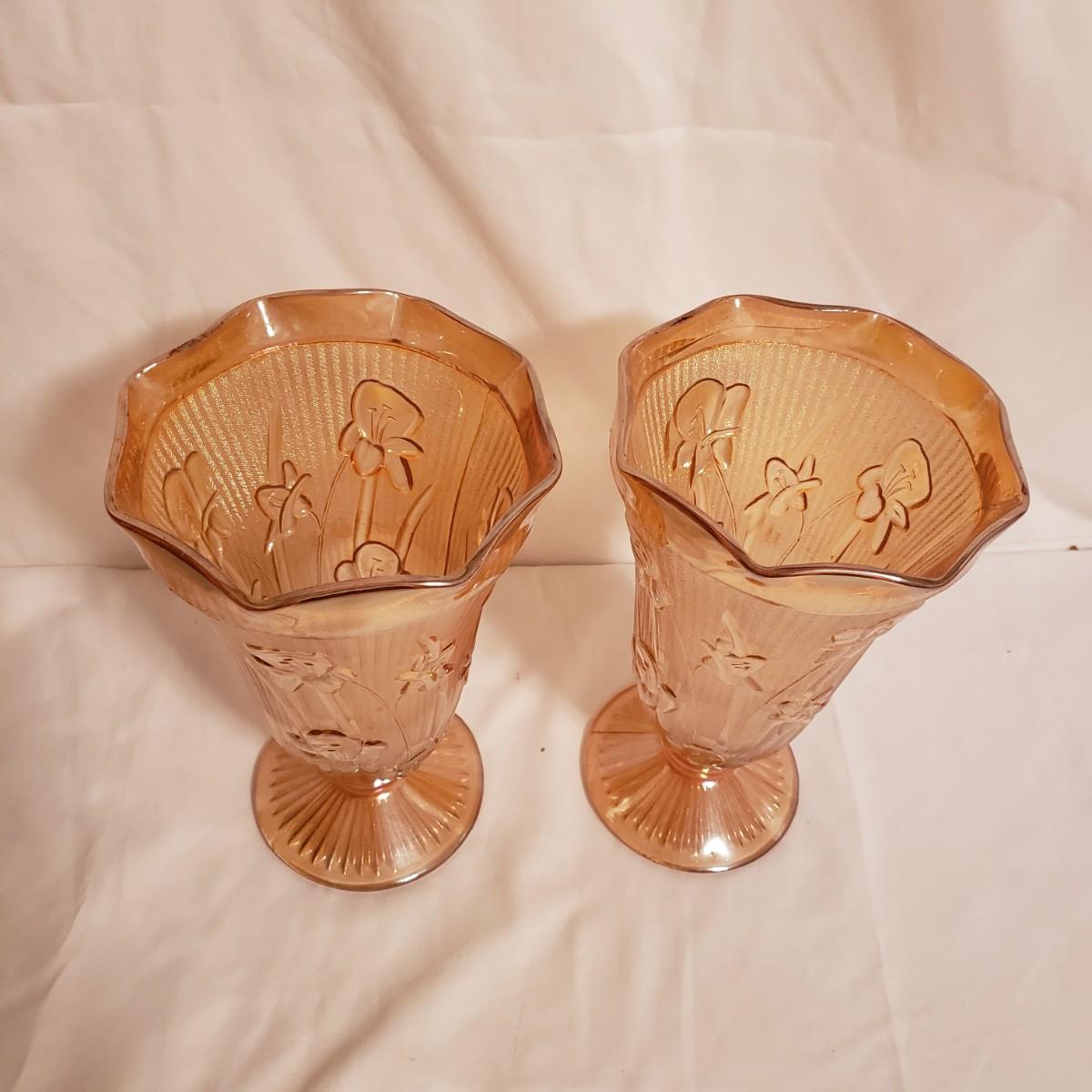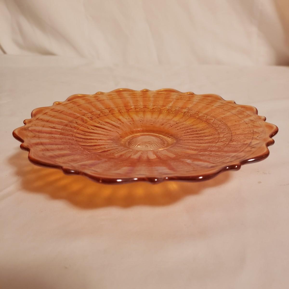 This eight piece lot features various colors of carnival glass. The blue diamond point patterned plate is smooth on the inside and textured on the back. This piece is just striking in the light. The textured bowl in a metallic amber color has a vine leaf and floral print. The small scalloped orange platter has delicate features. The ruffled bowl will spark conversation it is just that pretty! It has a chip off the base, but still sits steadily. The smoke colored divided relish dish measures approximately 8" x 1"H. The lidded jar has a grape vines pattern. Lastly, is a pair of orange metallic vases with a raised floral pattern. These would look great on a mantel.