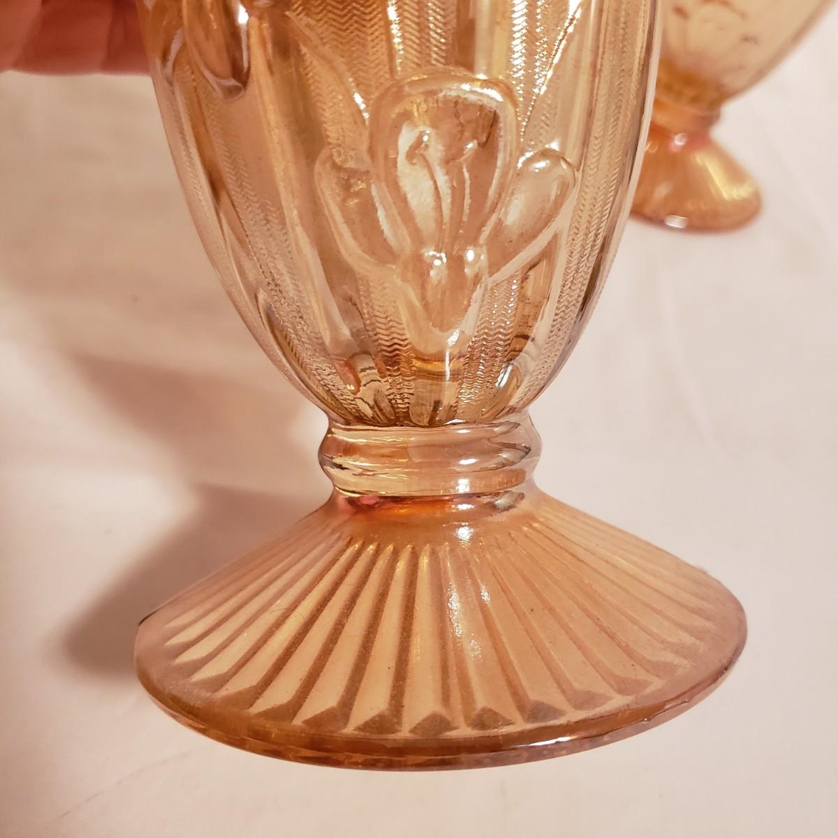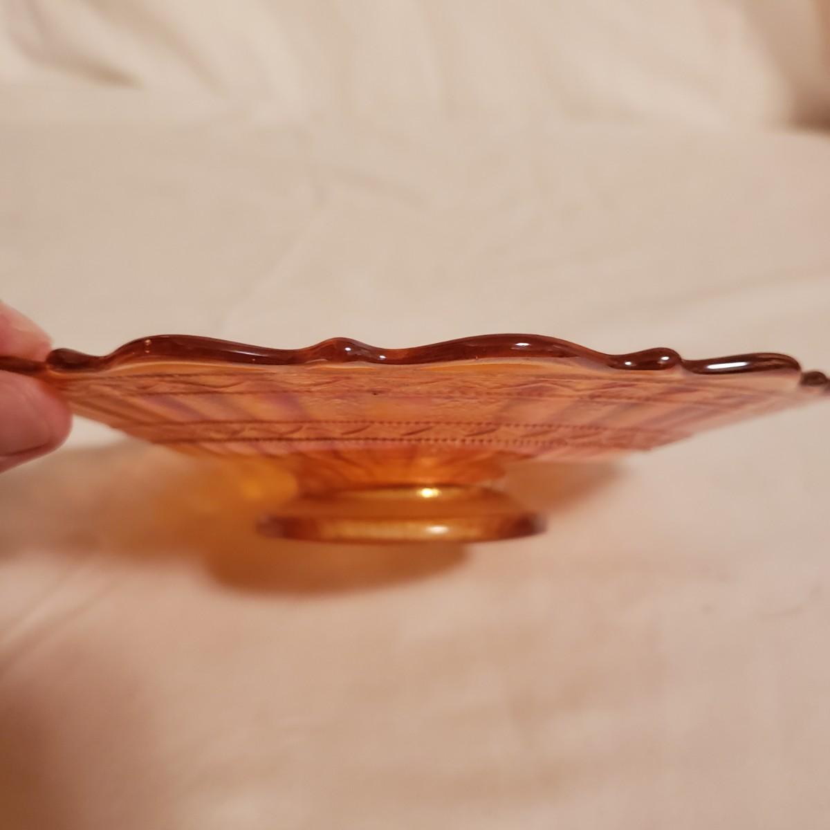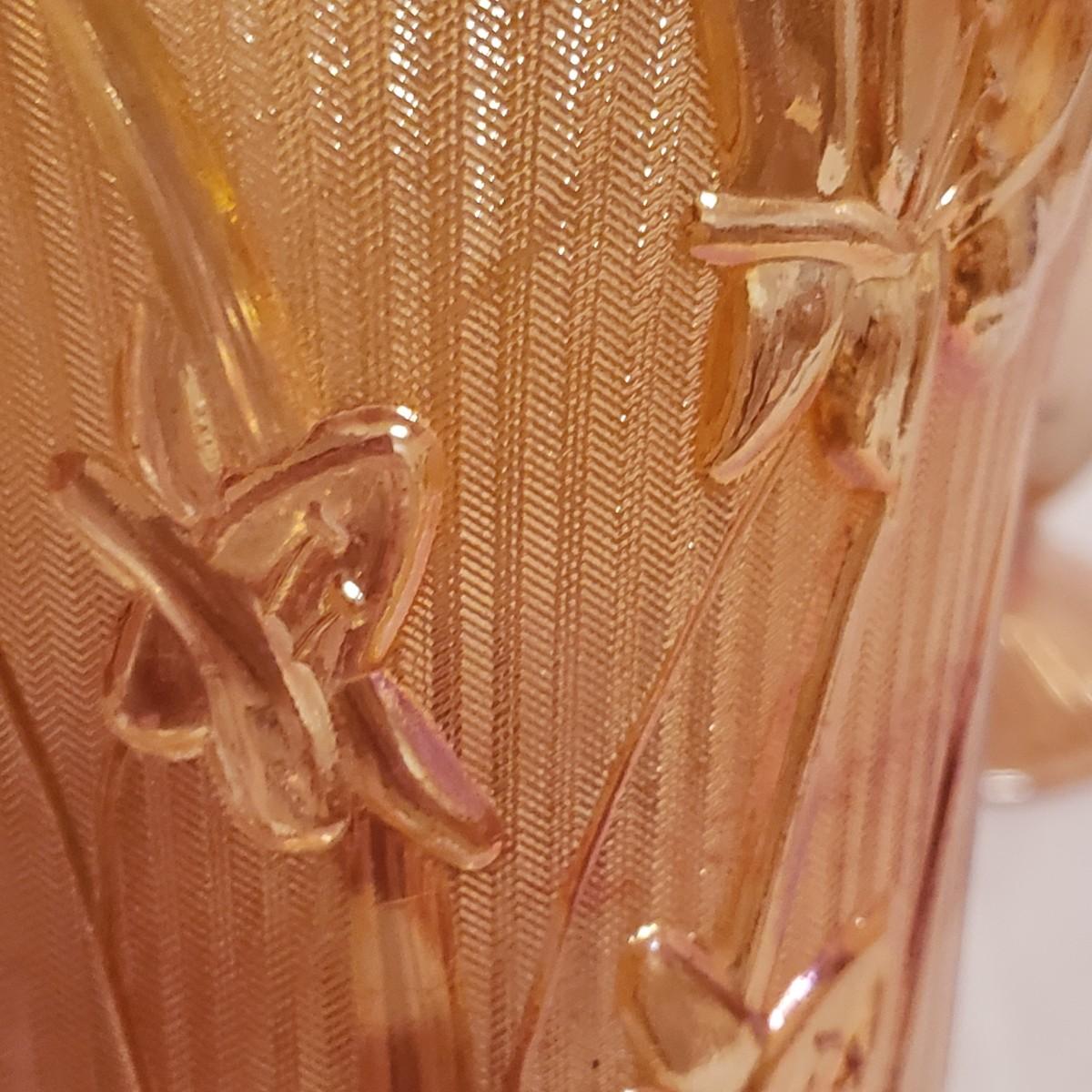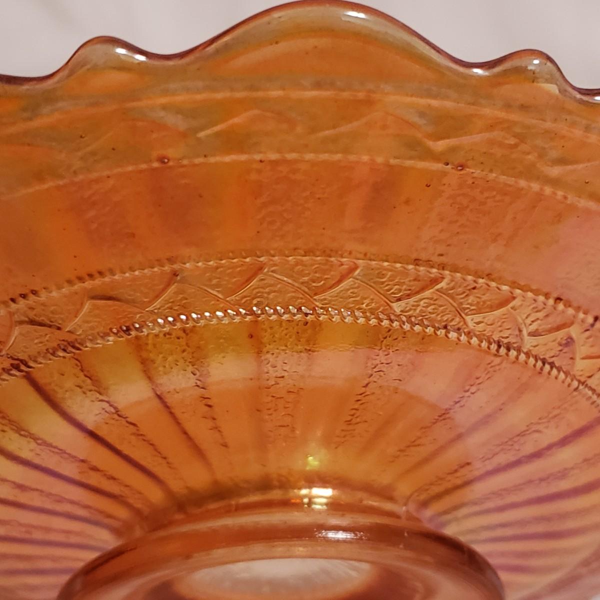 This eight piece lot features various colors of carnival glass. The blue diamond point patterned plate is smooth on the inside and textured on the back. This piece is just striking in the light. The textured bowl in a metallic amber color has a vine leaf and floral print. The small scalloped orange platter has delicate features. The ruffled bowl will spark conversation it is just that pretty! It has a chip off the base, but still sits steadily. The smoke colored divided relish dish measures approximately 8" x 1"H. The lidded jar has a grape vines pattern. Lastly, is a pair of orange metallic vases with a raised floral pattern. These would look great on a mantel.