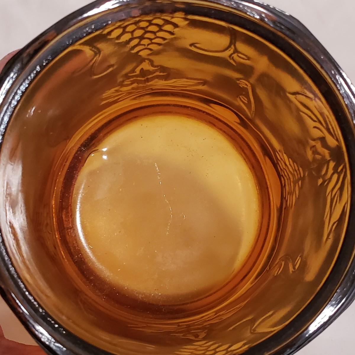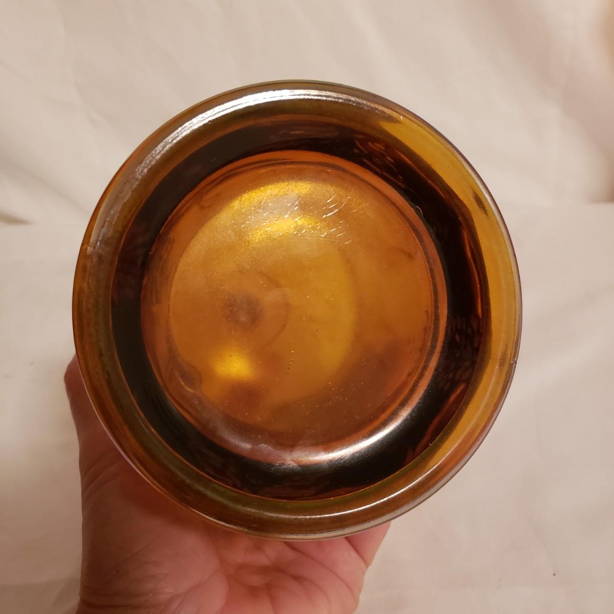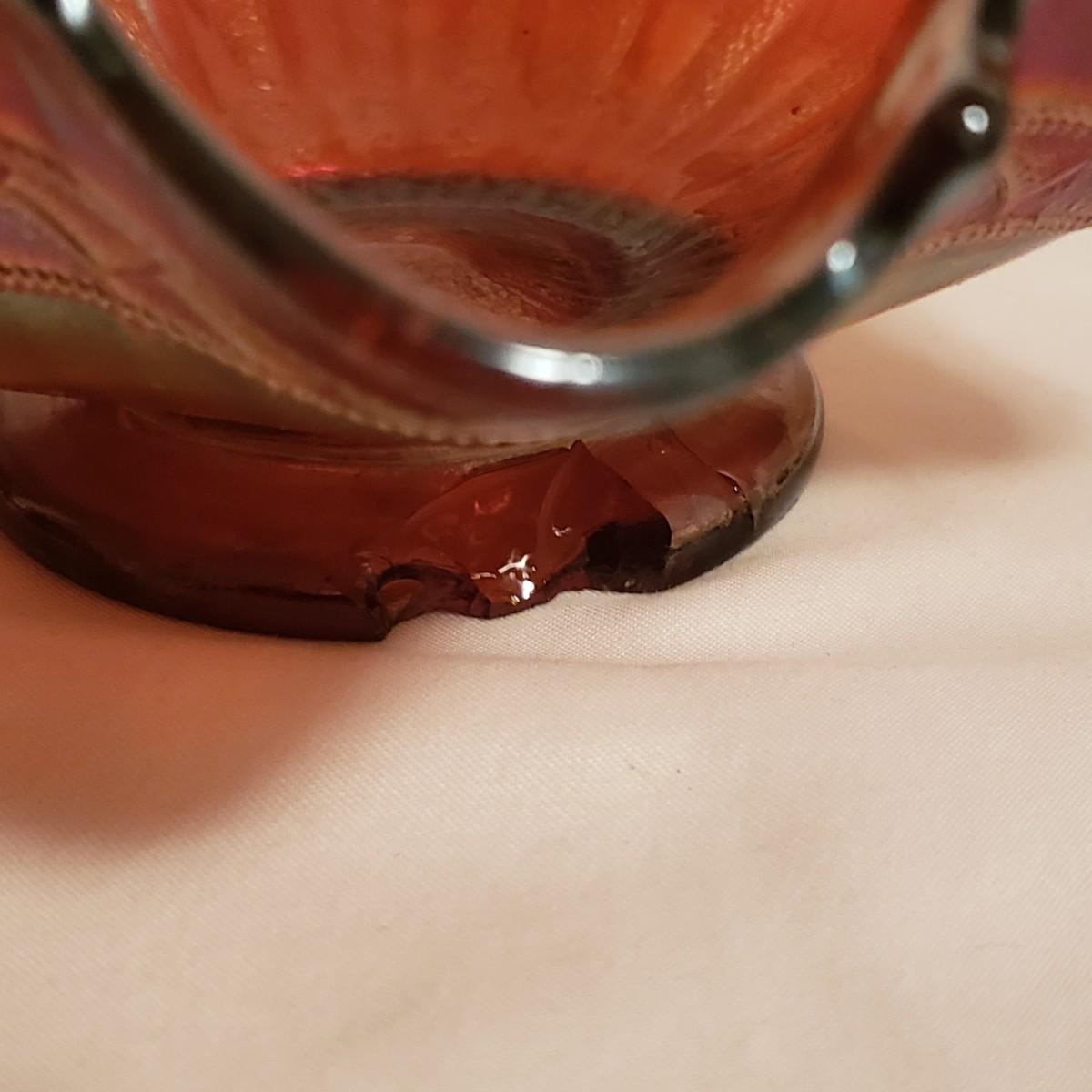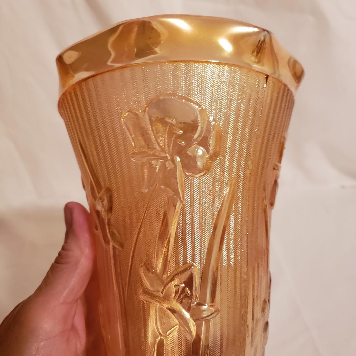 This eight piece lot features various colors of carnival glass. The blue diamond point patterned plate is smooth on the inside and textured on the back. This piece is just striking in the light. The textured bowl in a metallic amber color has a vine leaf and floral print. The small scalloped orange platter has delicate features. The ruffled bowl will spark conversation it is just that pretty! It has a chip off the base, but still sits steadily. The smoke colored divided relish dish measures approximately 8" x 1"H. The lidded jar has a grape vines pattern. Lastly, is a pair of orange metallic vases with a raised floral pattern. These would look great on a mantel.