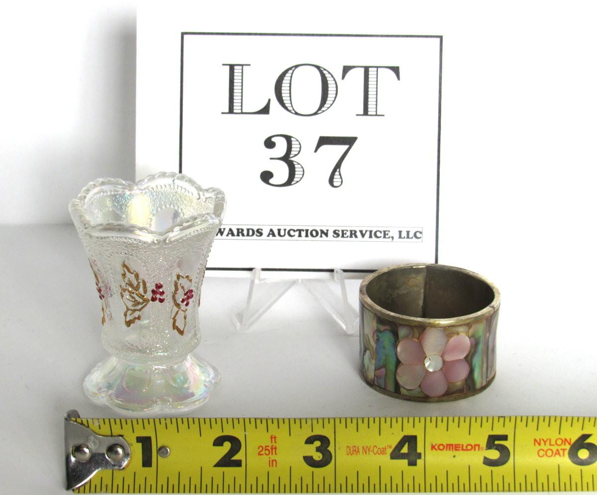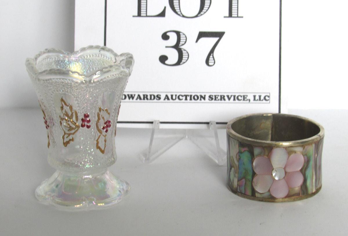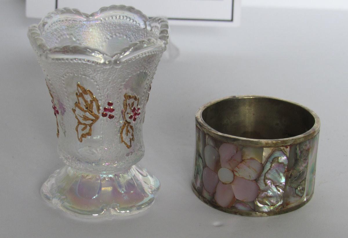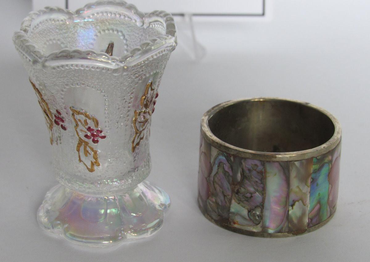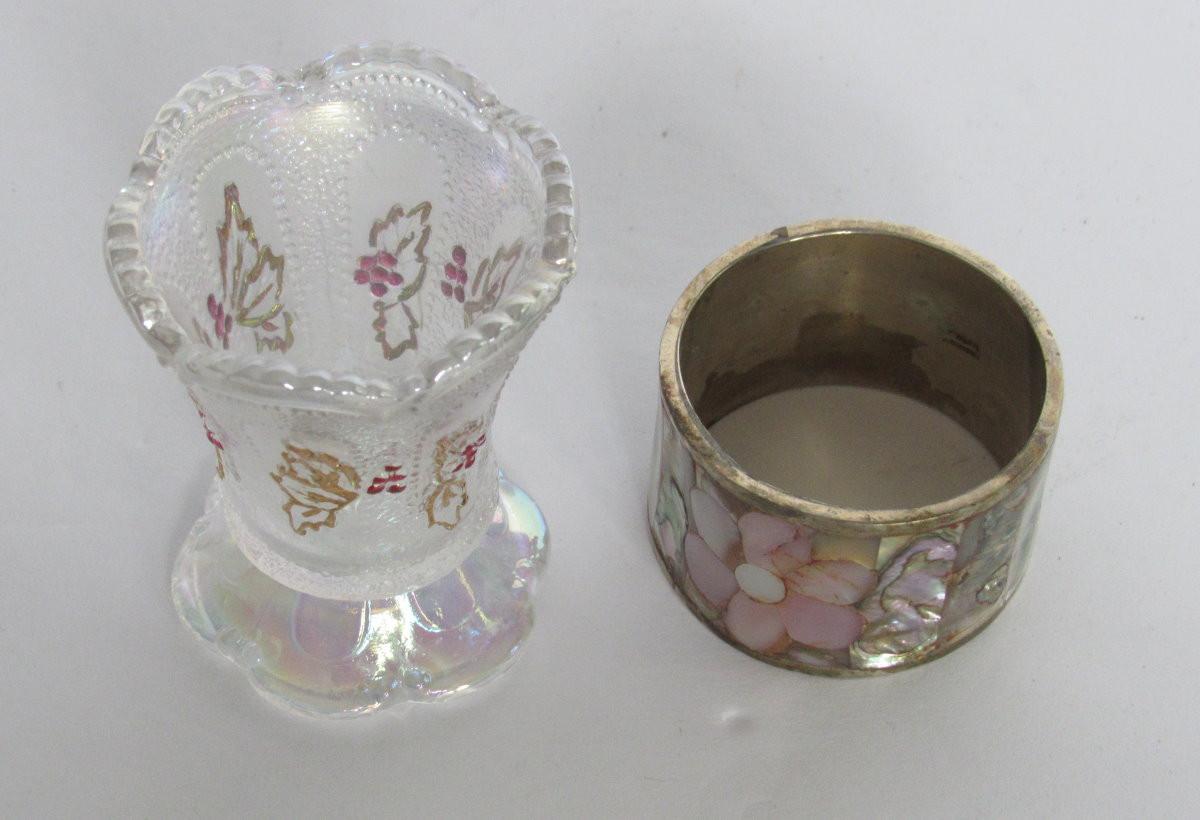 Carnival Glass Toothpick Holder and Silver Plate Napkin Ring From Mexico