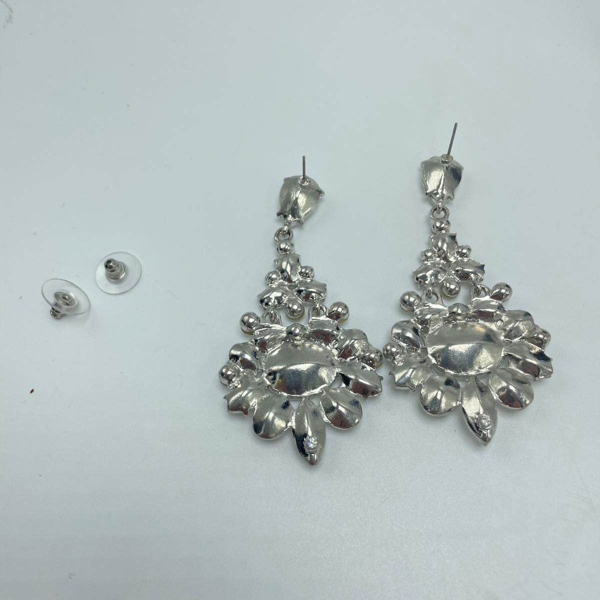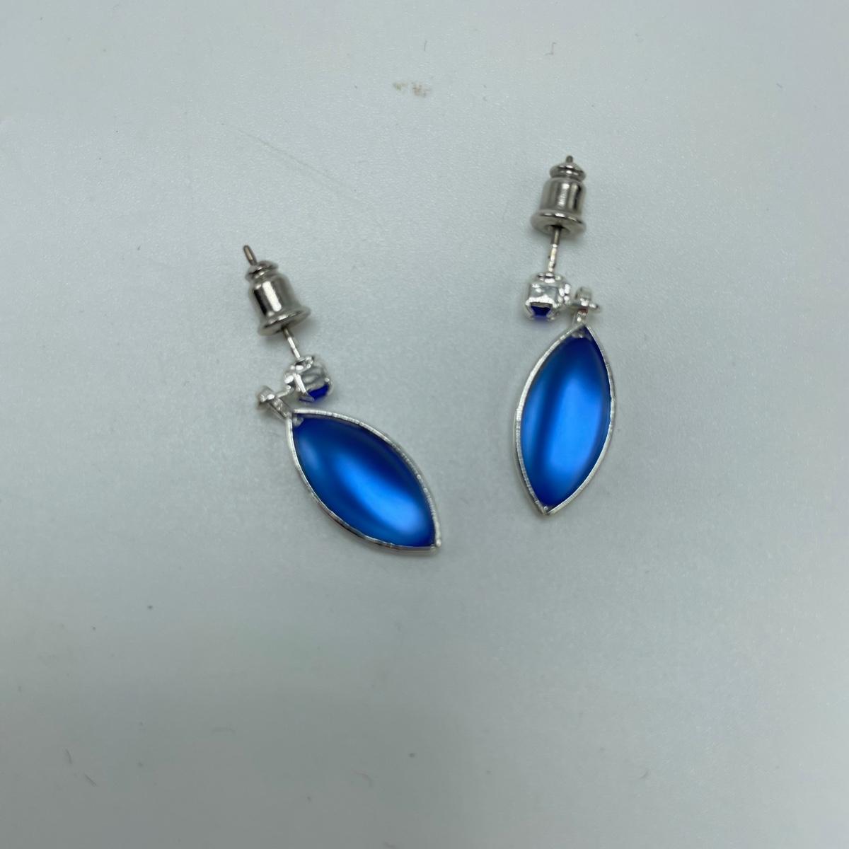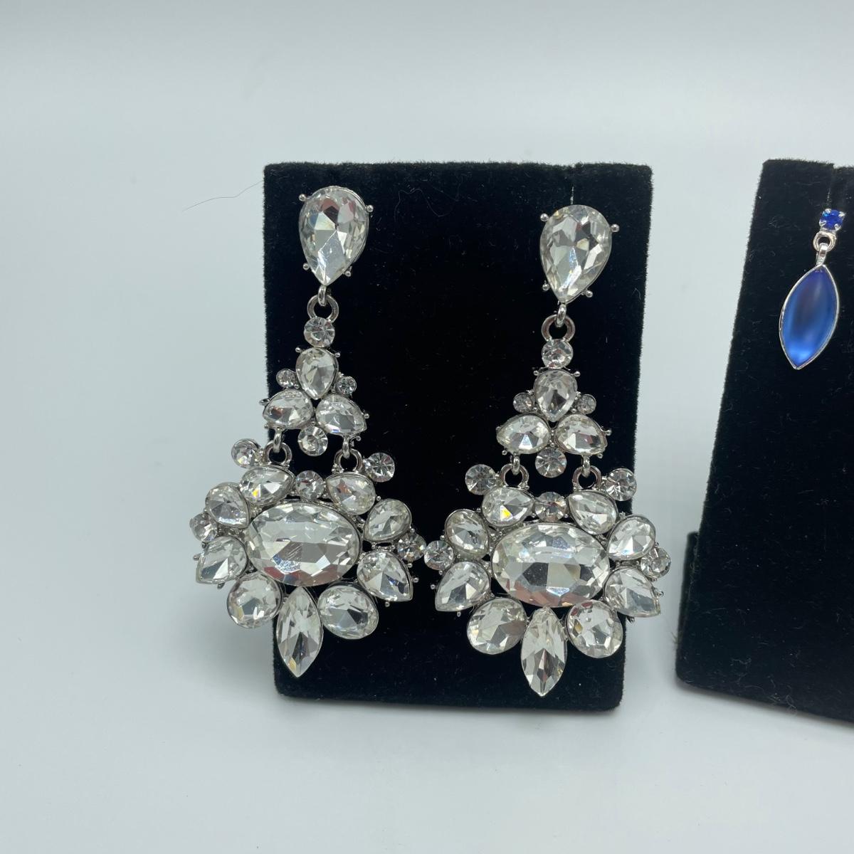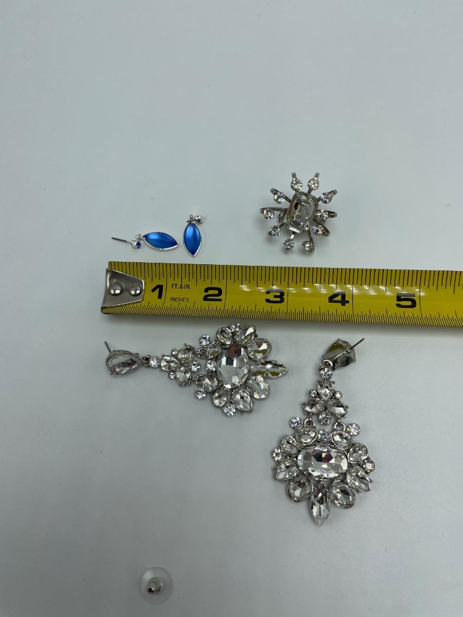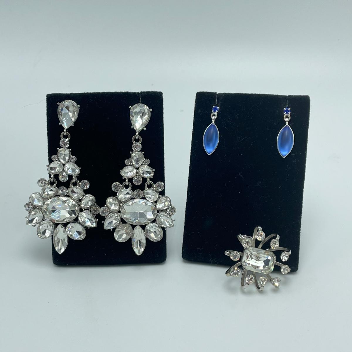 Sparkling Caro brooch with a complementing pair of earrings. These large earrings also have a sparkly gem on the back side. Lastly, a sapphire colored stud with a polymer style dangle set of earrings. See images. Shipping available.