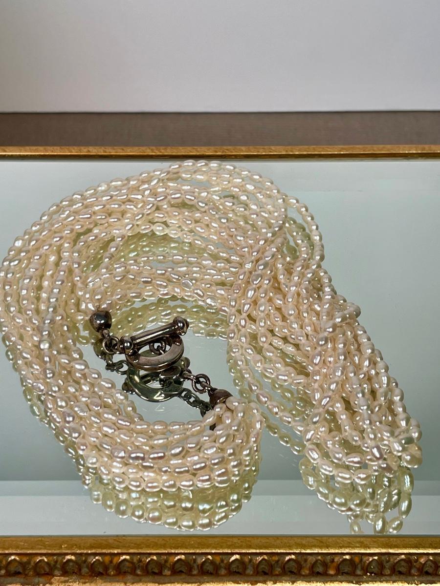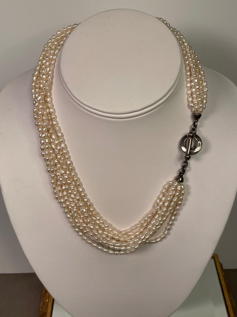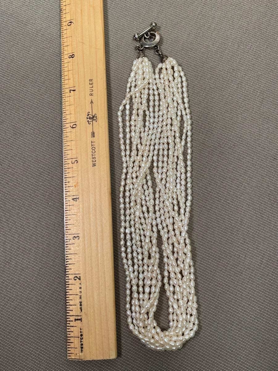 10 strands of creamy rice pearls. Nice toggle closure. Marked “Carolee” 925