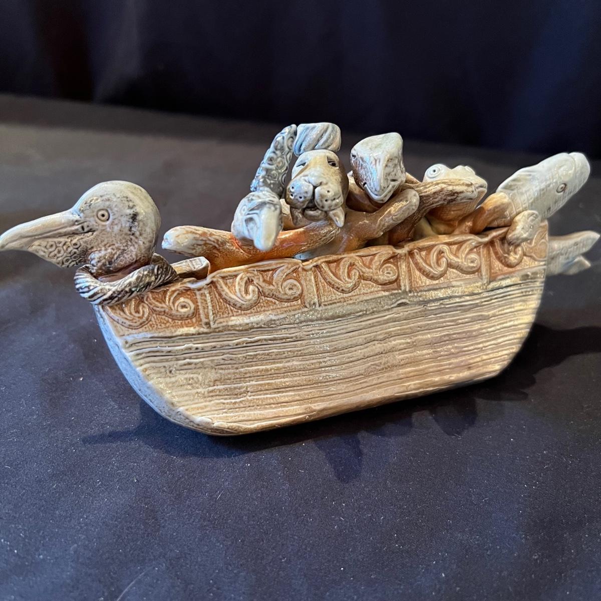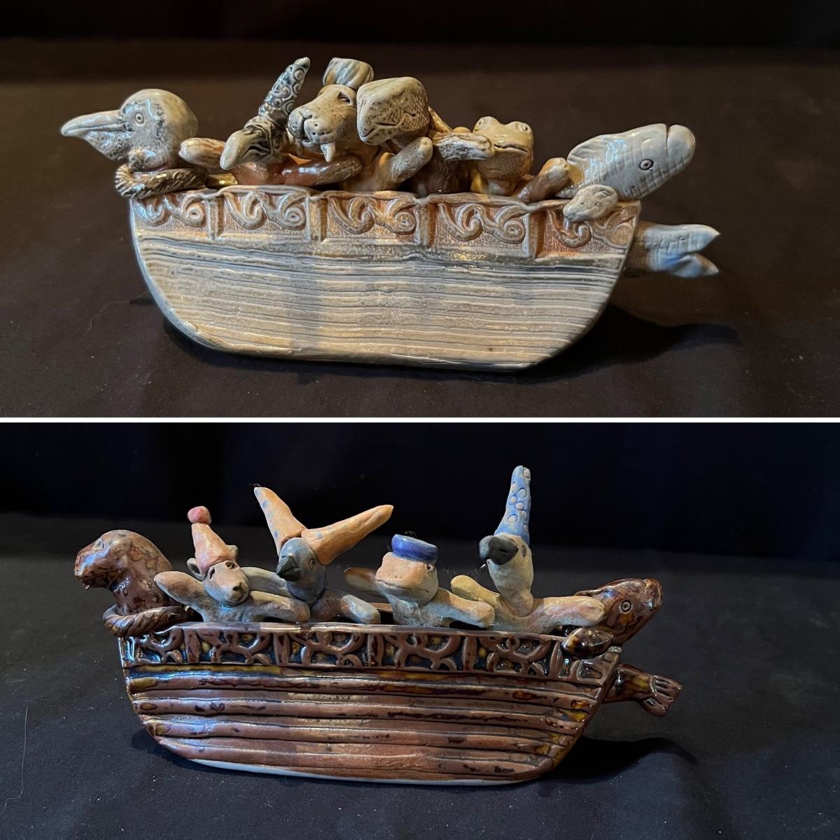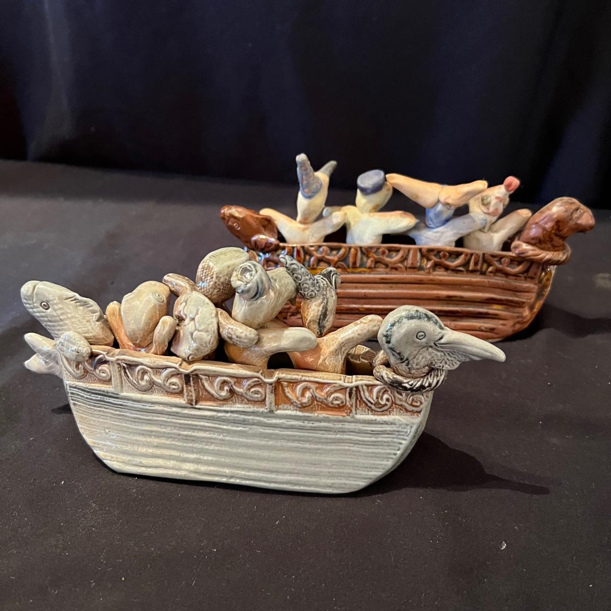Two pieces of pottery by Caroline Douglas. Both are hand built whimsical pieces inspired by Noah’s Ark .