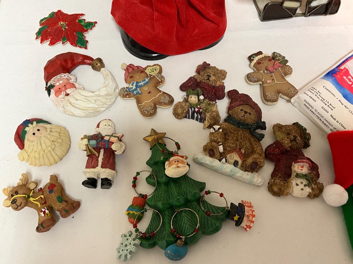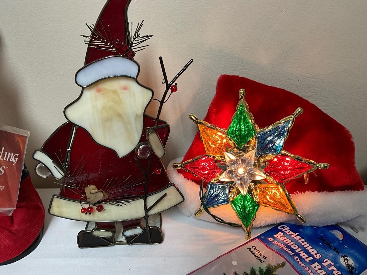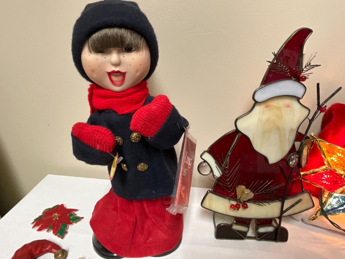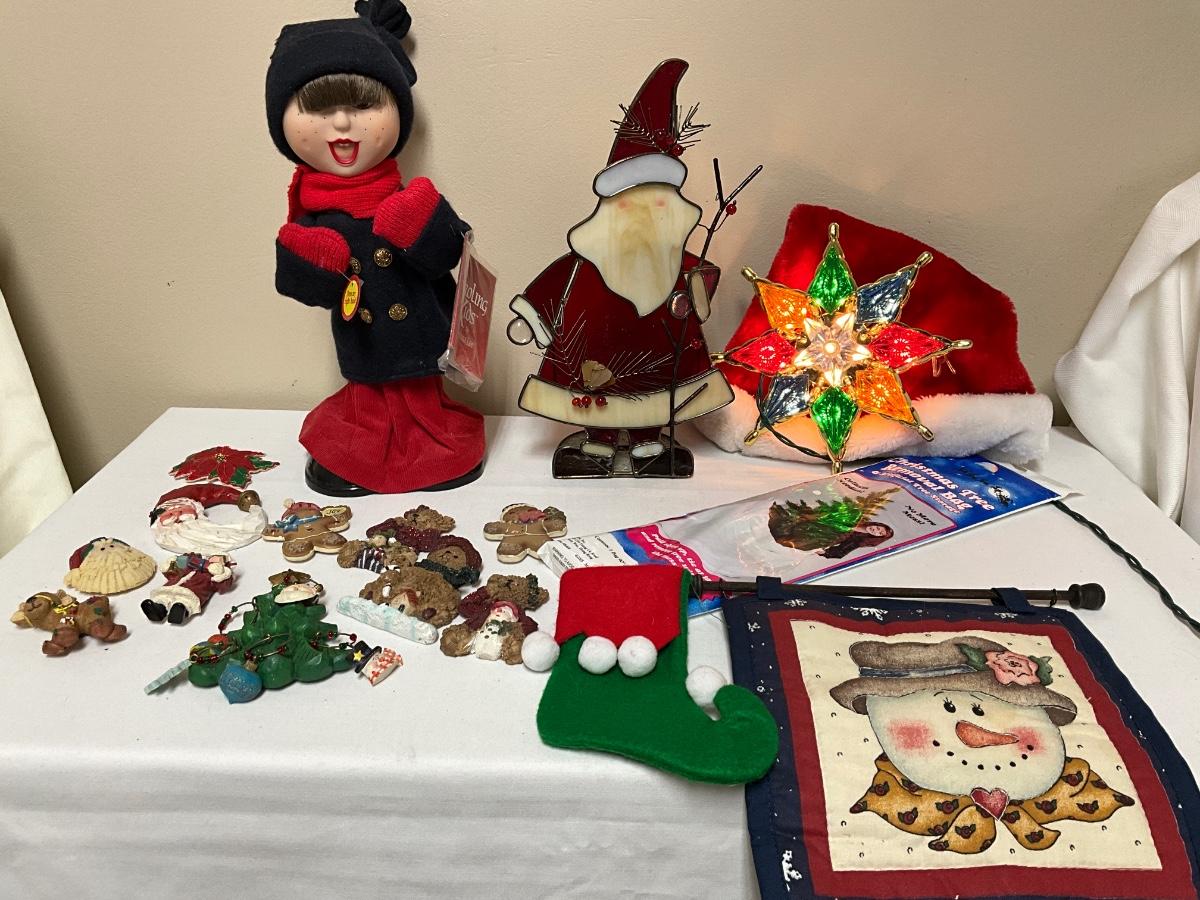 Caroling doll, stained glass Santa, tree top, fridge magnets, plus