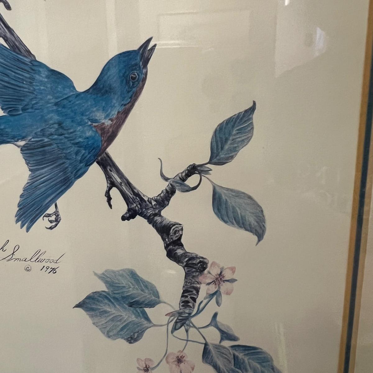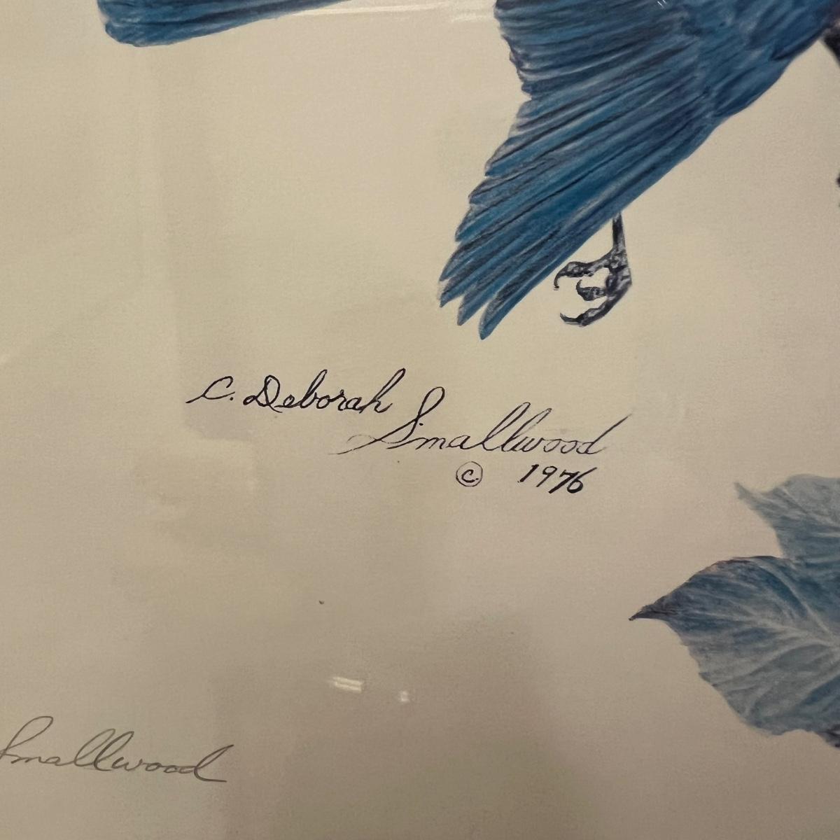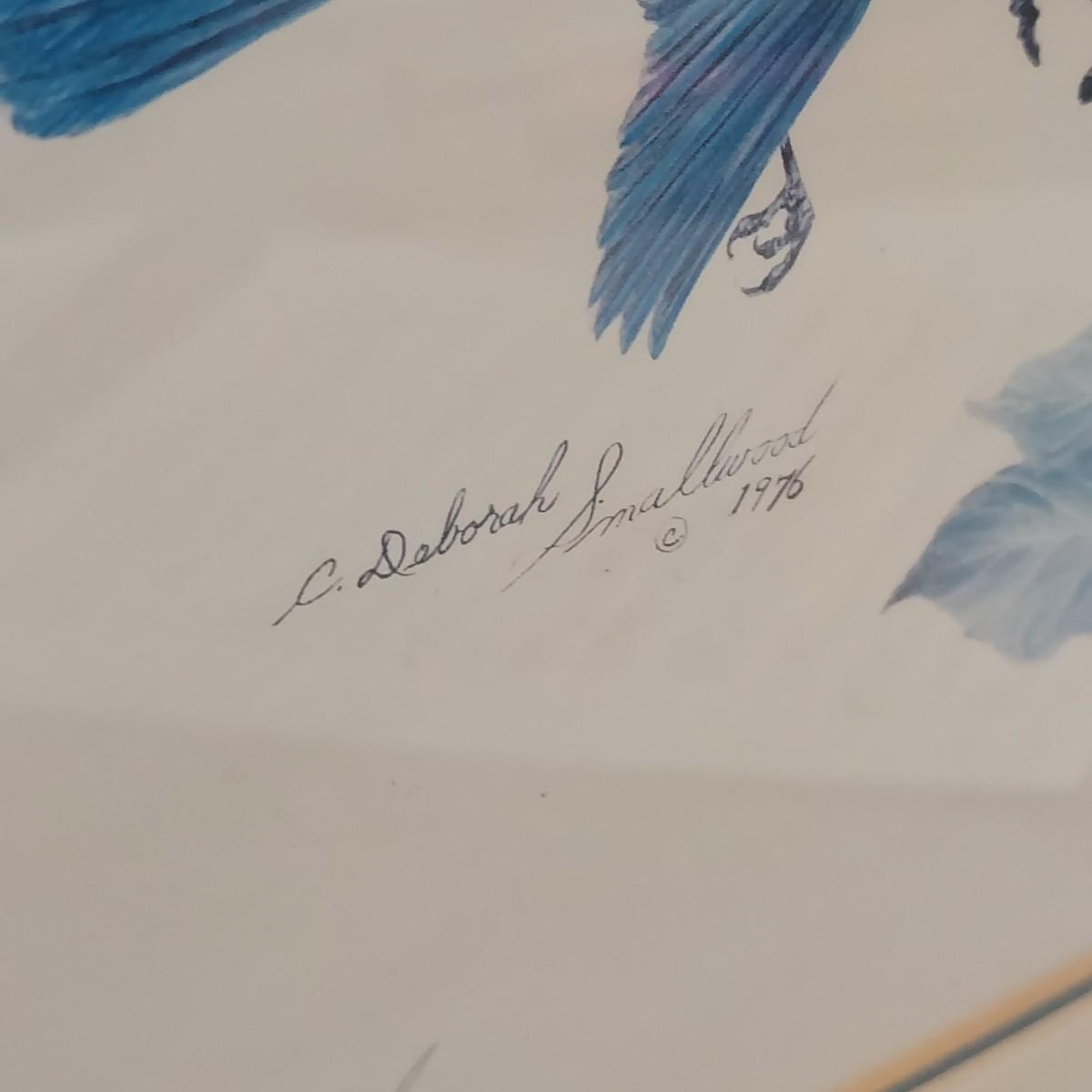 Framed Blue birds print is signed and numbered "318/500 Carolyn Deborah Smallwood". It measures 13.75” x 15.75”H. The frame is wood and the double matting cream and teal blue.