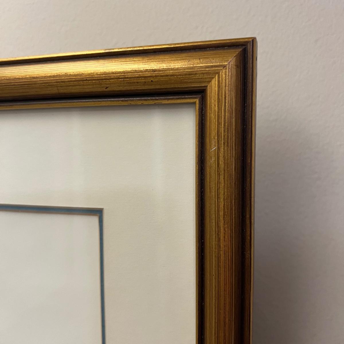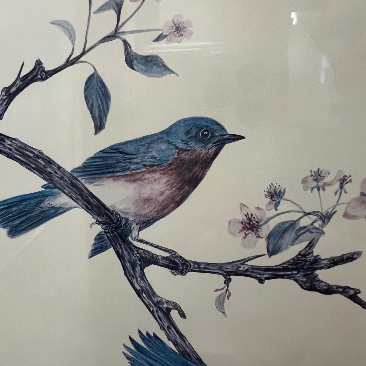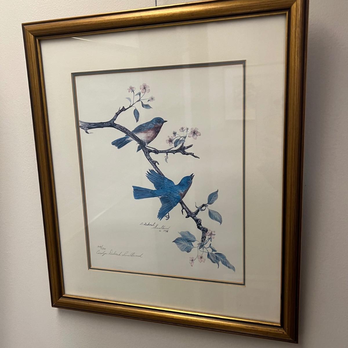 Framed Blue birds print is signed and numbered "318/500 Carolyn Deborah Smallwood". It measures 13.75” x 15.75”H. The frame is wood and the double matting cream and teal blue.