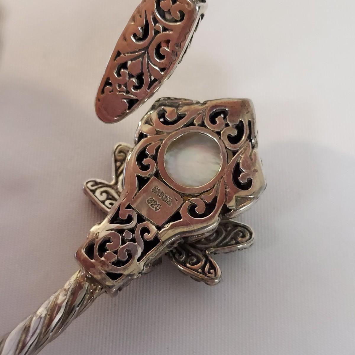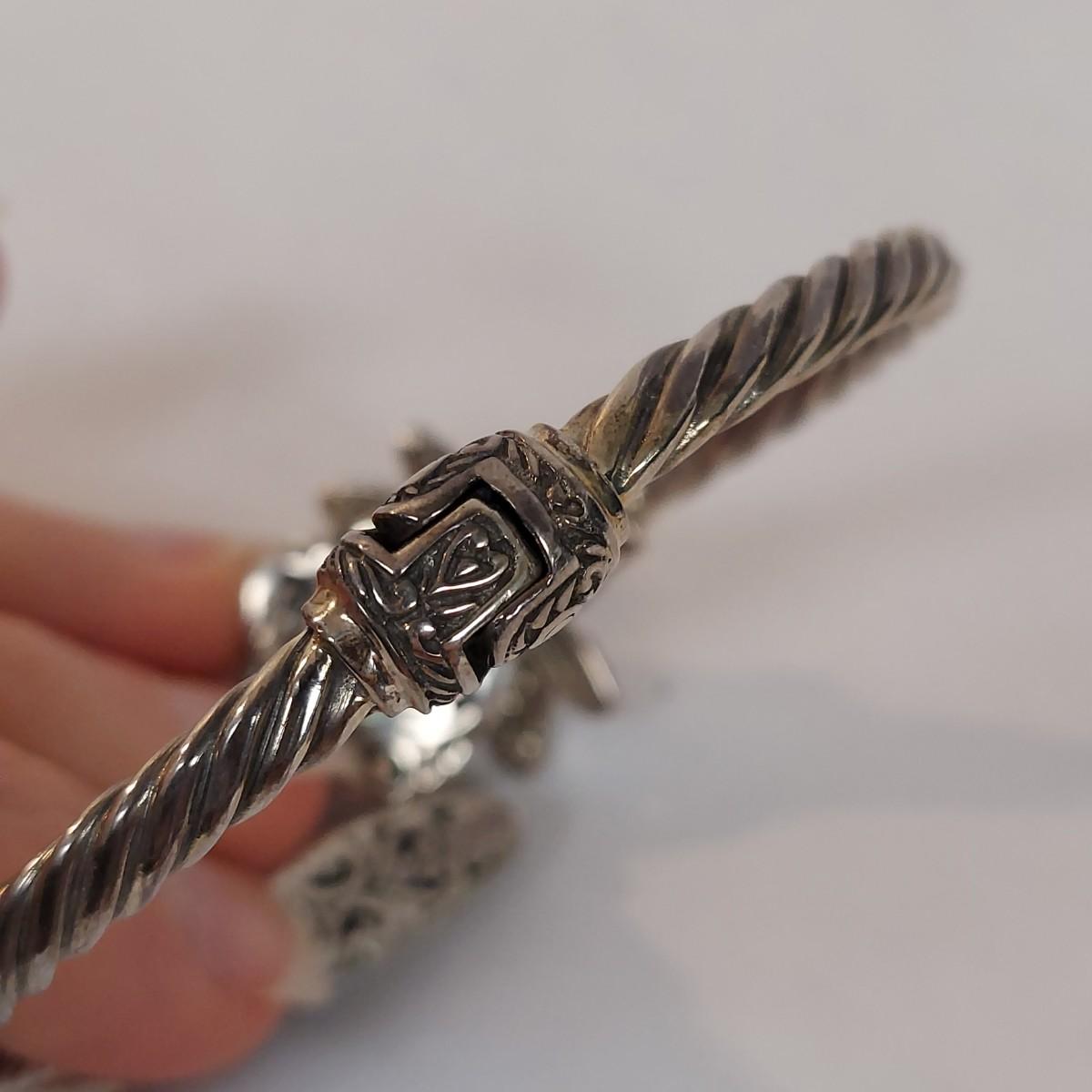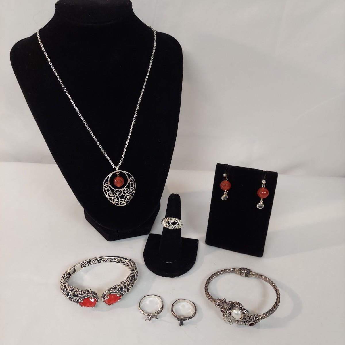 Several pieces of silver jewelry with ornate scrollwork. Lot includes one necklace, two bracelets, one pair of earrings for pierced ears and three rings. American West x Carolyn Pollack Sterling Silver Hinged Pear Gemstone Cuff, Dragonfly Twist Bangle and butterfly rings are stamped .925. Necklace is 18" long. All sales are final. No returns or refunds. Please bid accordingly.