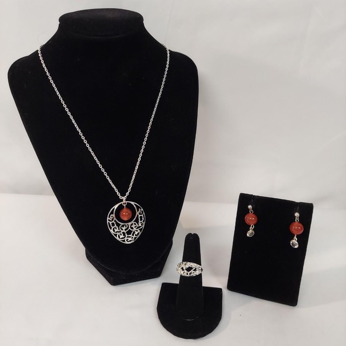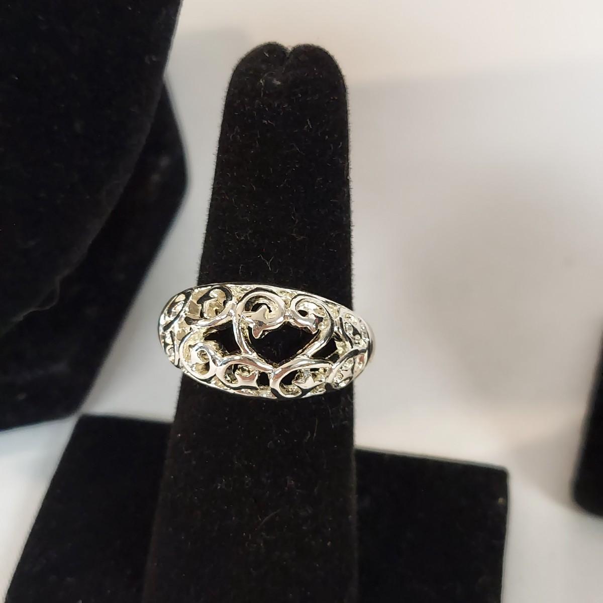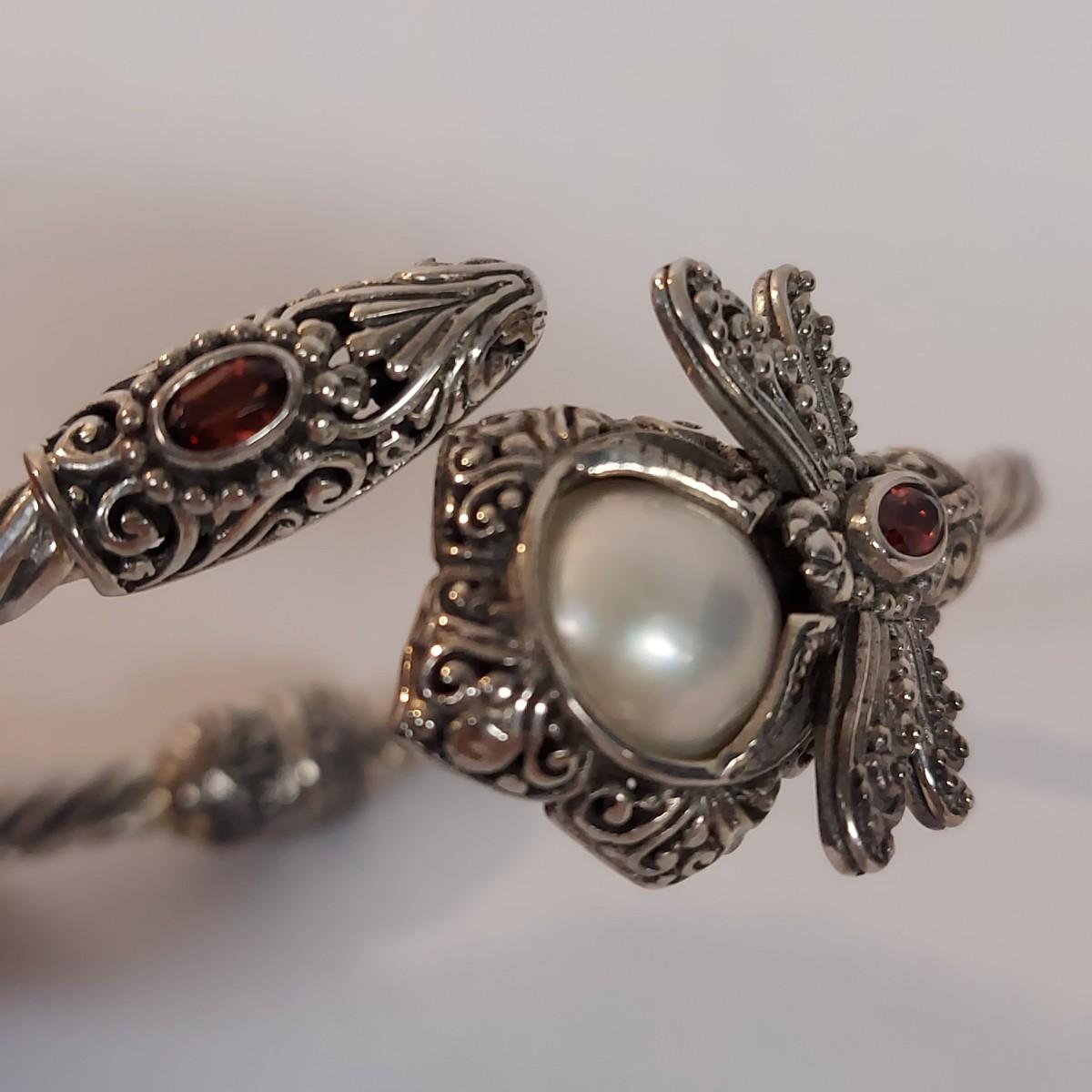 Several pieces of silver jewelry with ornate scrollwork. Lot includes one necklace, two bracelets, one pair of earrings for pierced ears and three rings. American West x Carolyn Pollack Sterling Silver Hinged Pear Gemstone Cuff, Dragonfly Twist Bangle and butterfly rings are stamped .925. Necklace is 18" long. All sales are final. No returns or refunds. Please bid accordingly.