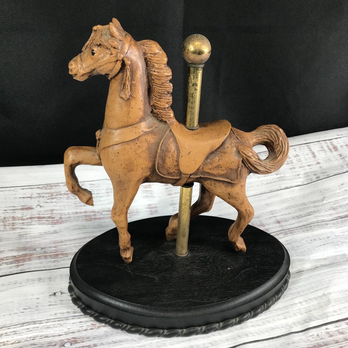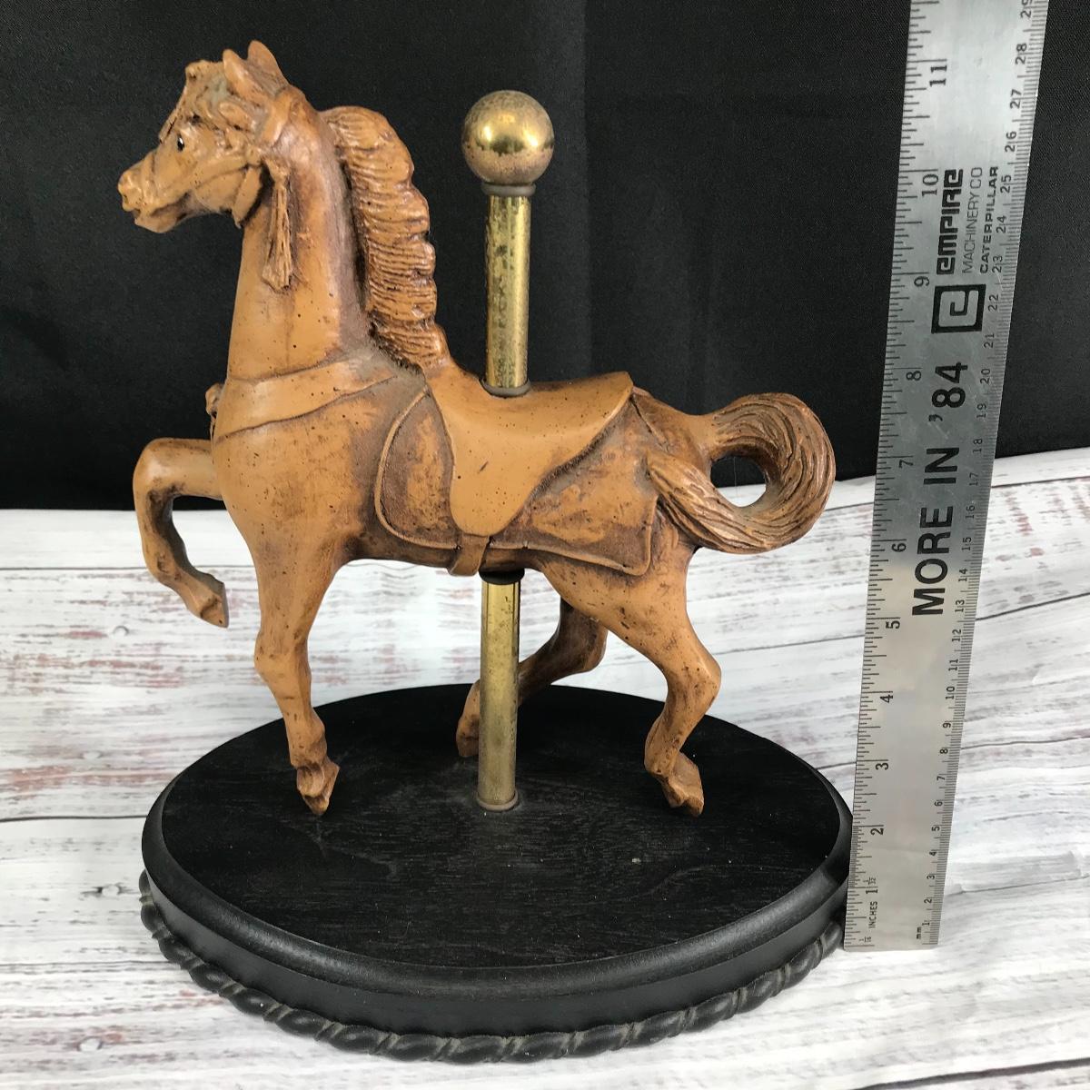 An 11 inch carousel horse figurine. Resin figure on metal pole top wooden base. Marked, “171 no holes“ on the bottom. See pictures.