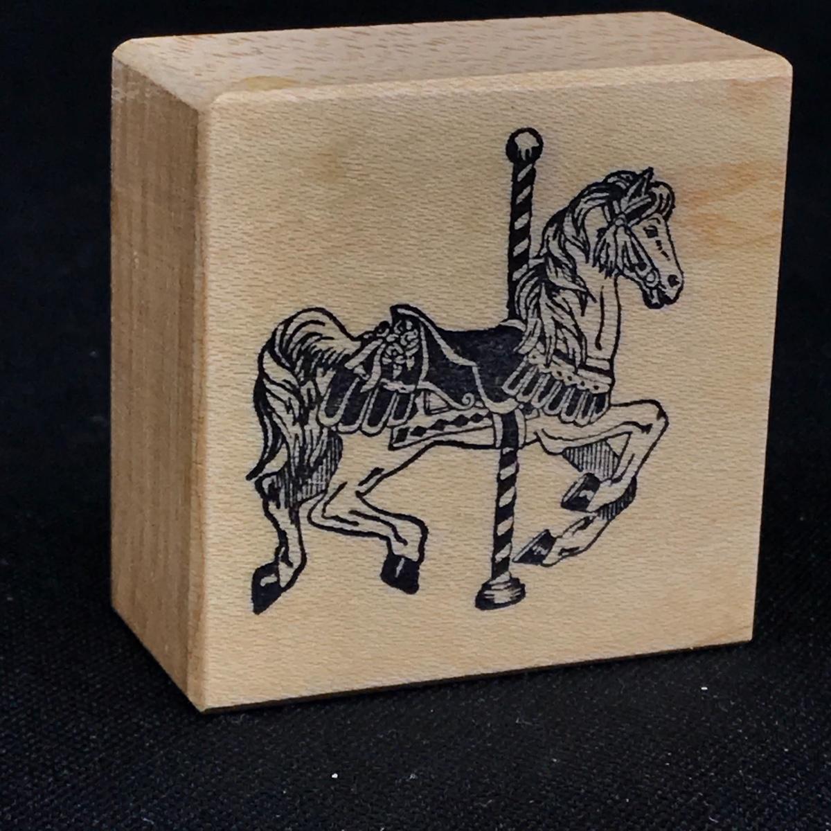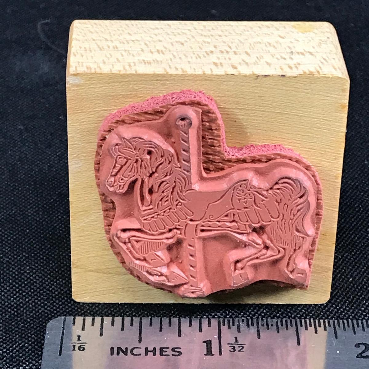 Up for auction is a rubber stamp depicting a carousel horse. It is made by PSX of Petaluma California. It has a model number of C-766 ; see pictures. Appears to be unused.