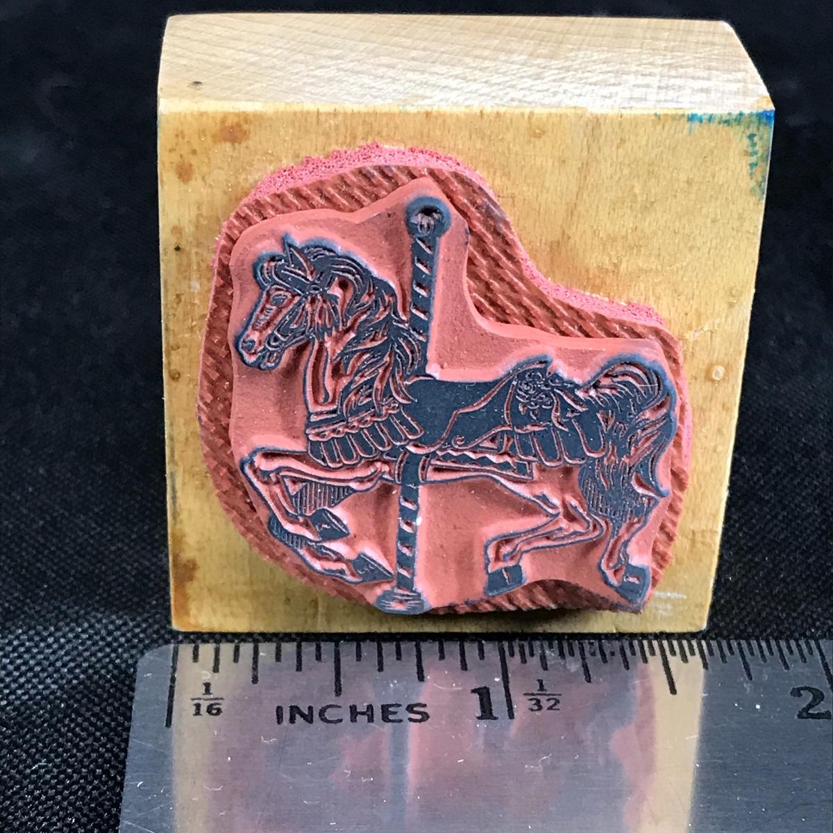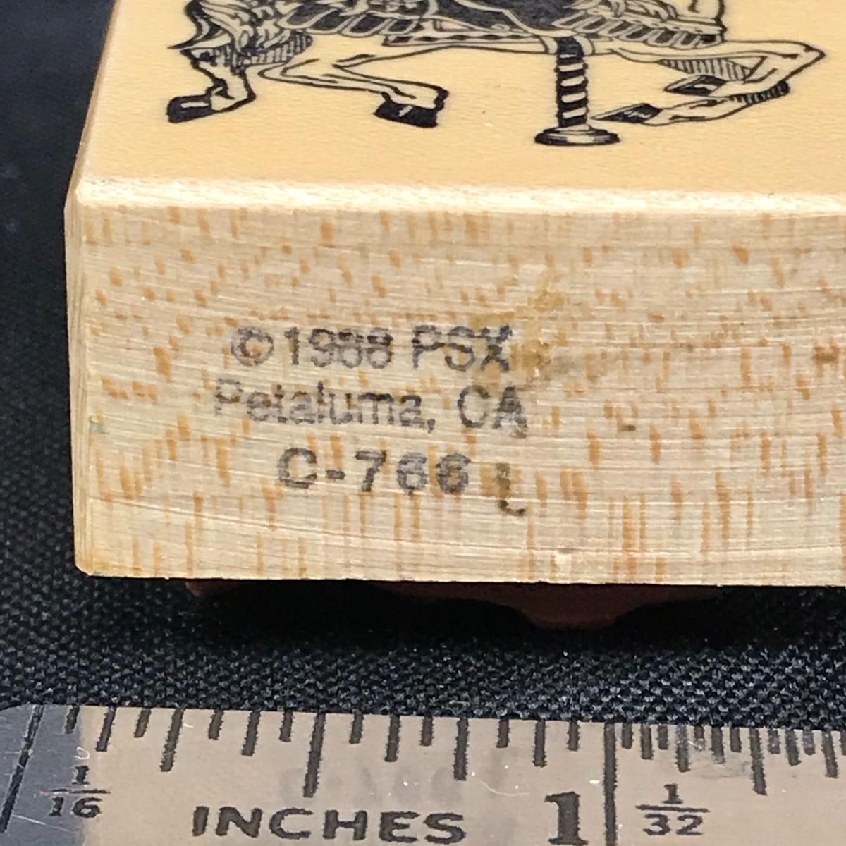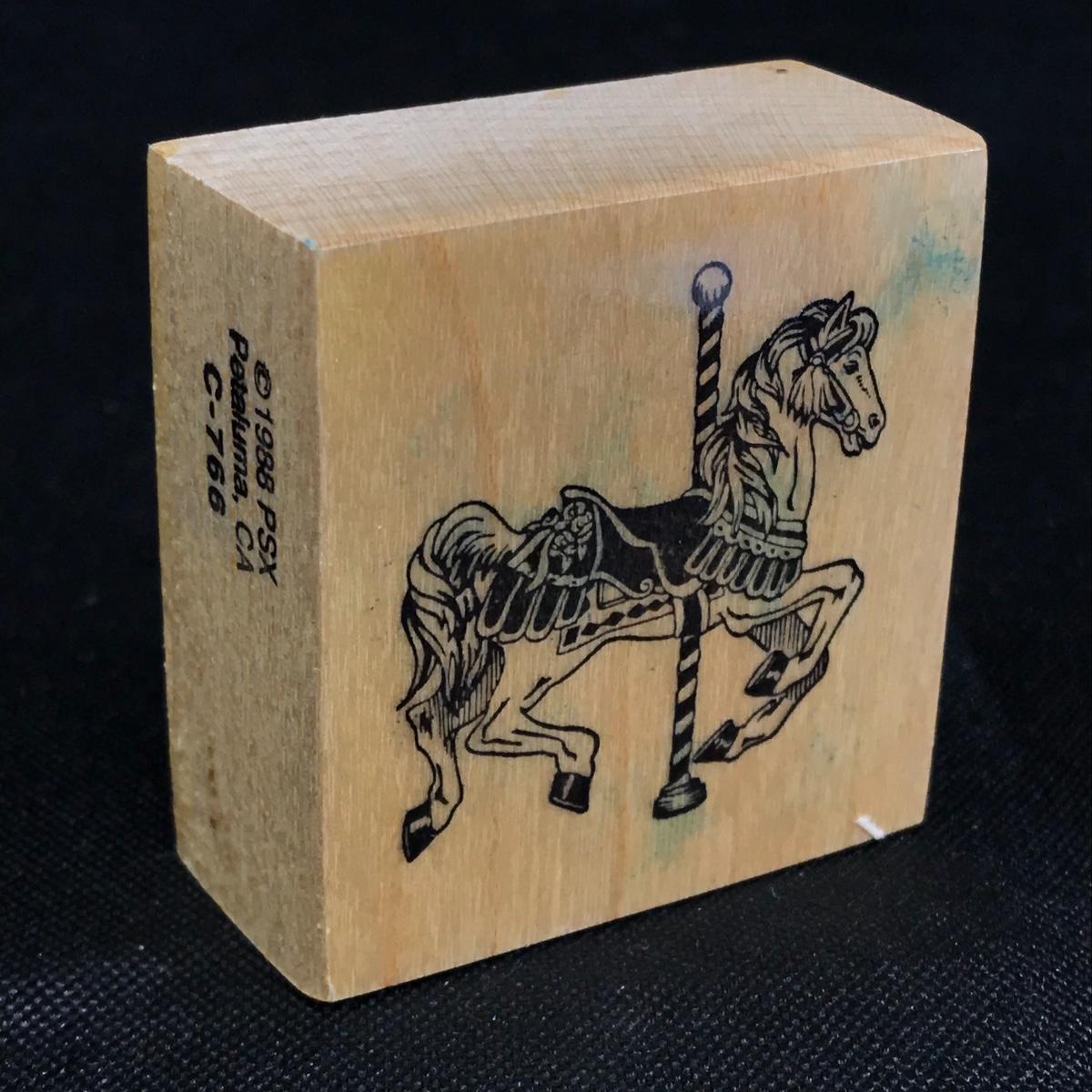 Up for auction is a rubber stamp depicting a carousel horse. It is made by PSX of Petaluma California. It has a model number of C-766 ; see pictures. Appears to be lightly used.
