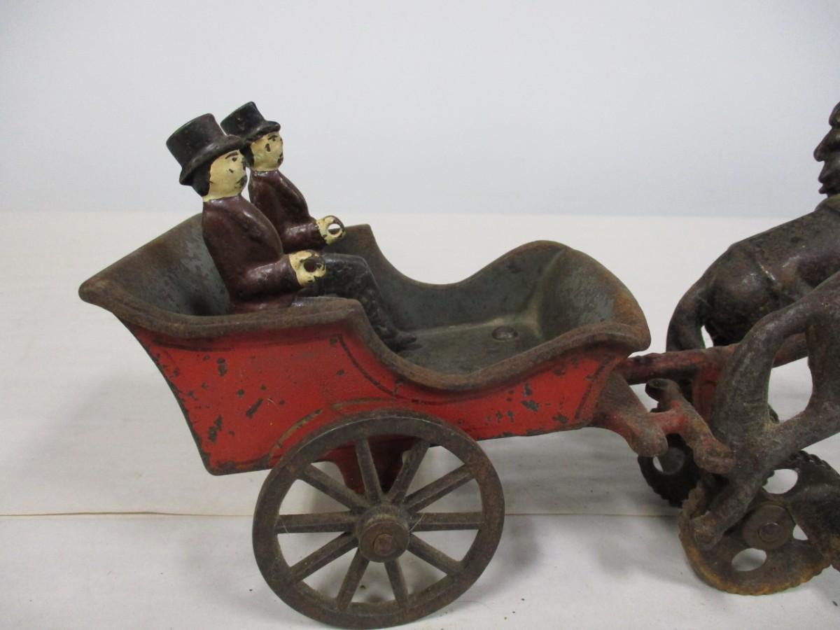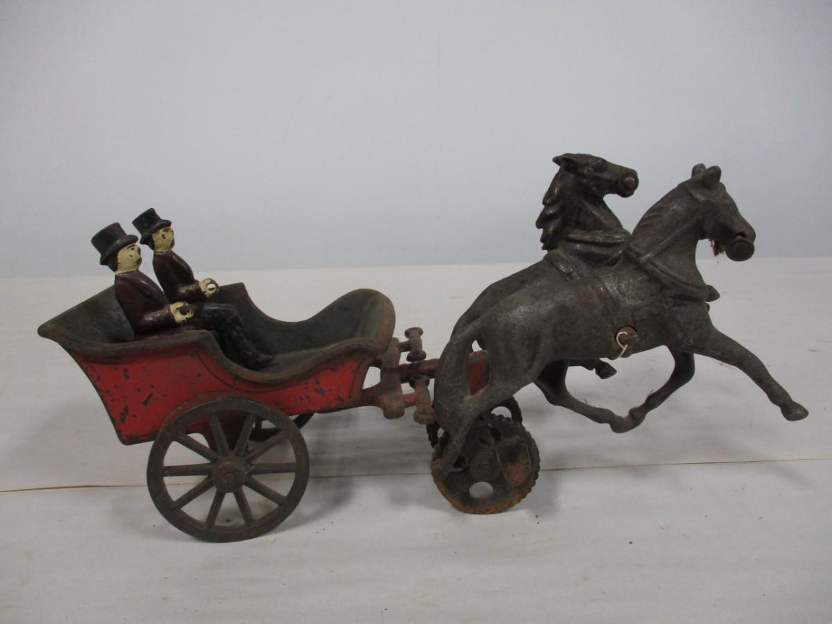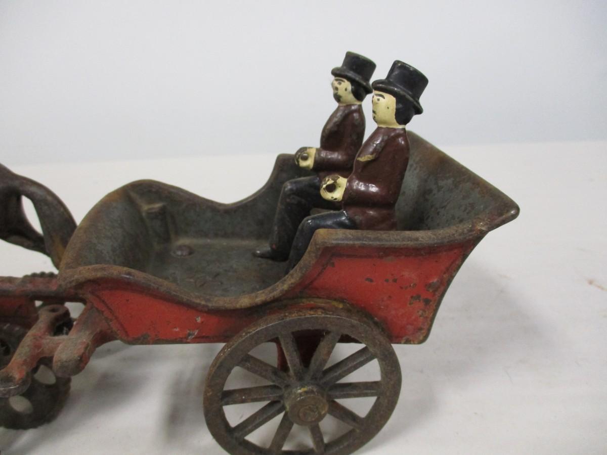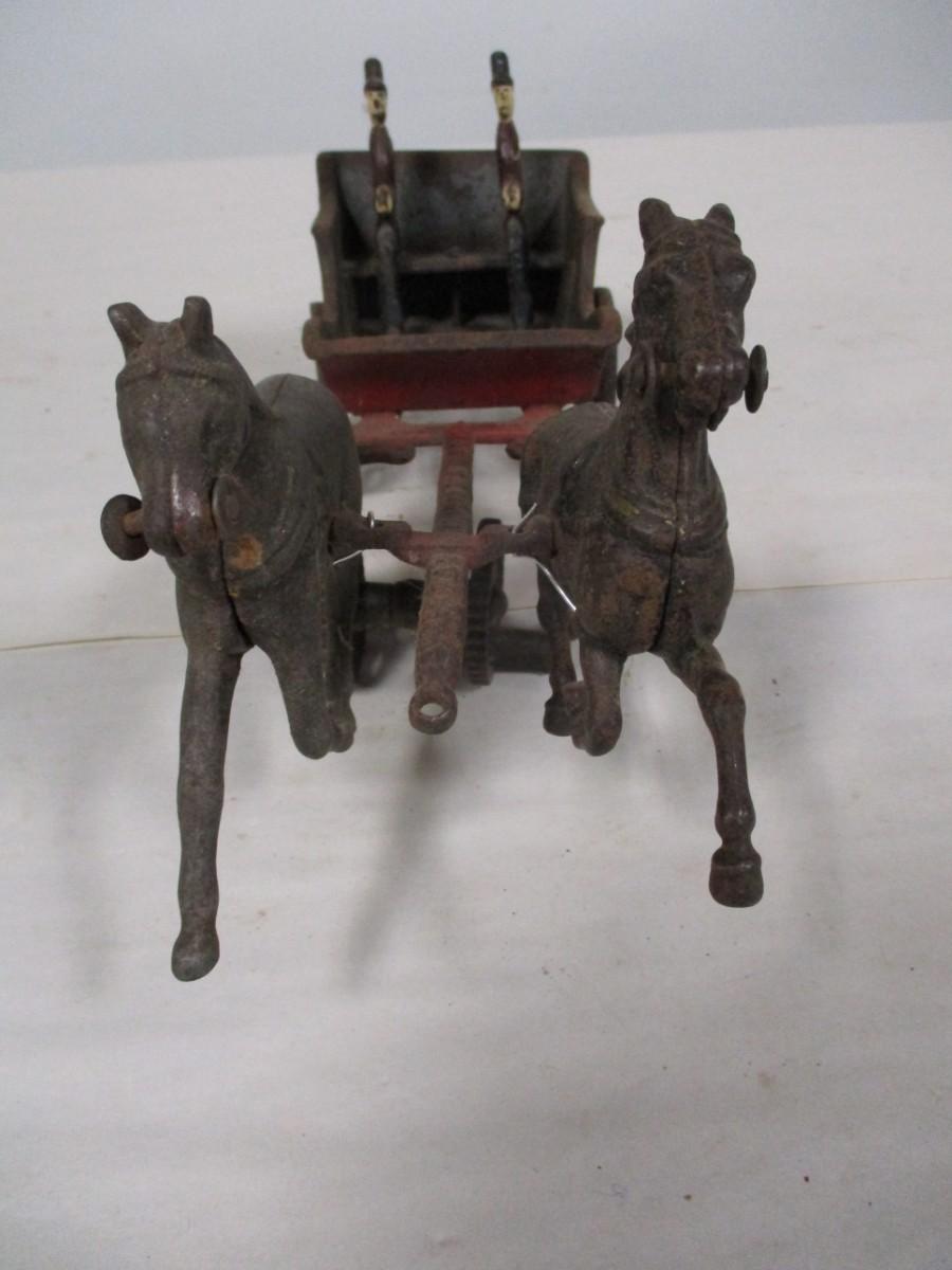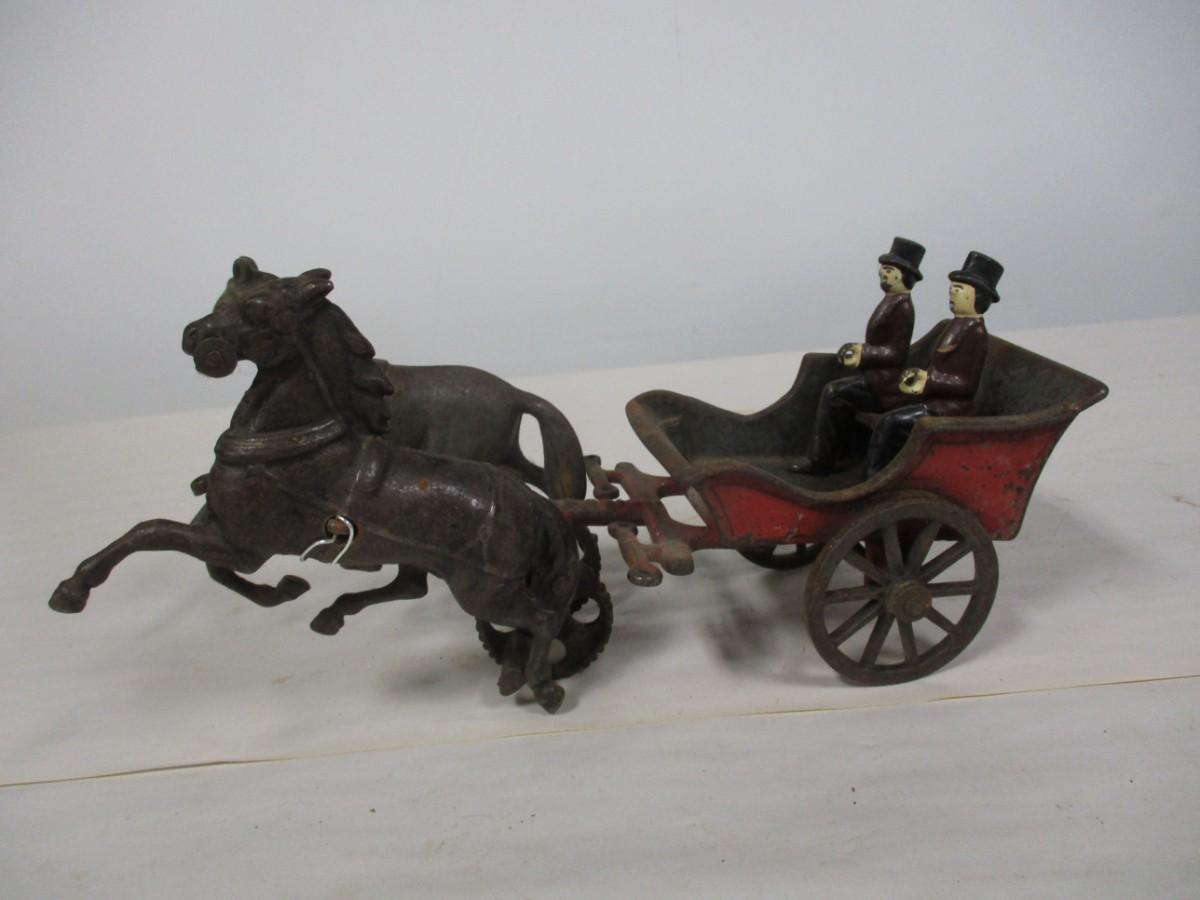 Vintage Carpenter Cast Iron Double Horse Team Drawn Surrey with Drivers