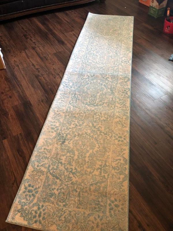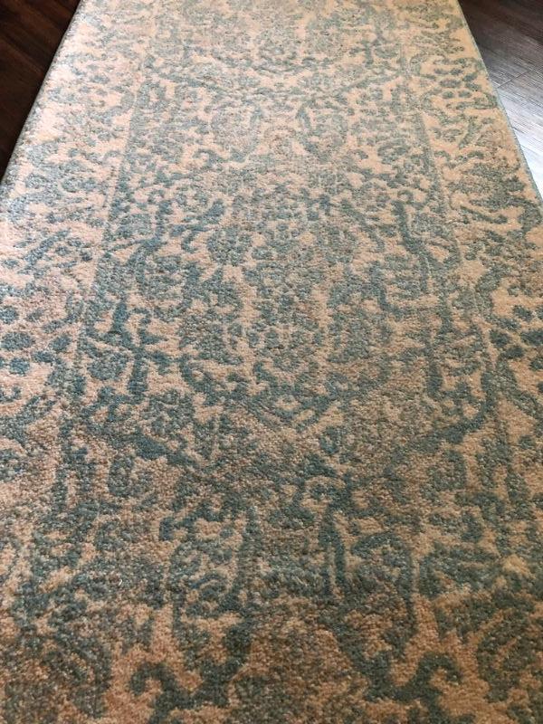 Blue and cream carpet runner in excellent condition. 2.2'x9'. **Please read Terms and Conditions before placing a bid. Pick up is Thursday, August 15, 2019 from 4pm to 7pm or Sunday, August 18 from 11am-2pm in Mullica Hill. All sales are final. All sales are as is, where is. Please review all photos. Any props included in photos are not included in listing. All measurements are approximate.