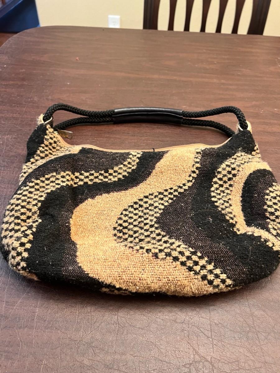 Unique vintage Carpetbags of America shoulder bag featuring a bold black-and-tan woven wave pattern. This style is known for its durable tapestry construction and artisan-made quality.