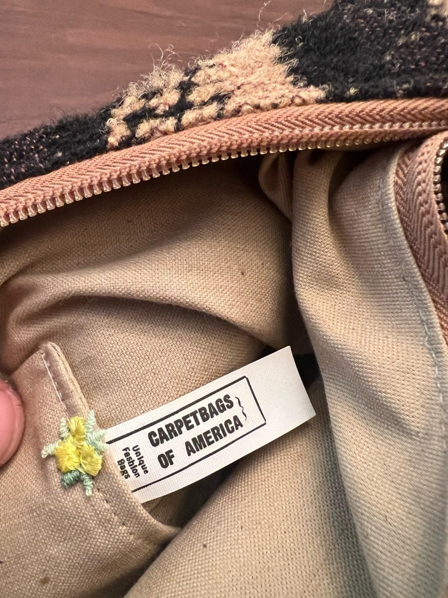 The interior is lined with a natural canvas fabric and includes the original “Carpetbags of America – Unique Fashion Bags” label.