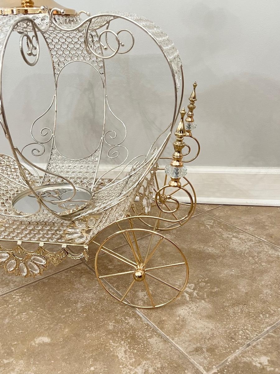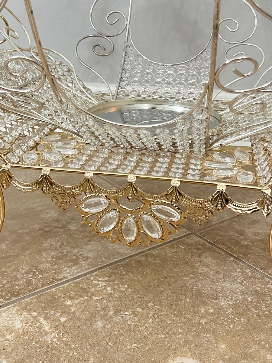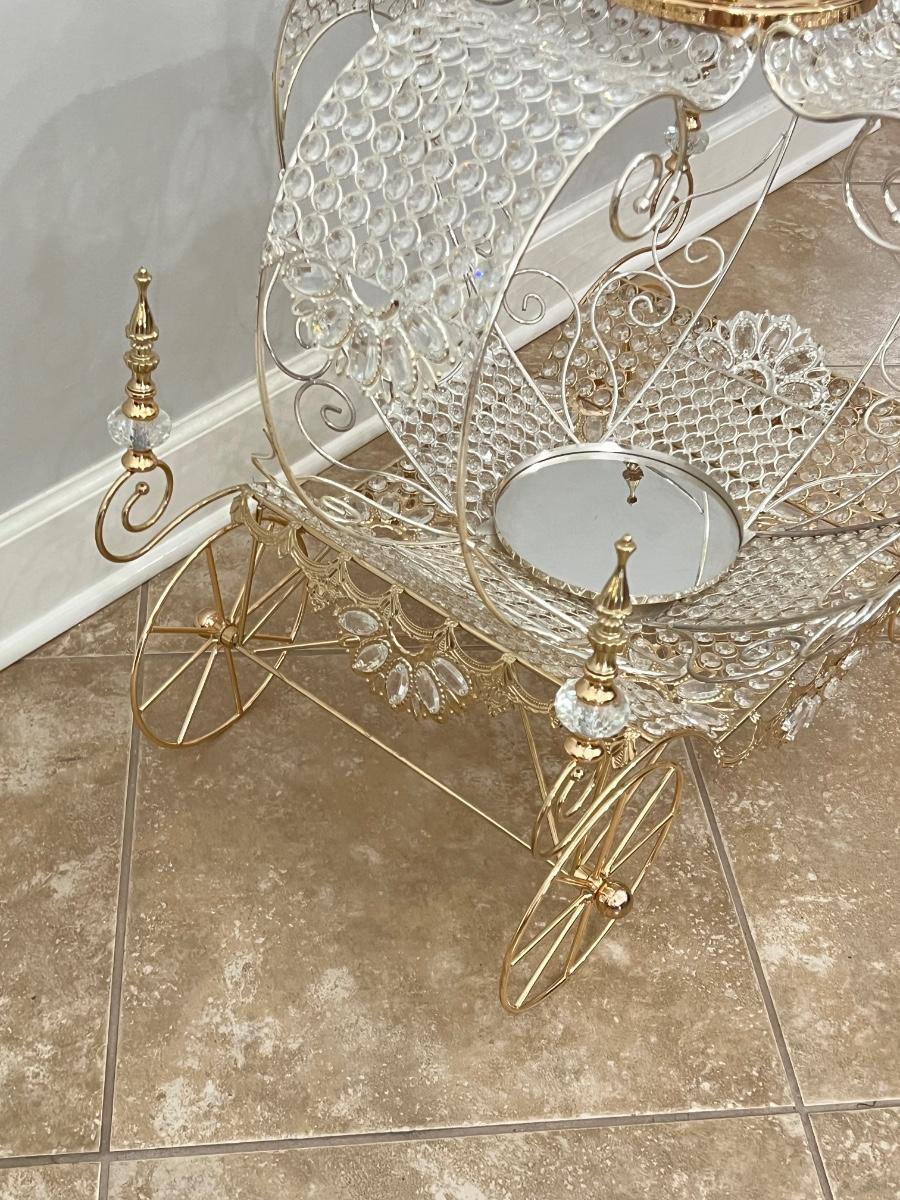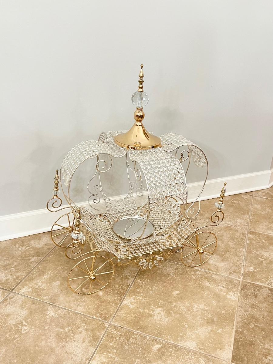 Carriage is silver & gold ~ Crystal piece is missing at the top & metal has wear, see photos ~ 36” H x 29” W x 24” D
