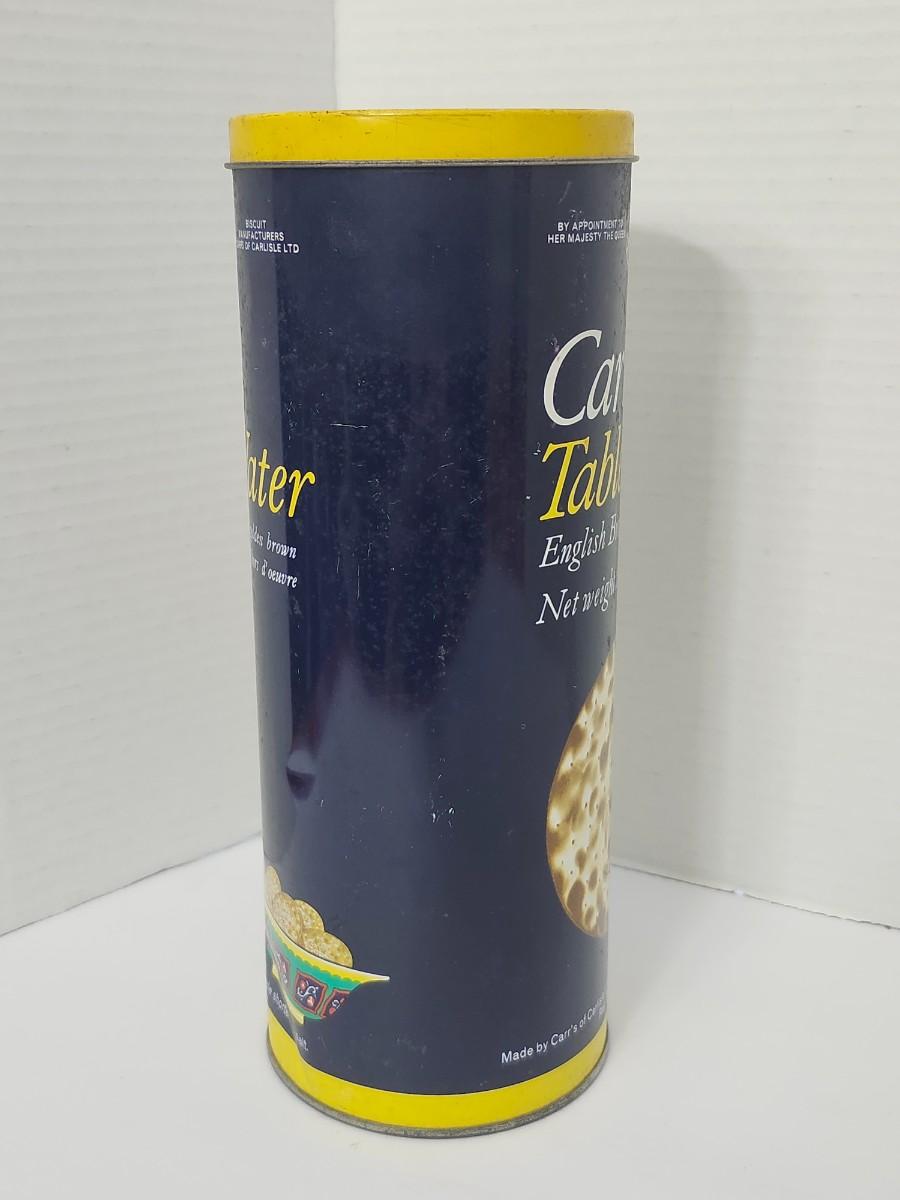 Tall cylindrical metal Carr’s Table Water biscuits tin featuring dark blue ground with yellow lid and base. Front displays royal warrant text “By Appointment to Her Majesty Queen Elizabeth The Queen Mother” and crest, with “Carr’s Table Water” branding and serving illustration with cheese and biscuits. Ingredient text visible along lower rim. Sold as an empty collectible tin with no food contents included. Description reflects only visible text and graphics.