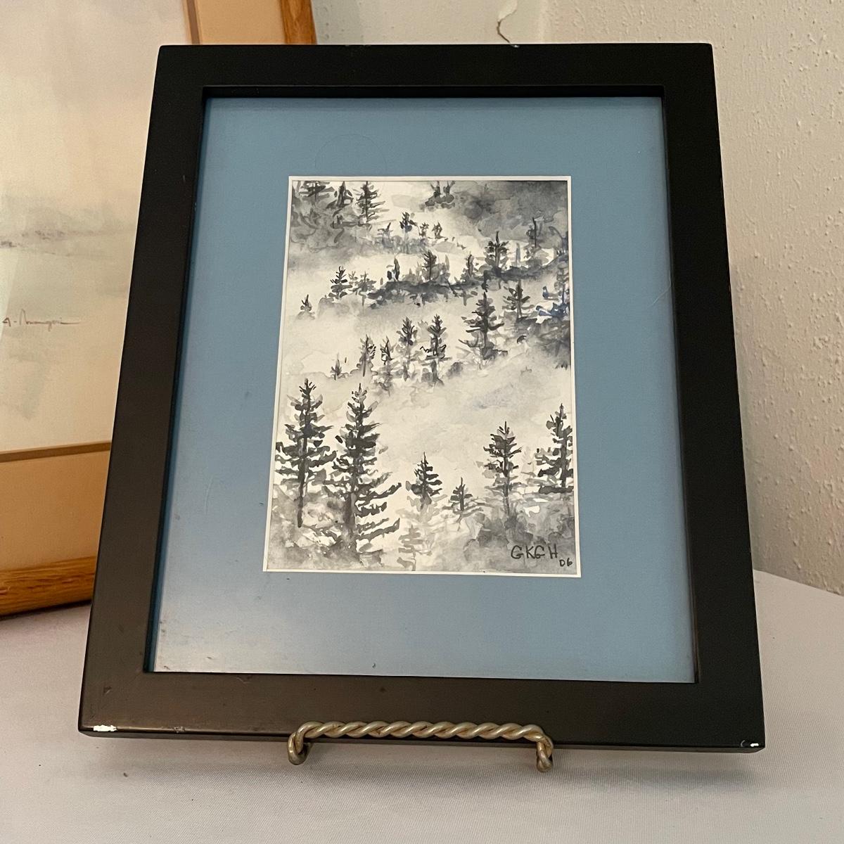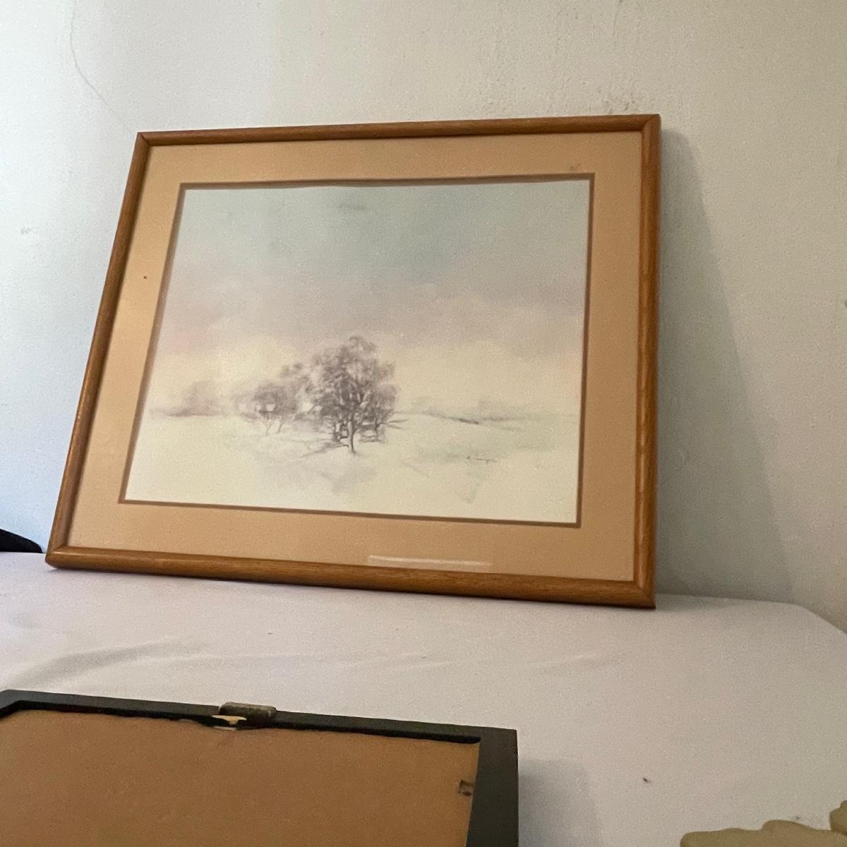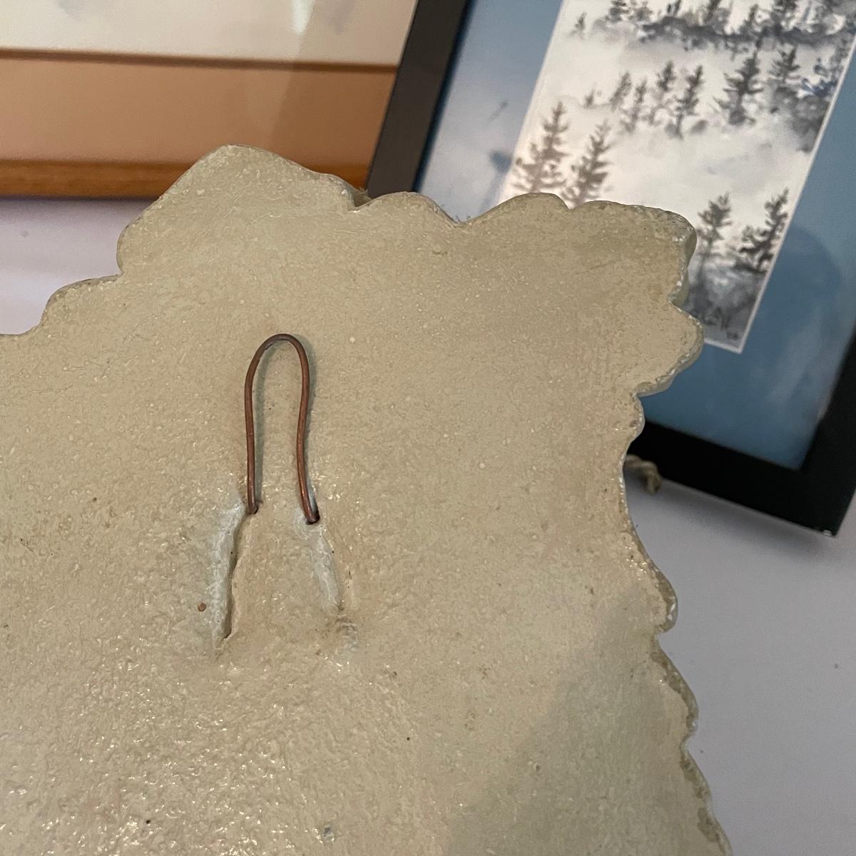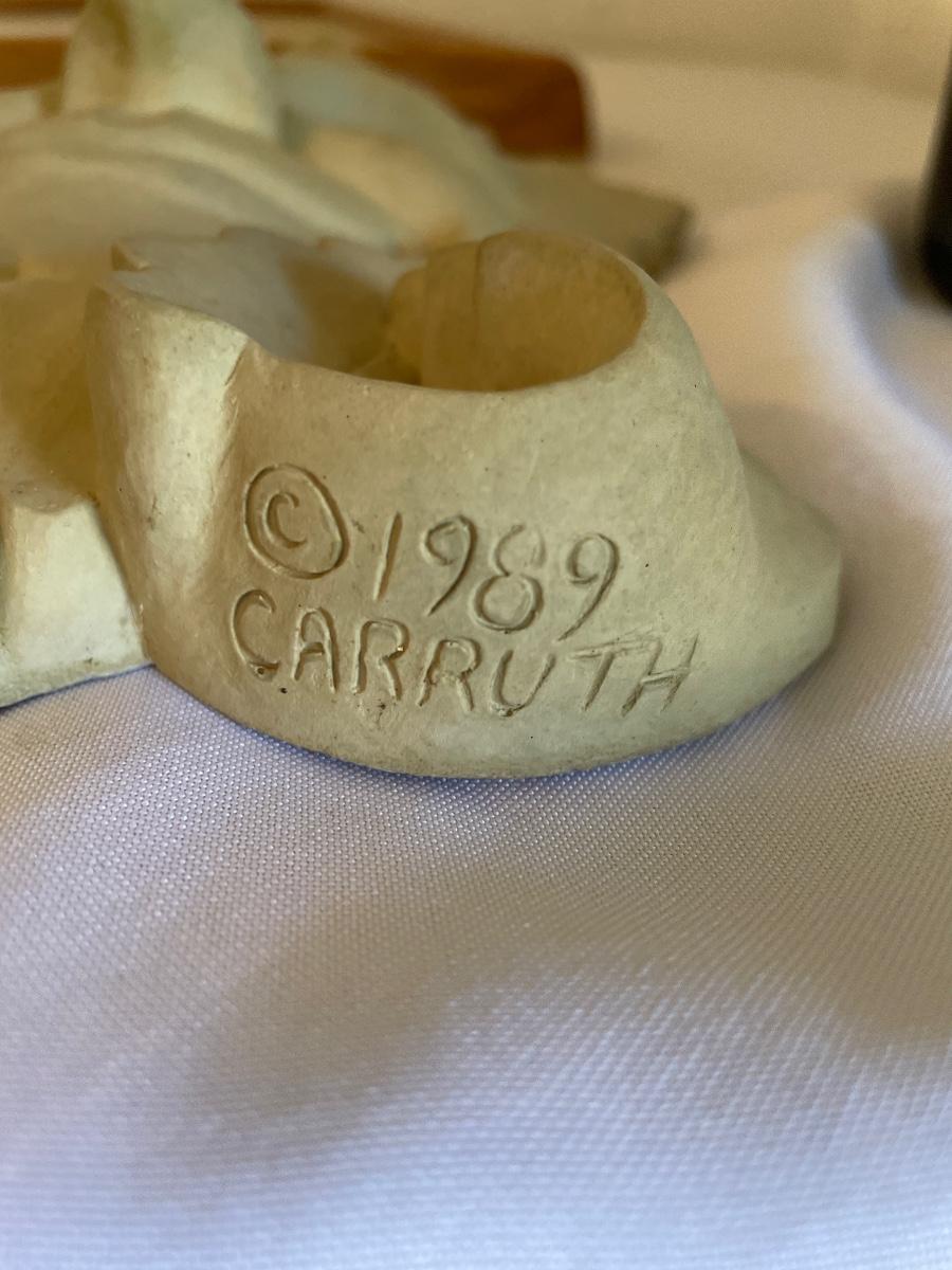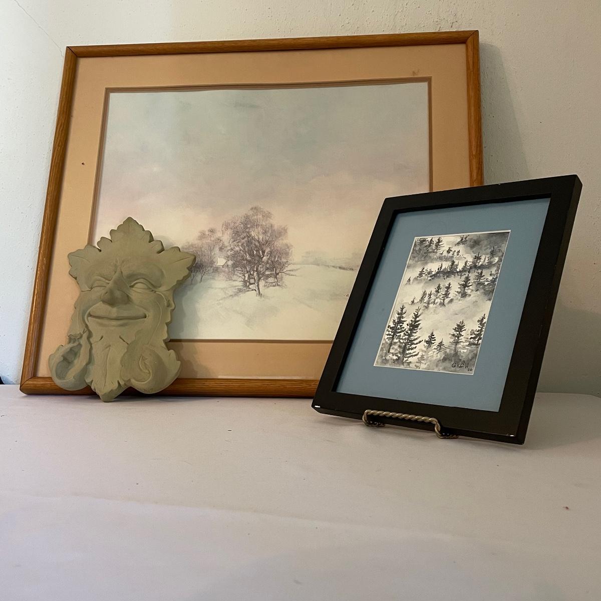 Both of the prints in this lot have signatures. The small watercolor is matted and mounted in a black frame that has a few scuff marks. The larger print appears to be pastels and it’s frame is a natural wood. Also included is a Carruth’s aged stone plaque that is their signature “˜Garden Smile’ face, it measures 7.5” x 11”.