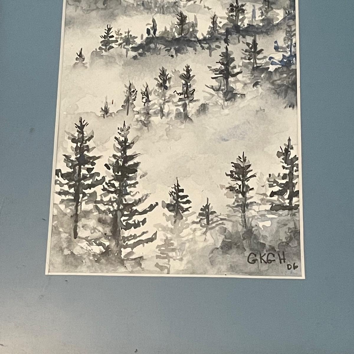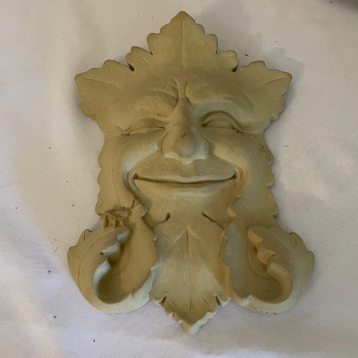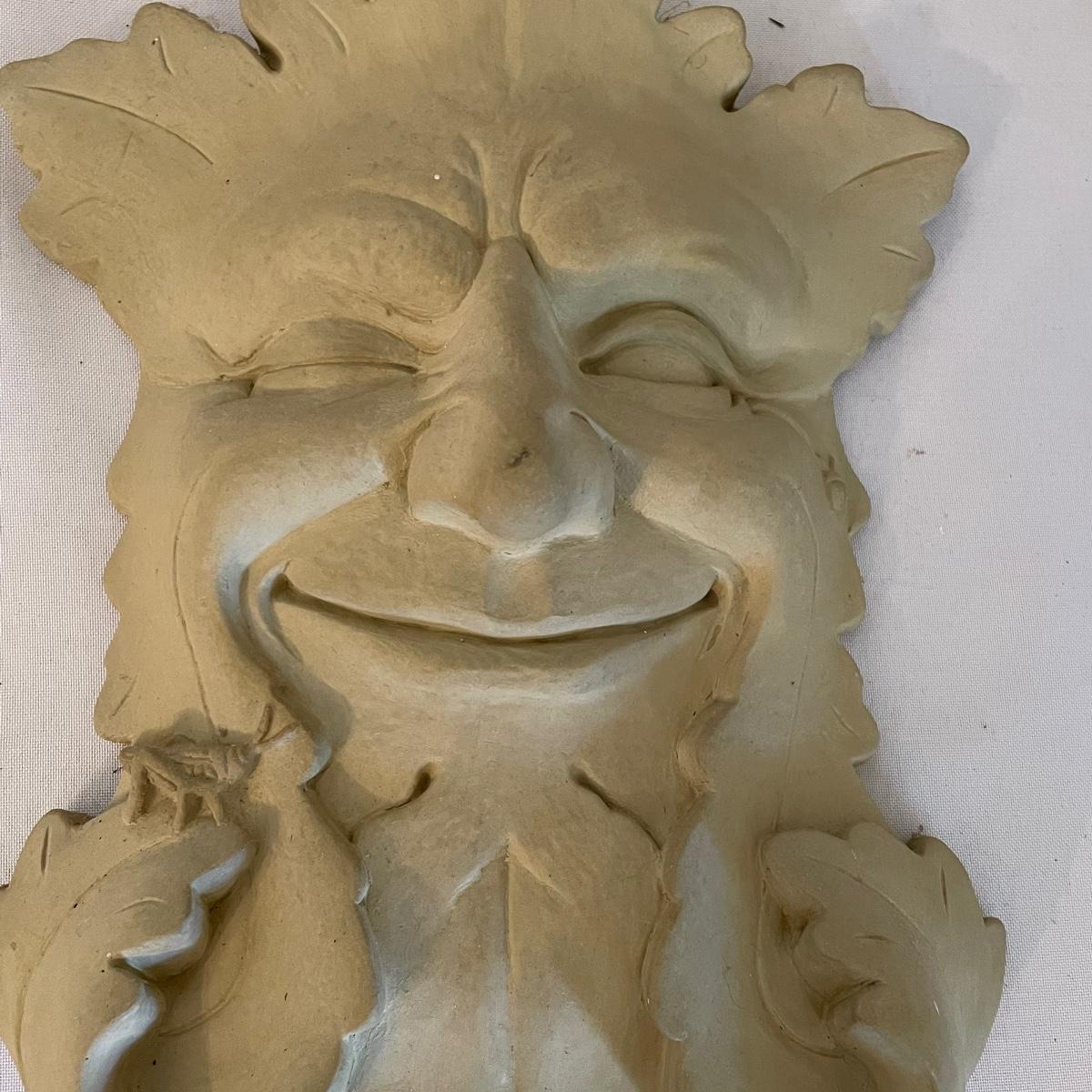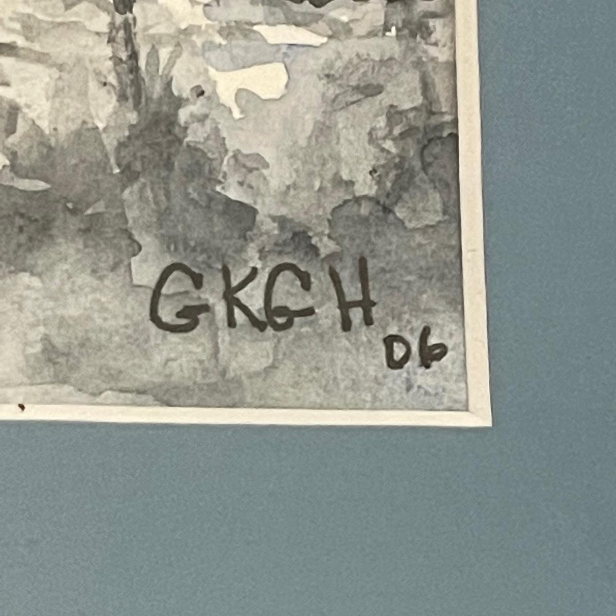 Both of the prints in this lot have signatures. The small watercolor is matted and mounted in a black frame that has a few scuff marks. The larger print appears to be pastels and it’s frame is a natural wood. Also included is a Carruth’s aged stone plaque that is their signature “˜Garden Smile’ face, it measures 7.5” x 11”.
