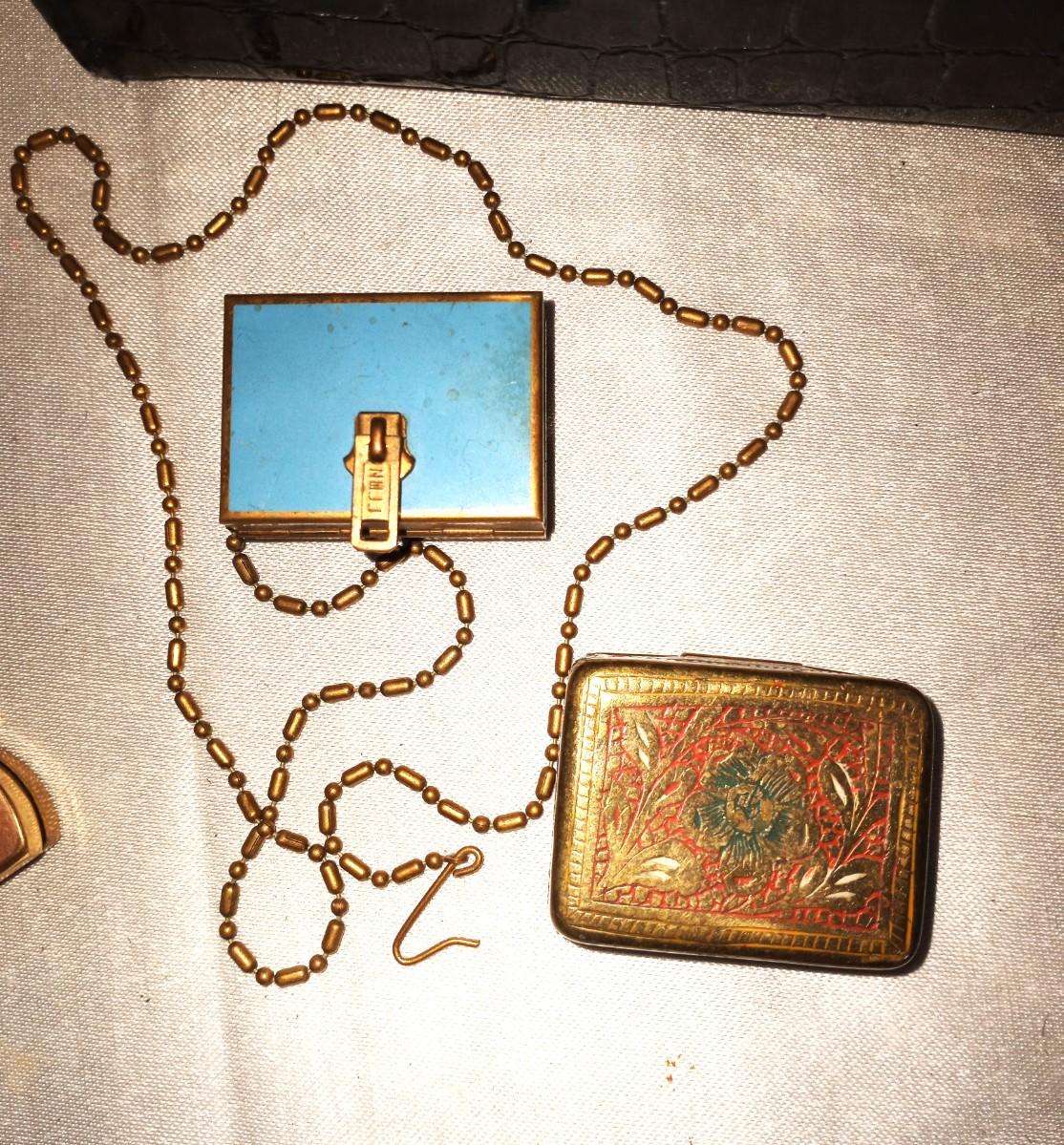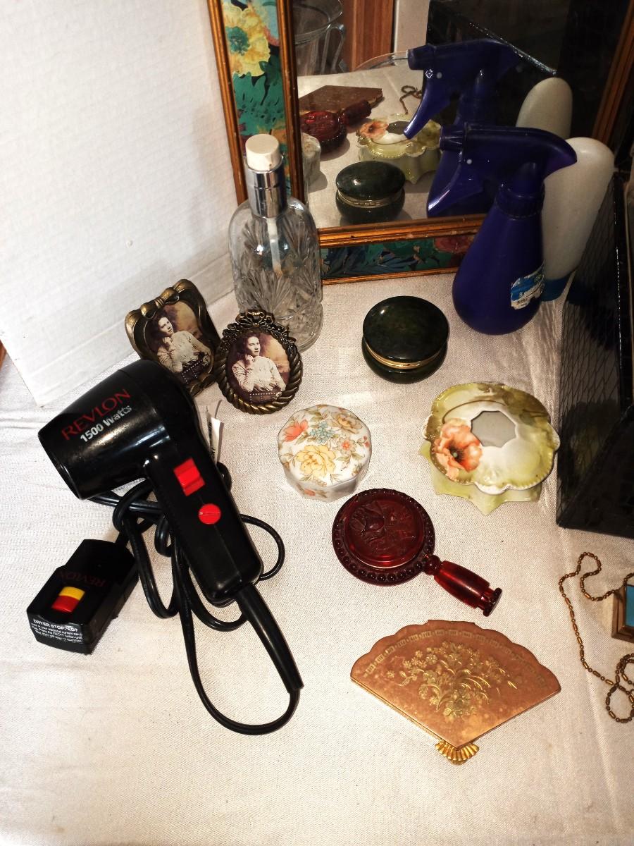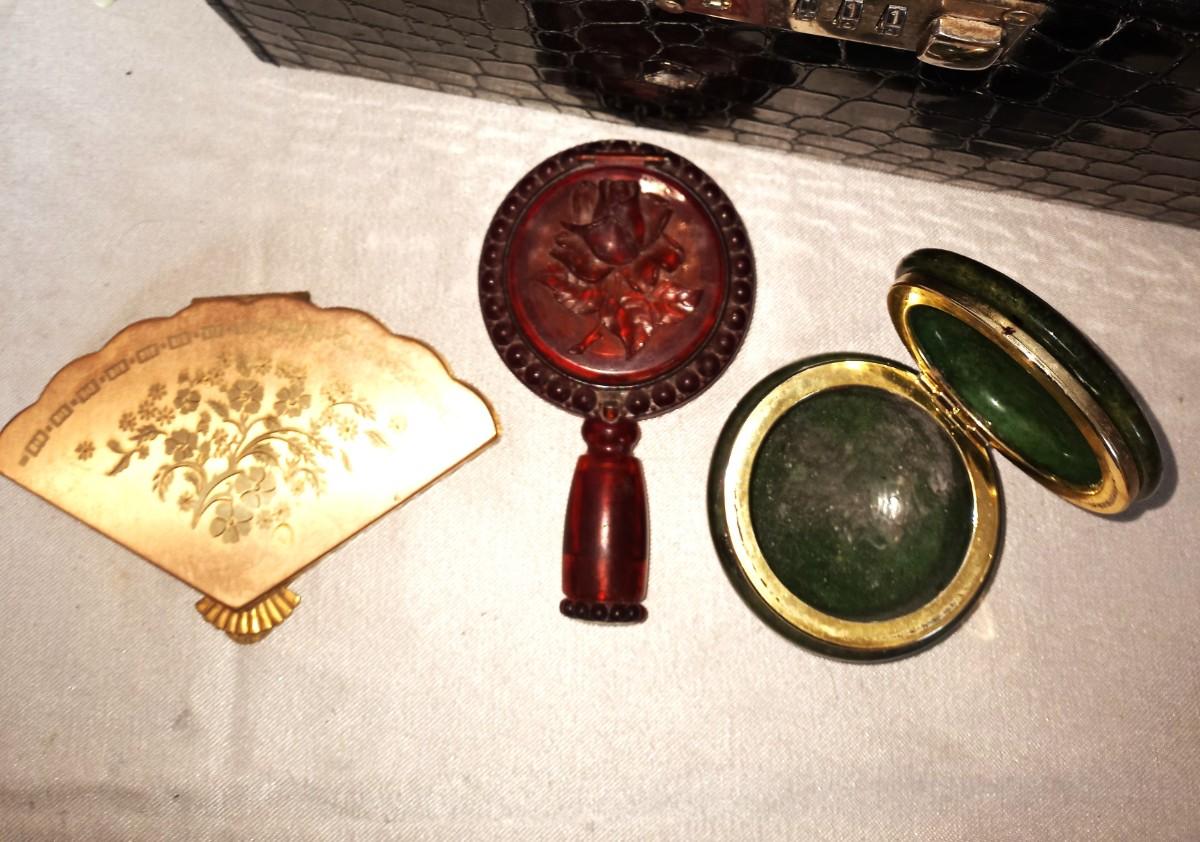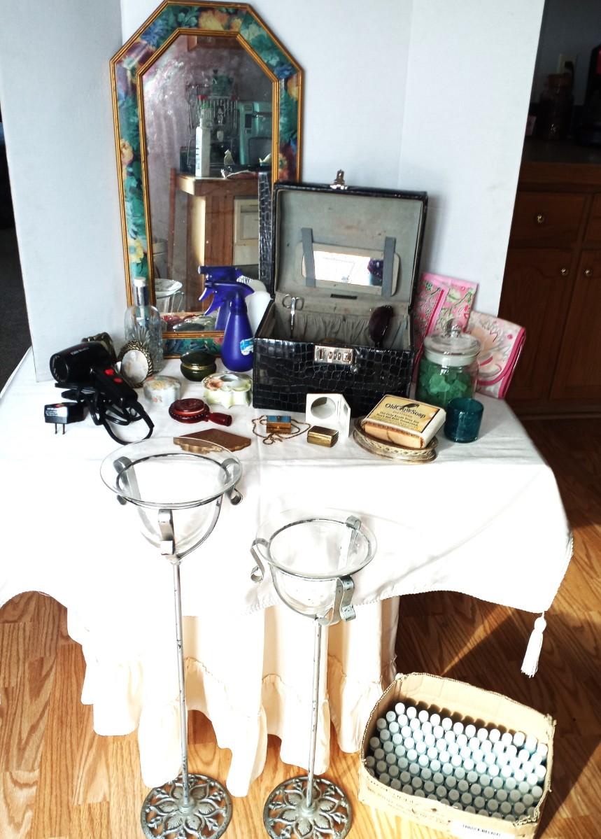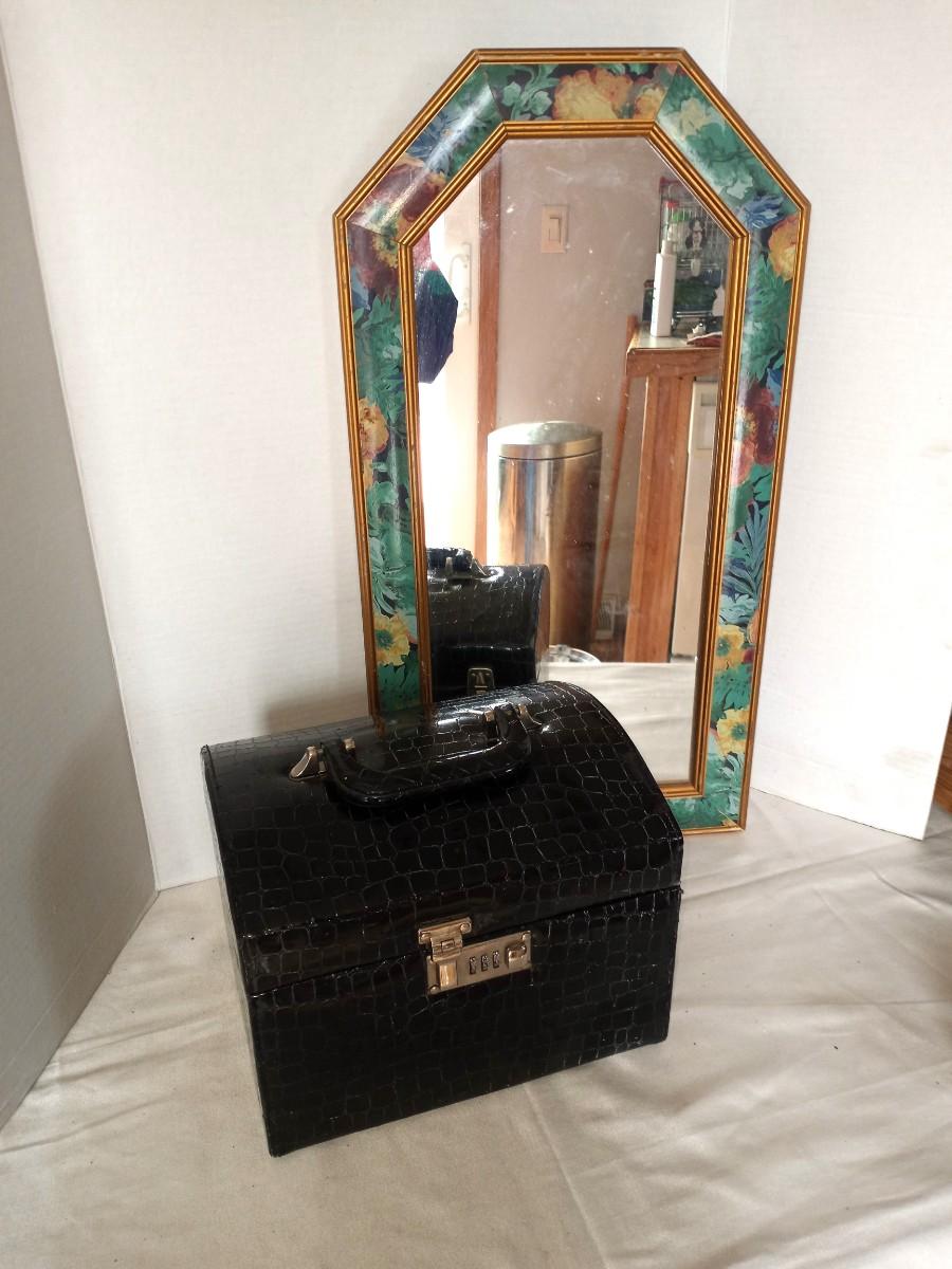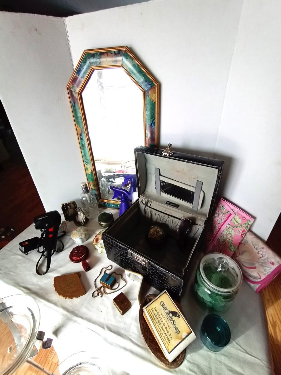 BLACK VINAL CARRY CASE-MIRROR MEASURES 13X24"-2 PORCELIAN TRINKET BOXES-VINTAGE TRINKET & COMPACTS-CANDLE HOLDERS TALLEST STANDS 28"-OTHER BEAUTY ITEMS