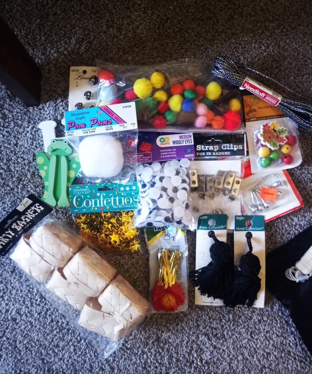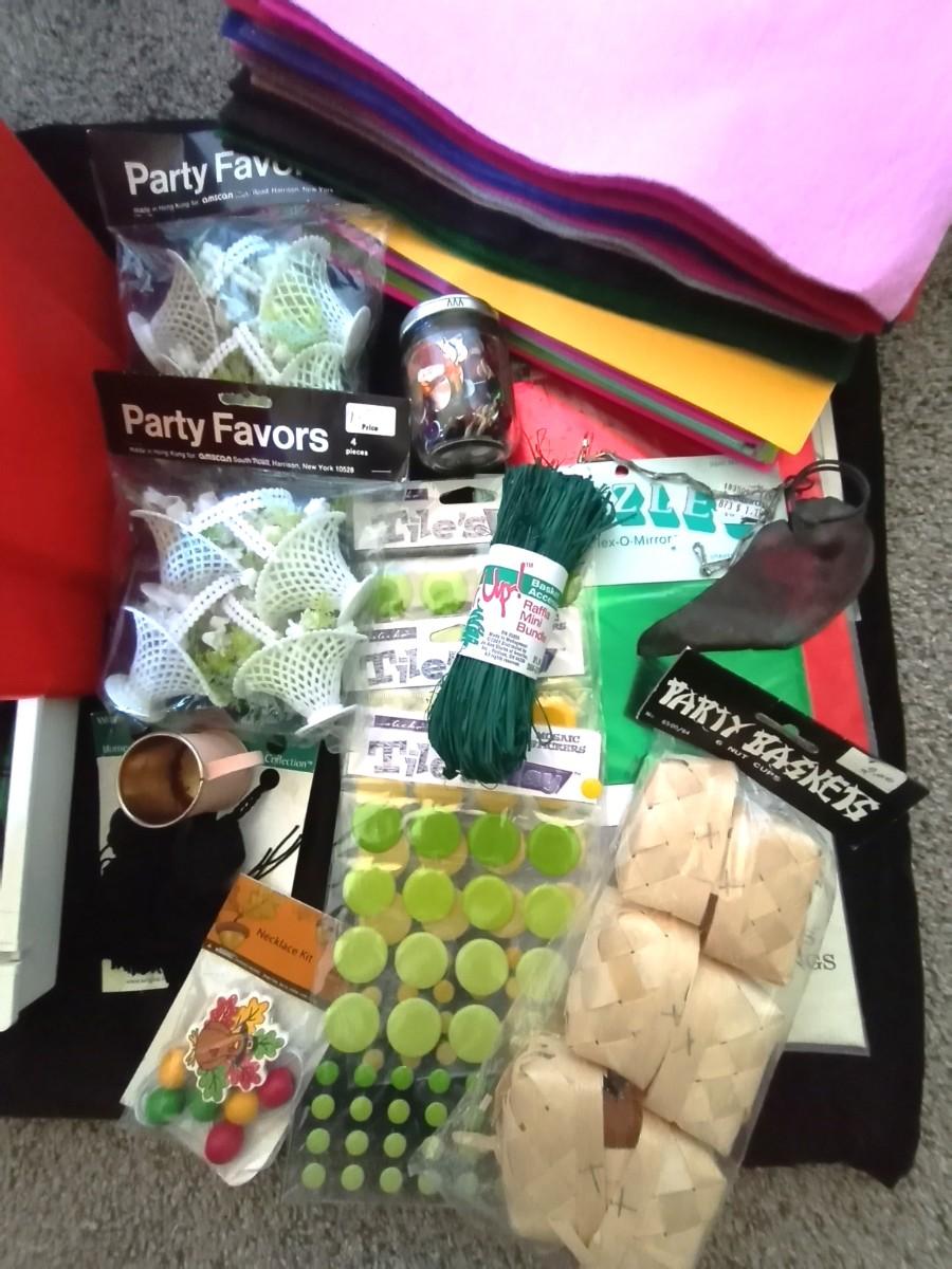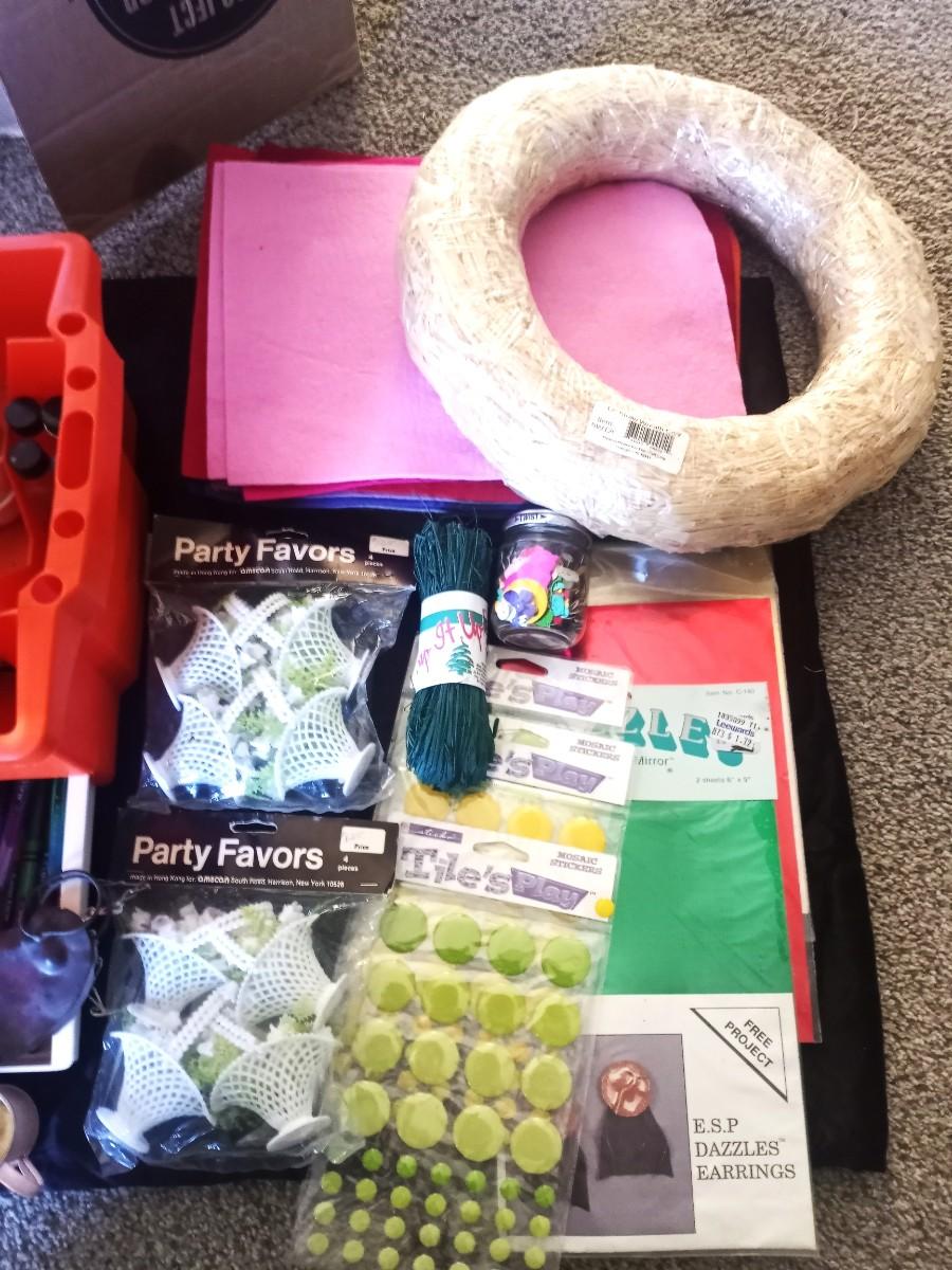 LARGE QUANTITY OF CRAFTING ITEMS IN A COOL CARRY TOTE-RIBBON-FEATHERS-FELT-COLORED PIPE CLEANERS-COLORED PAPER AND SO SO MUCH MORE