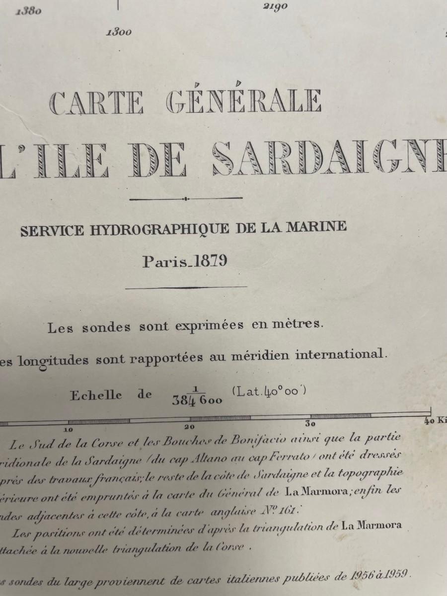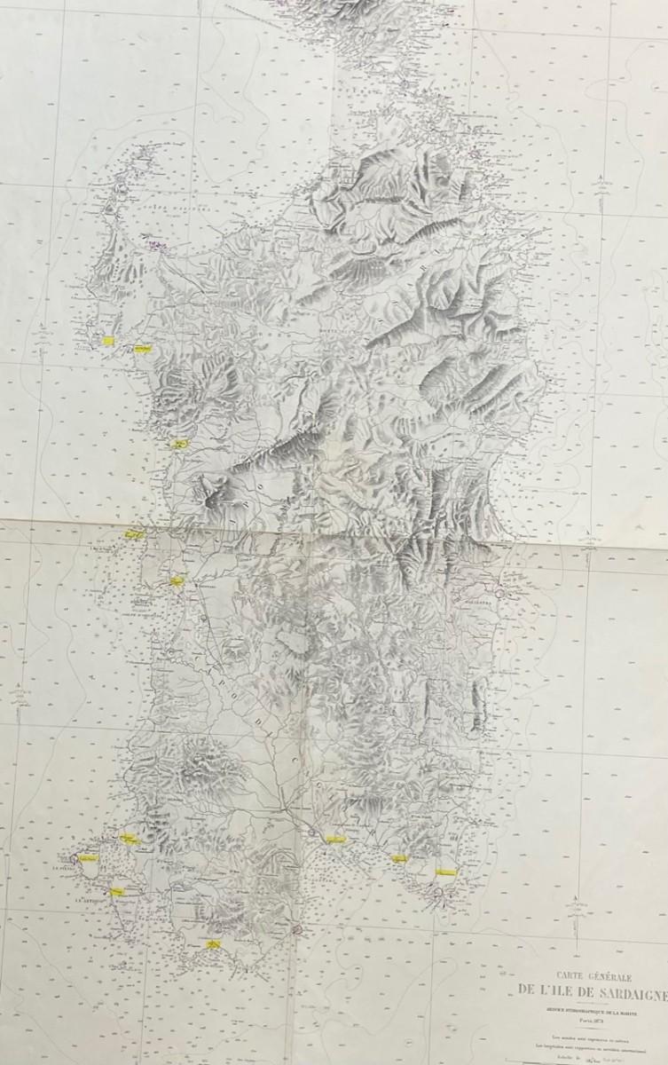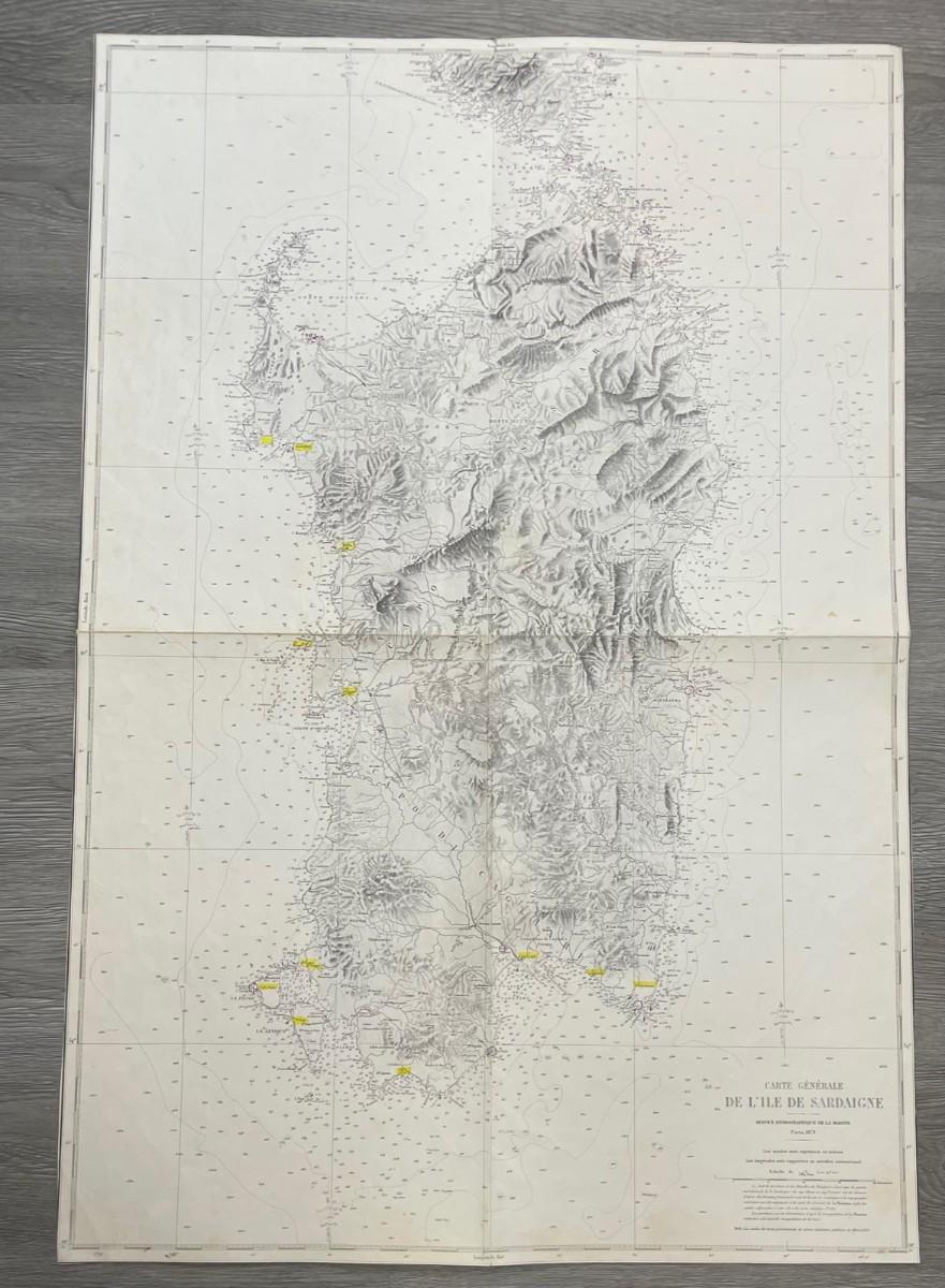 Description: CARTE GENERALE DE L' ILE DE SARDAIGNE / SERVICE HYDROGRAPHIQUE DE LA MARINE PARIS 1889 / Reproduction. Material: Paper Measurement approximate: 29" x 21” (Inches) Condition: Good